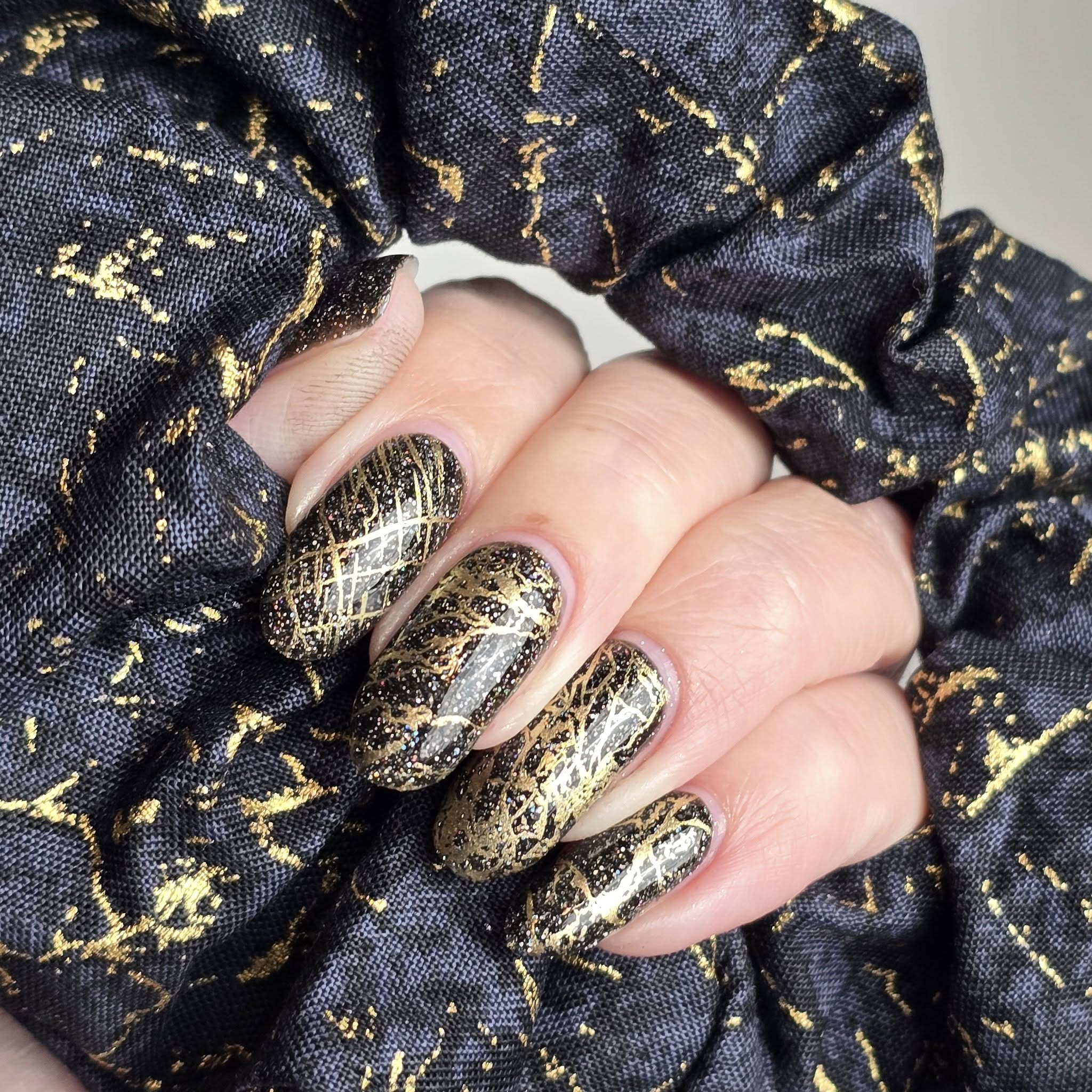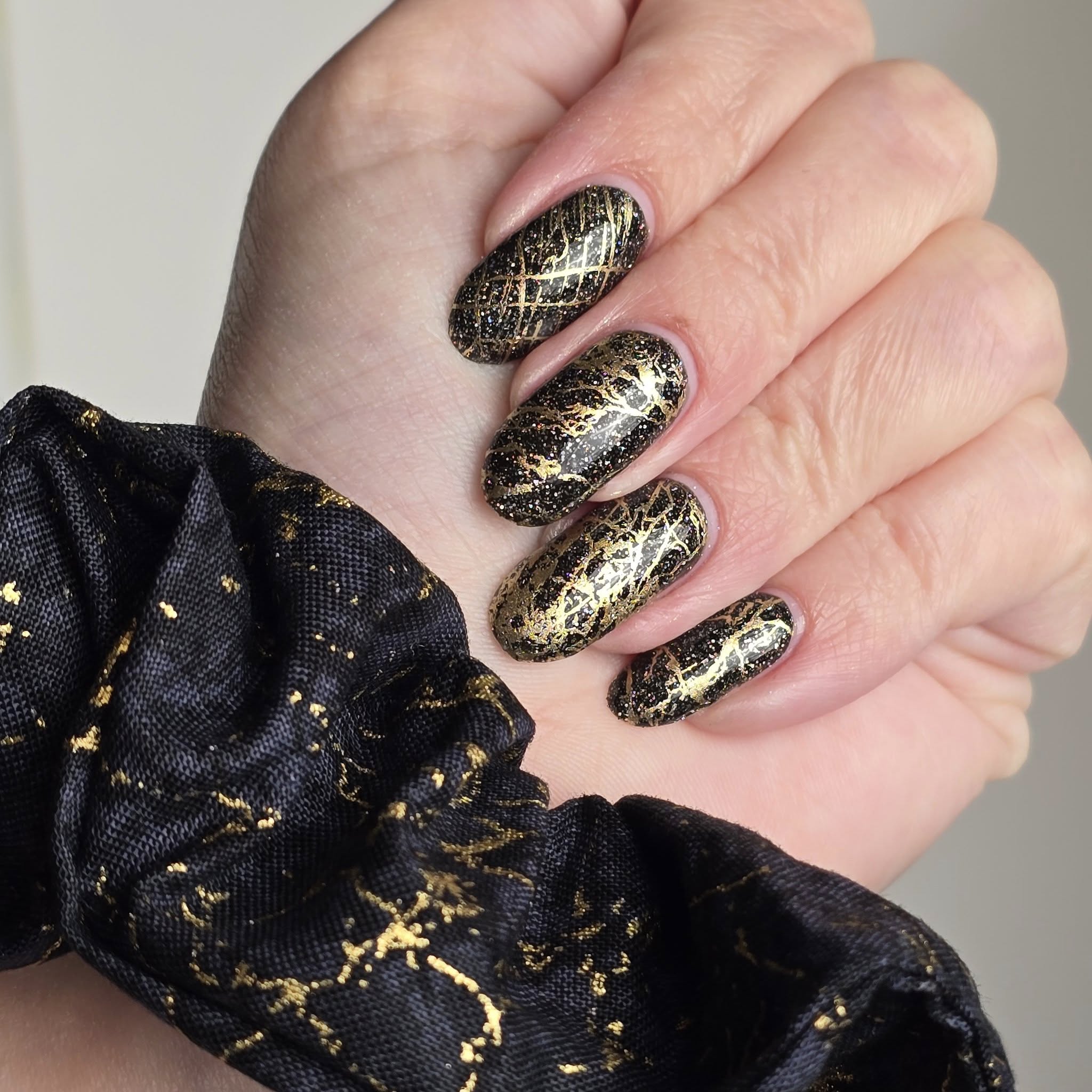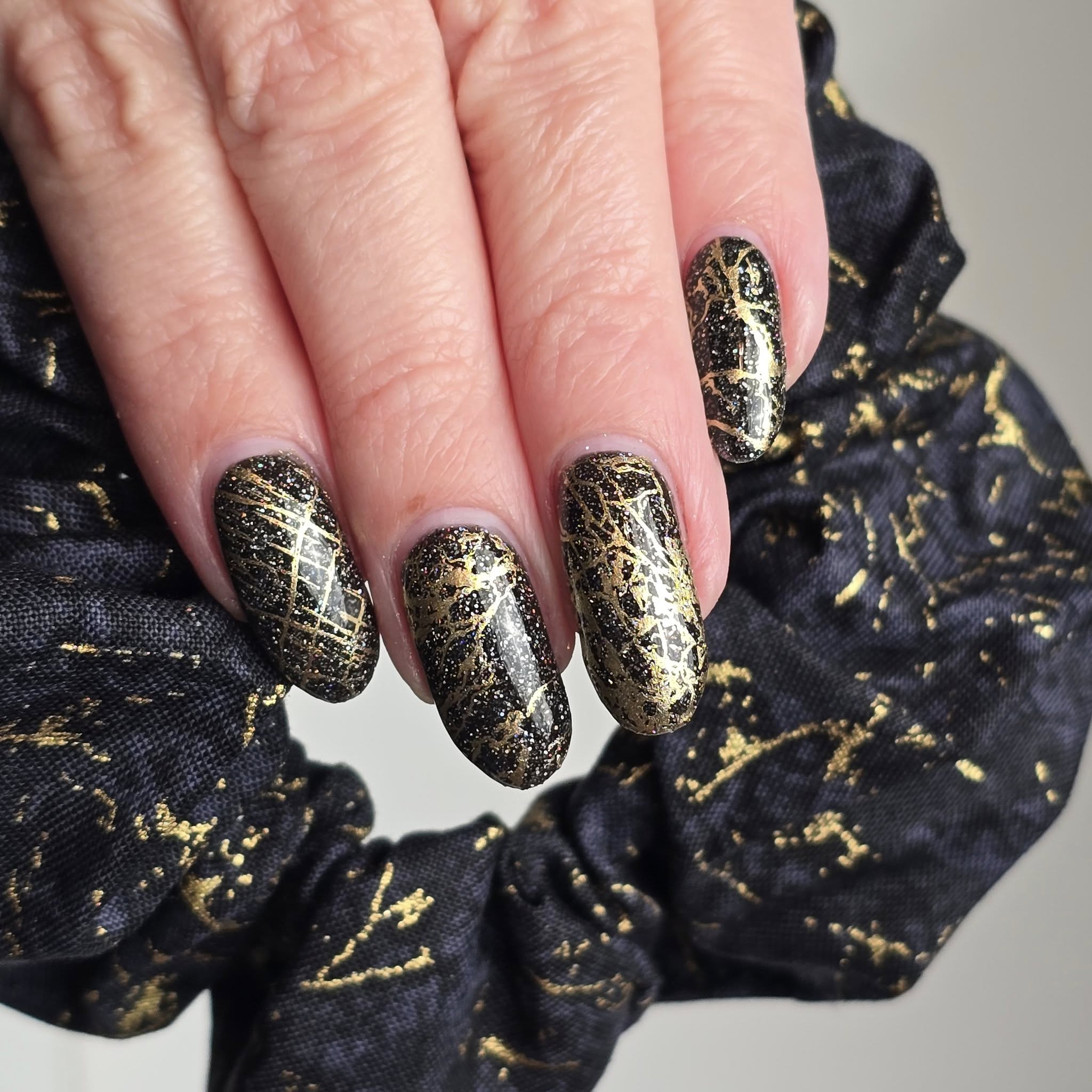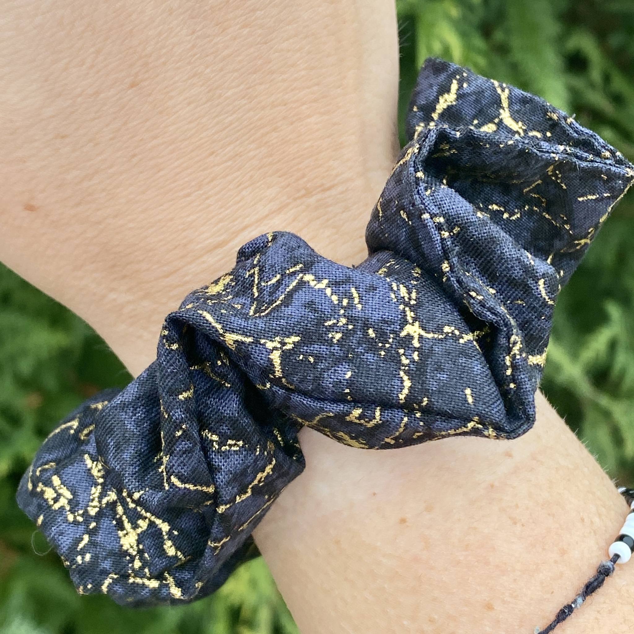 Scrunchie+ Description - black background with shimmering gold vein-like accents