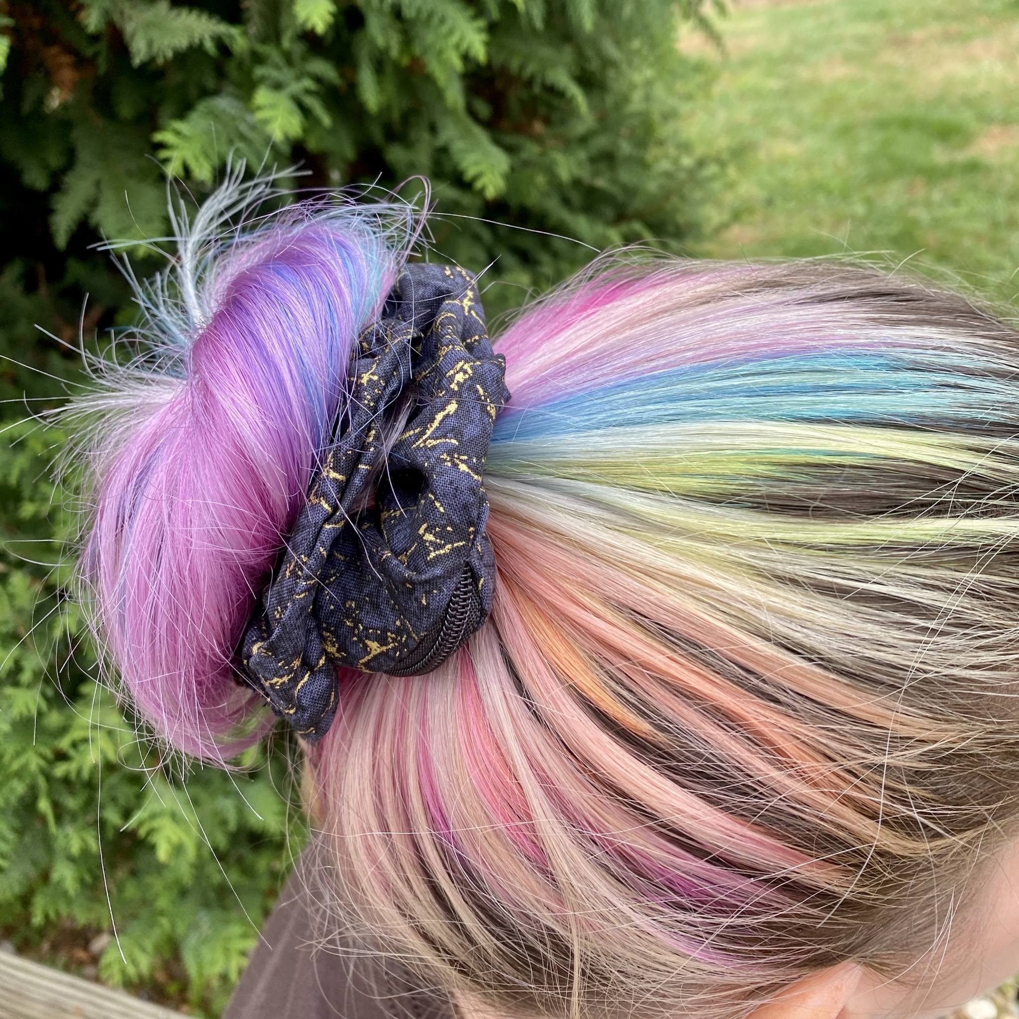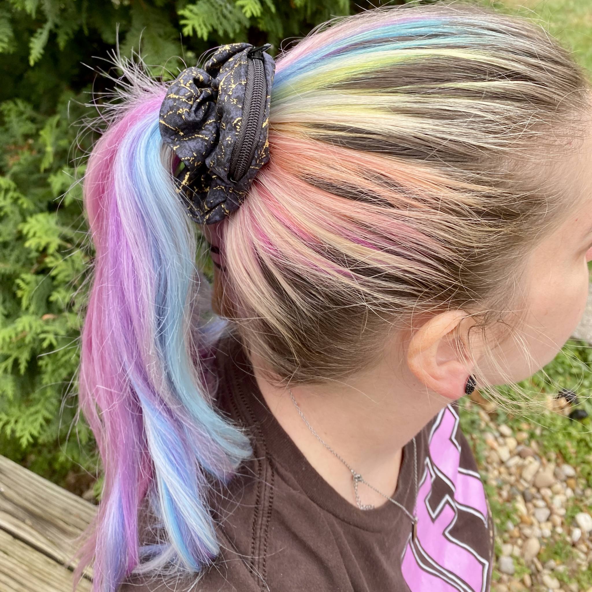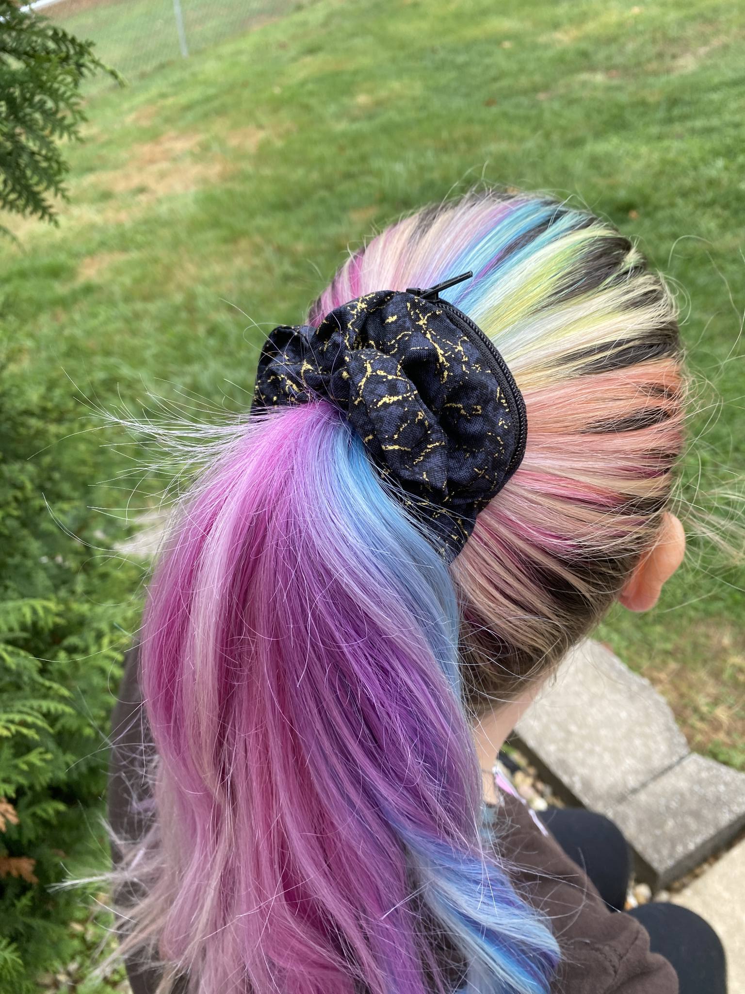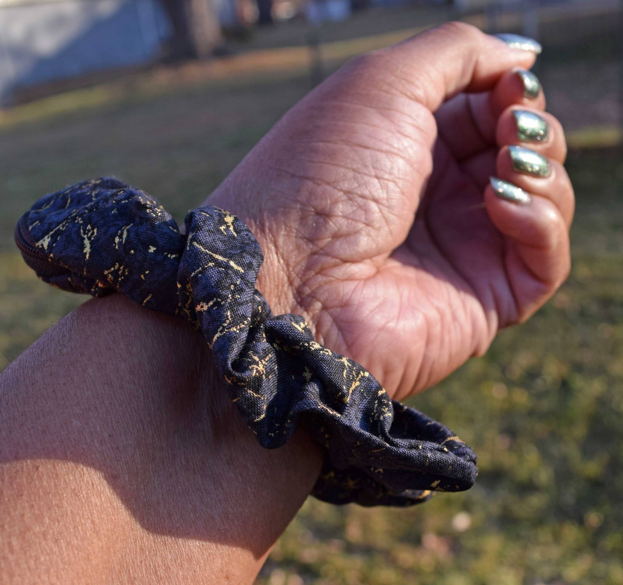 Scrunchie+ Description - black background with shimmering gold vein-like accents