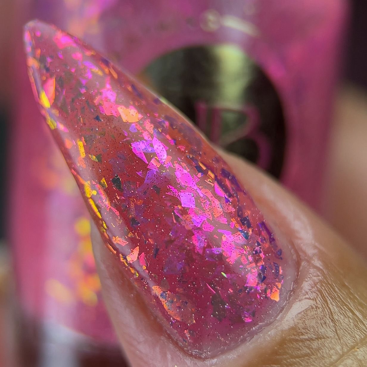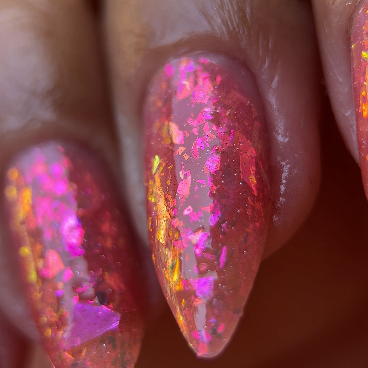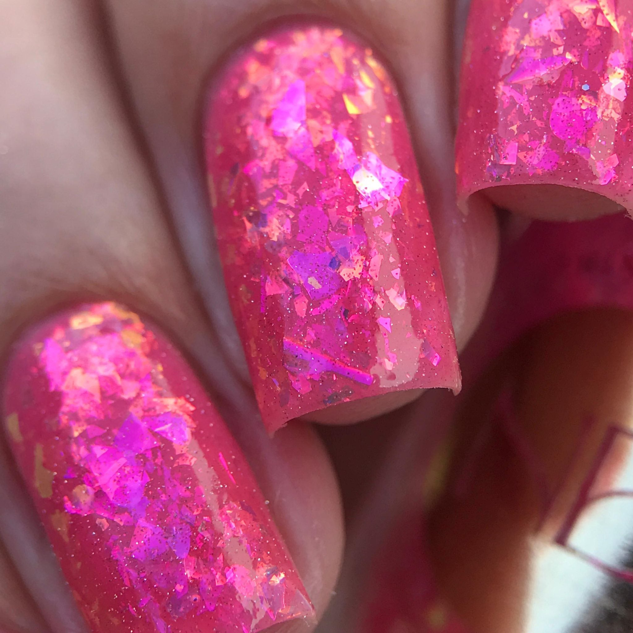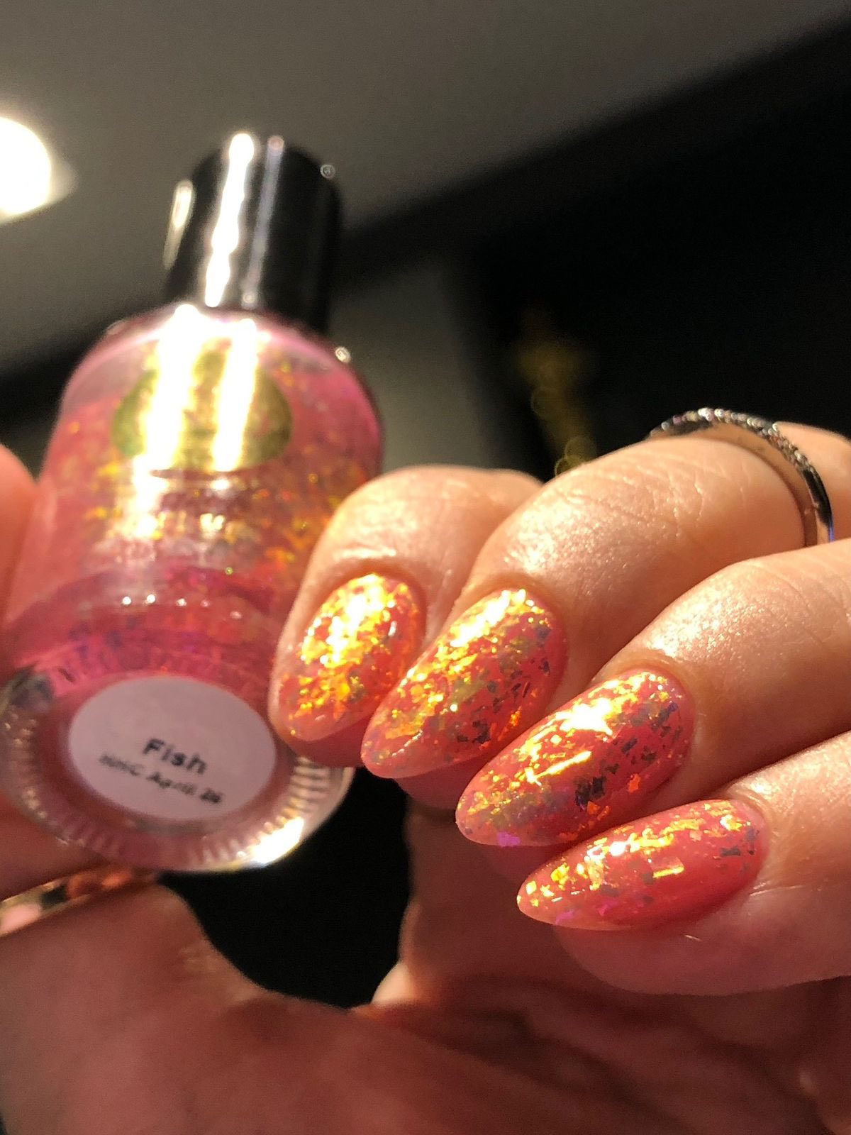 "Fish" has a neon pink jelly base with pink/orange/yellow iridescent flakie and silver reflective glitter.