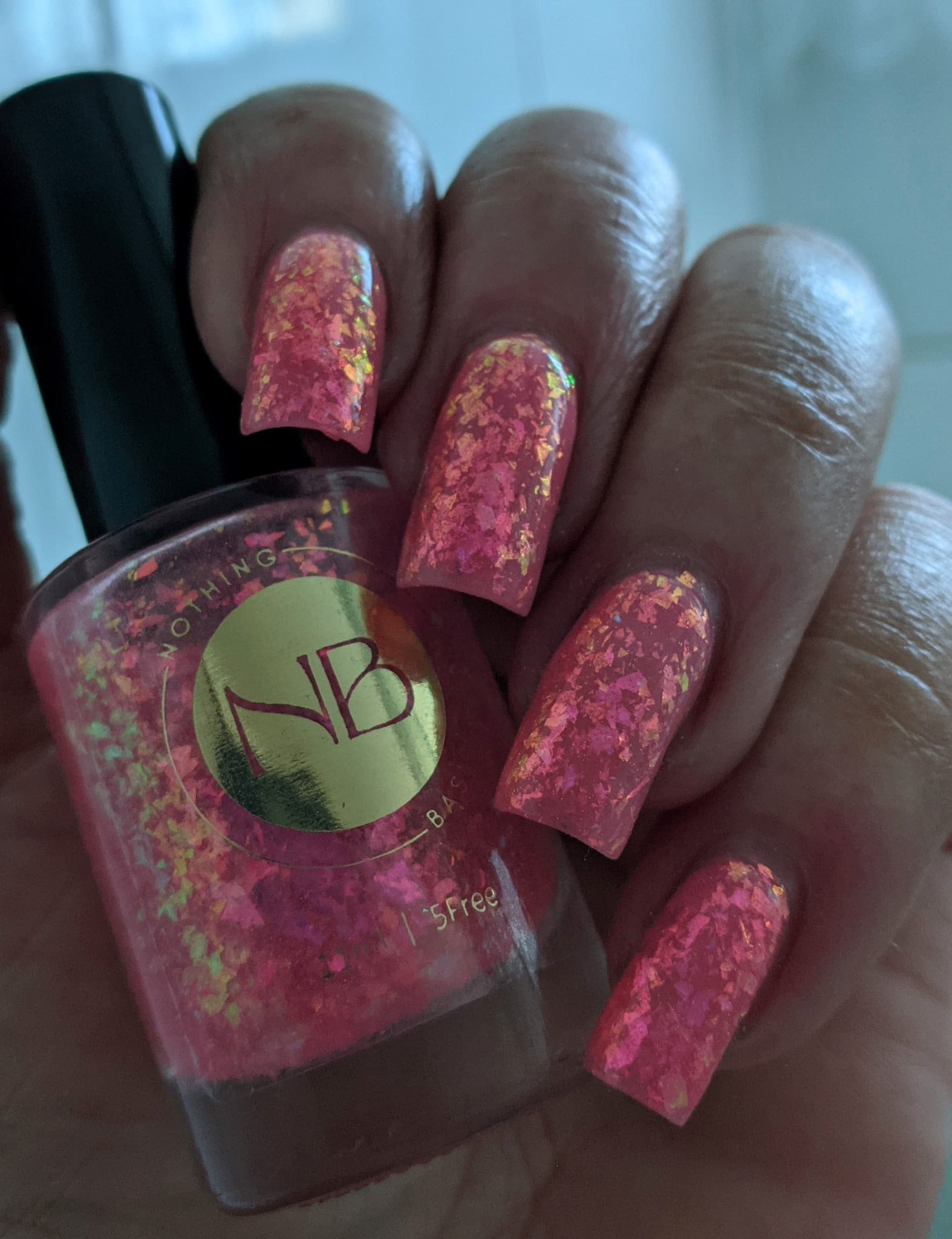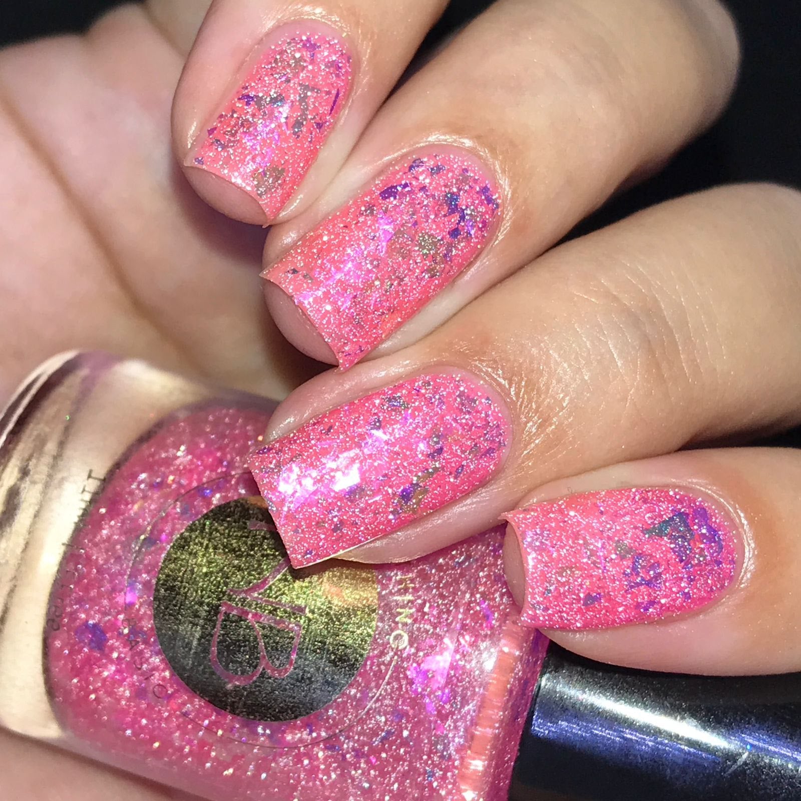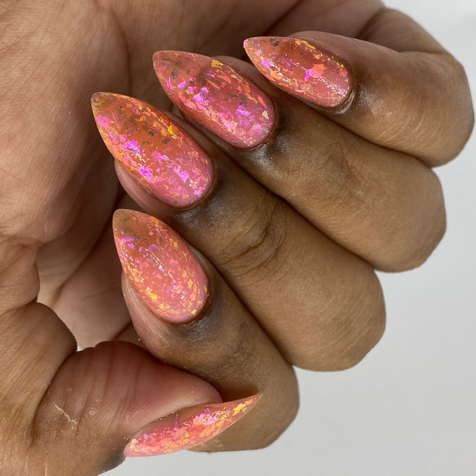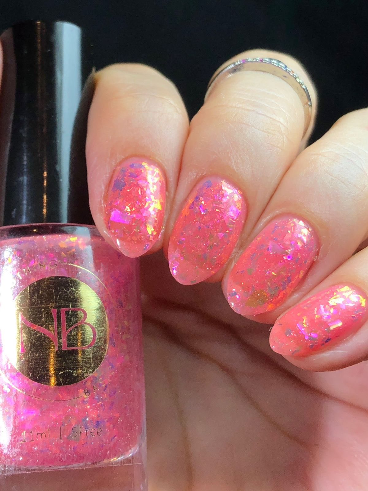 "Fish" has a neon pink jelly base with pink/orange/yellow iridescent flakie and silver reflective glitter.