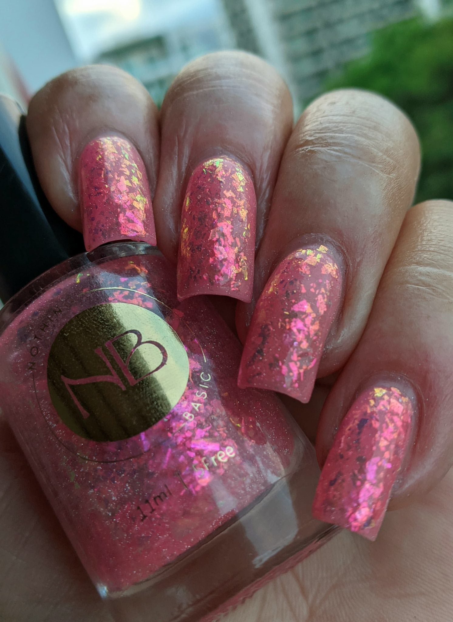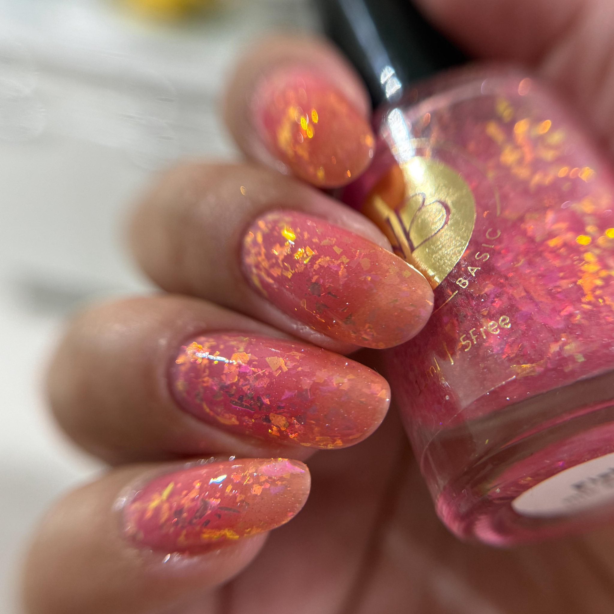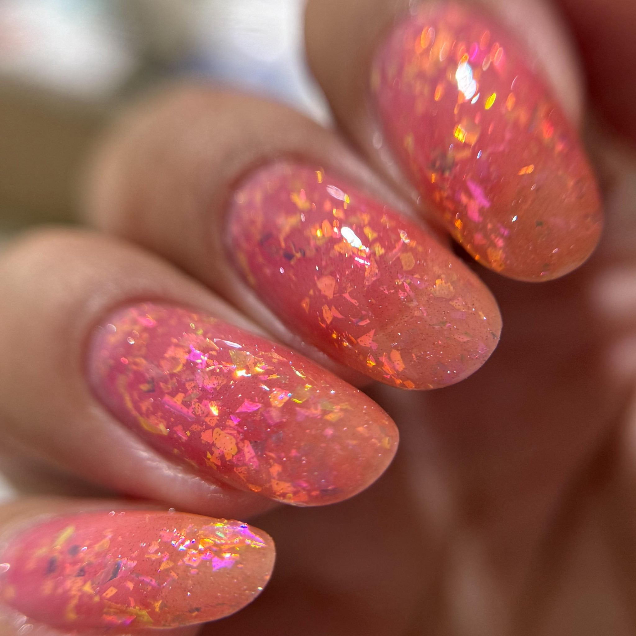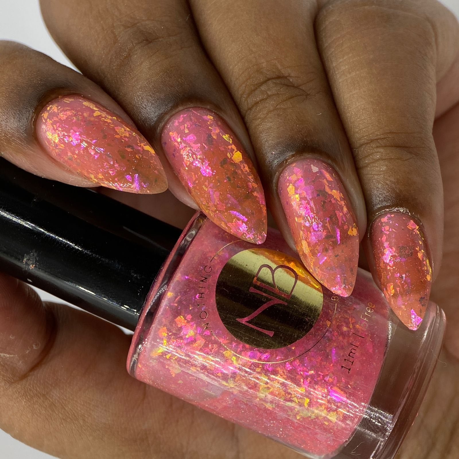 "Fish" has a neon pink jelly base with pink/orange/yellow iridescent flakie and silver reflective glitter.