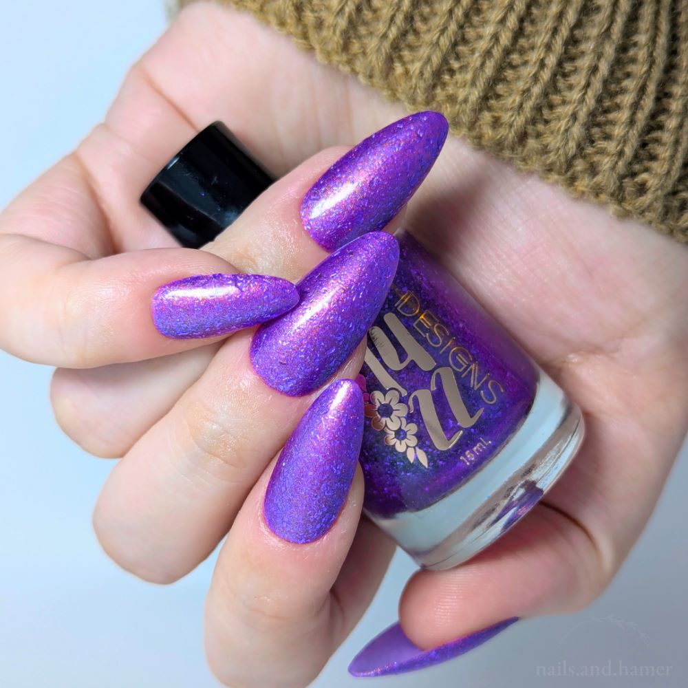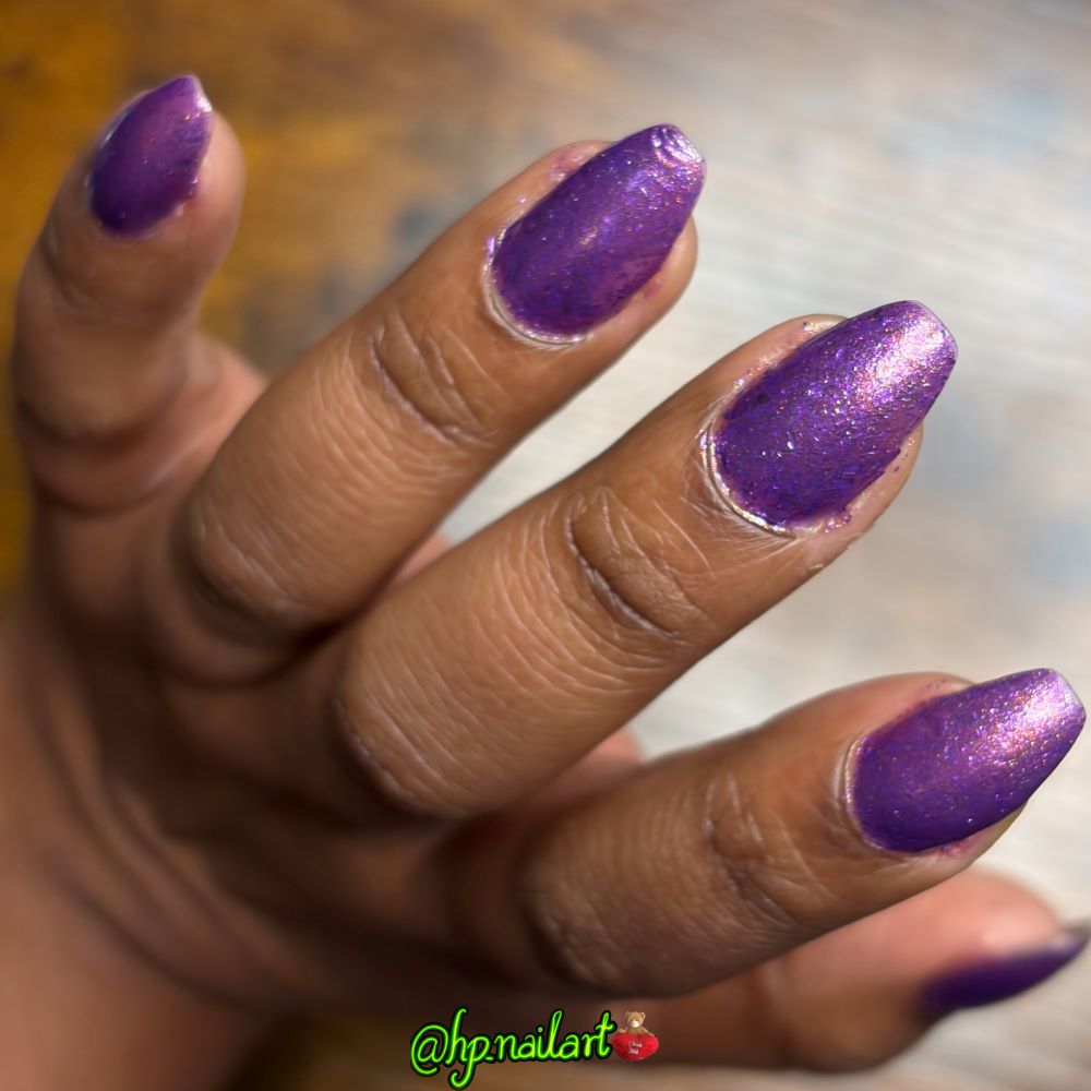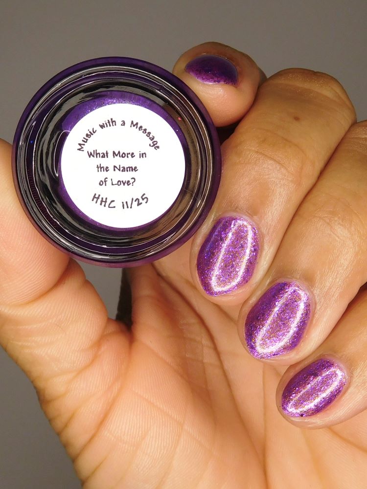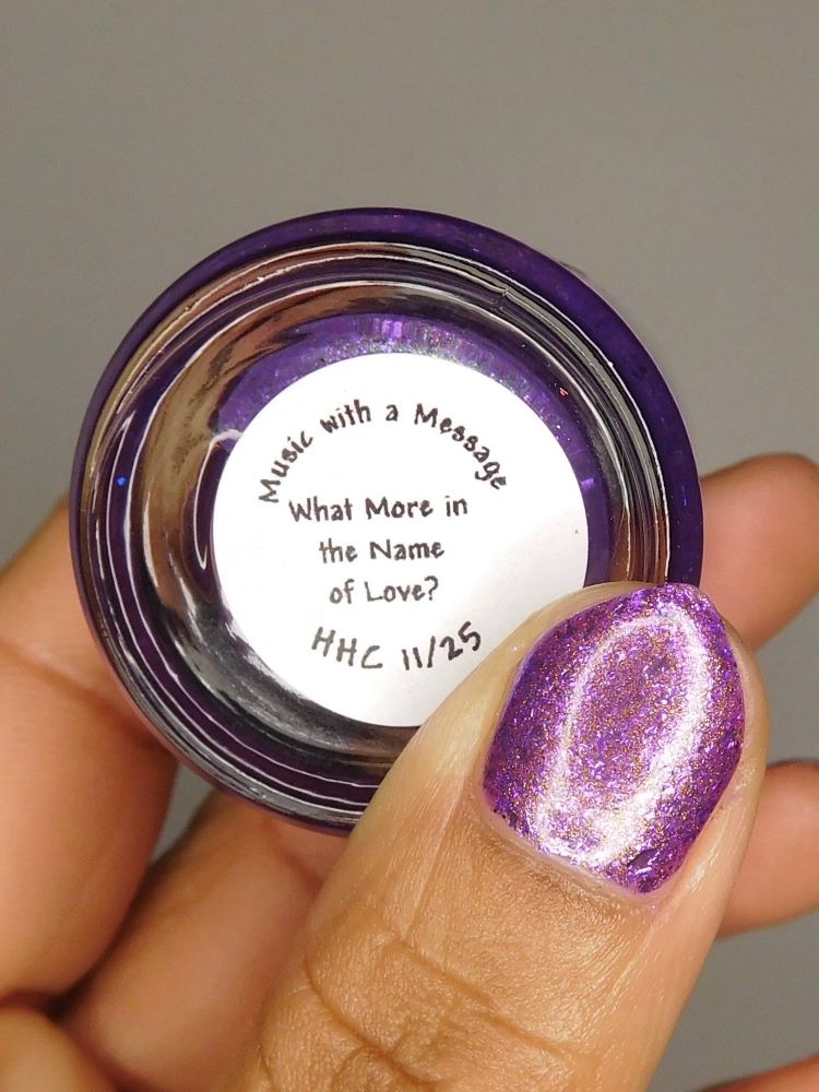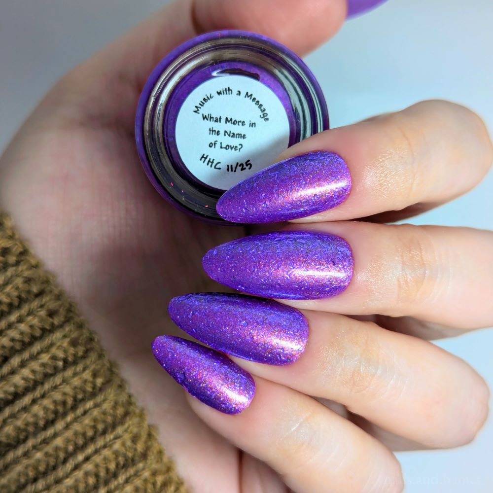 "What More in the Name of Love" has a bright violet base with green-yellow-orange shifting shimmer and purple metallic flakes.