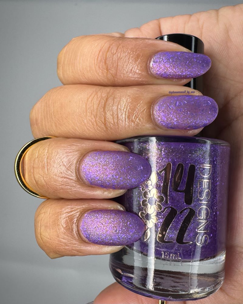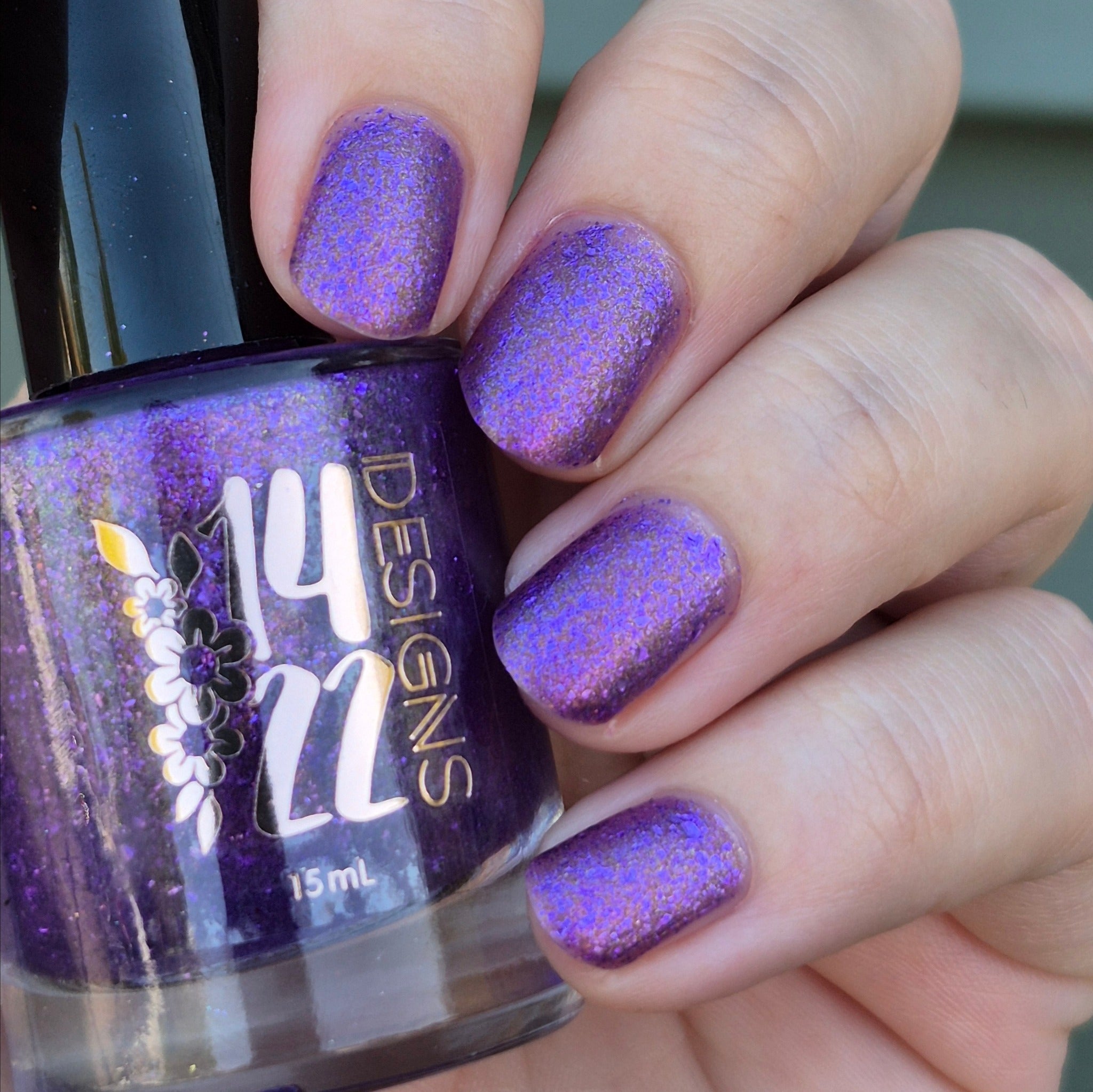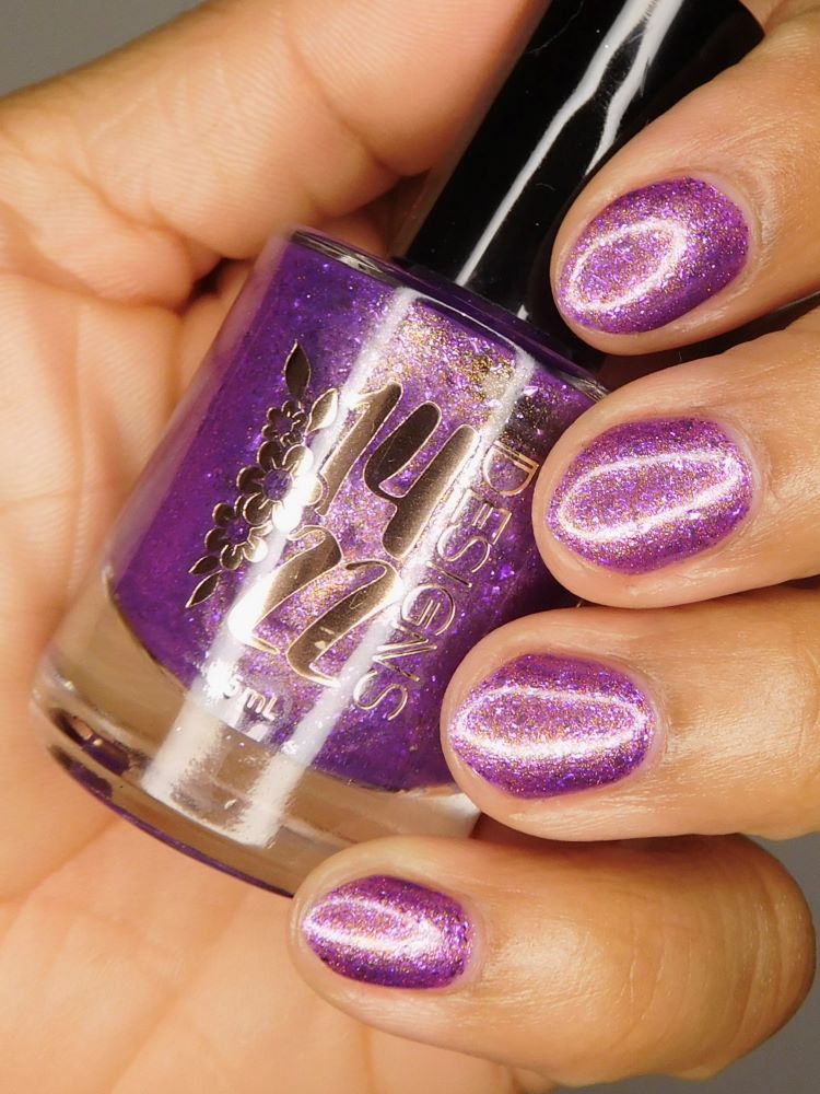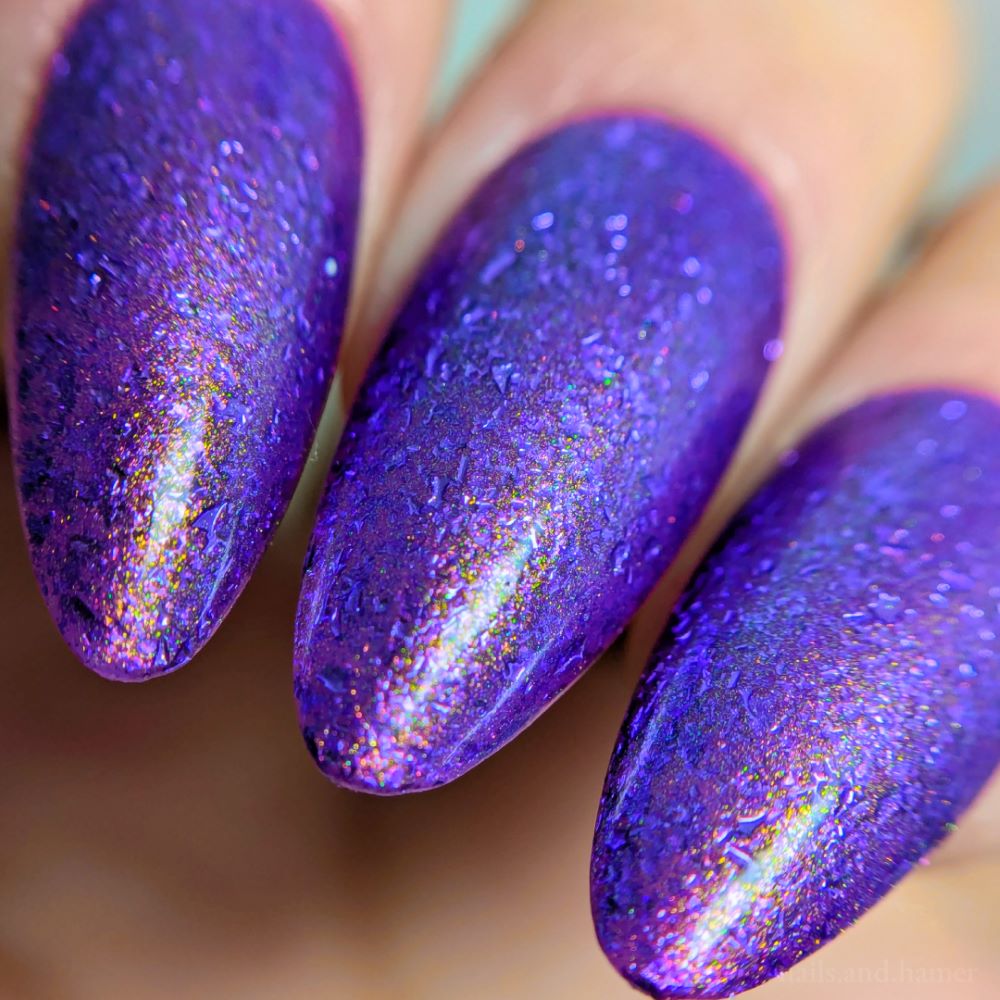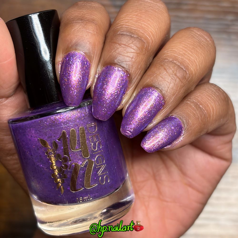 "What More in the Name of Love" has a bright violet base with green-yellow-orange shifting shimmer and purple metallic flakes.