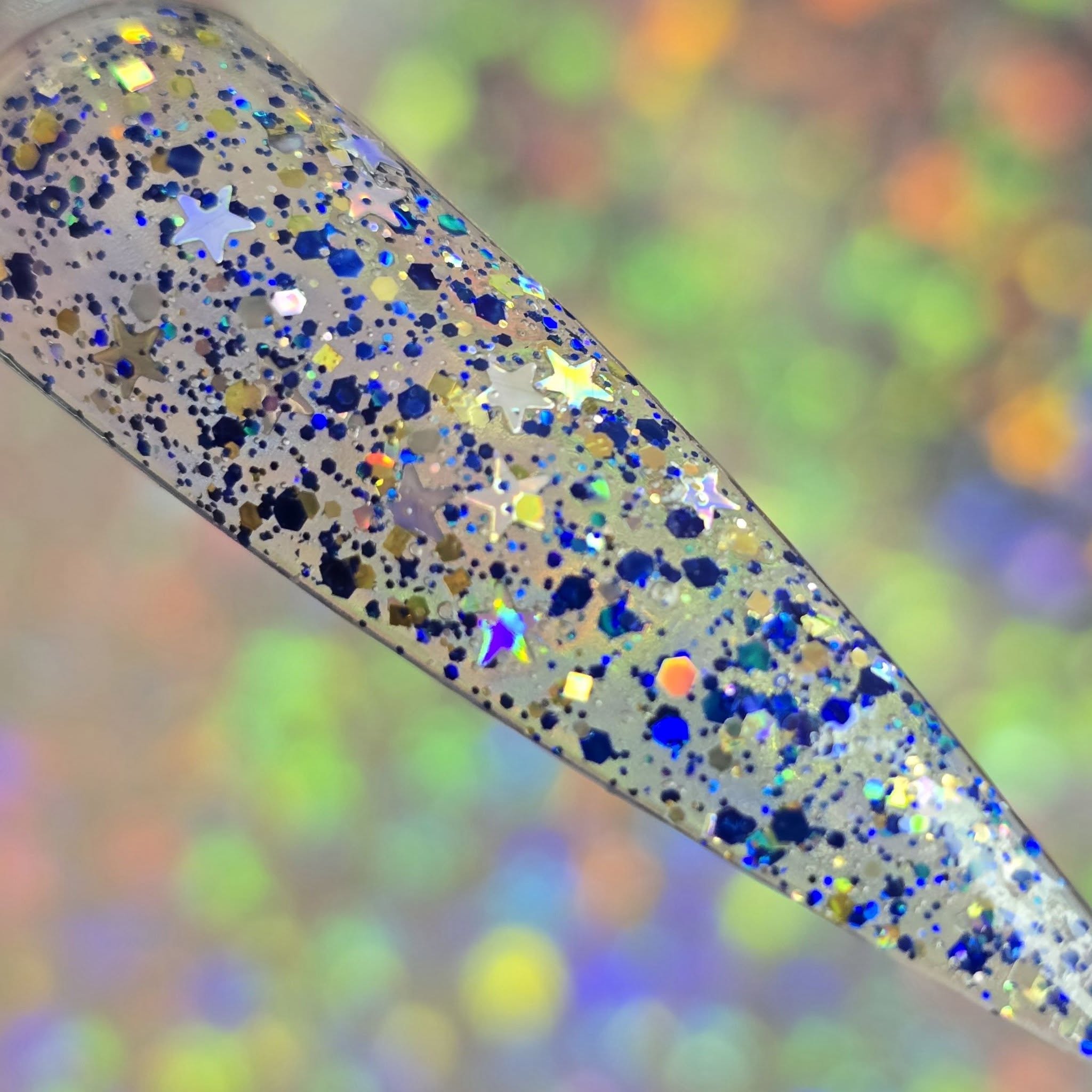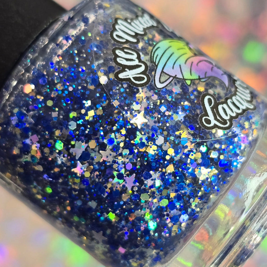 "Calm Before the Storm" is a glitter topper filled with navy blue, silver, and star shaped holographic glitters.