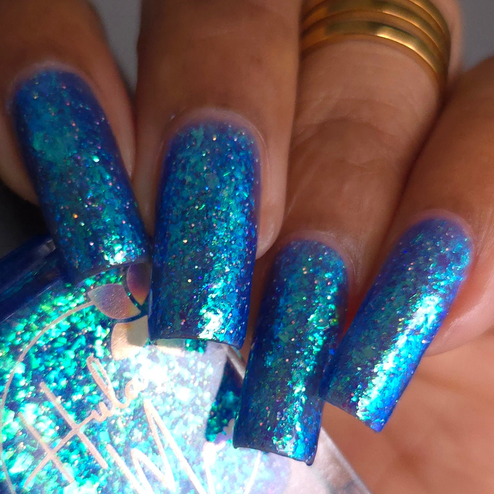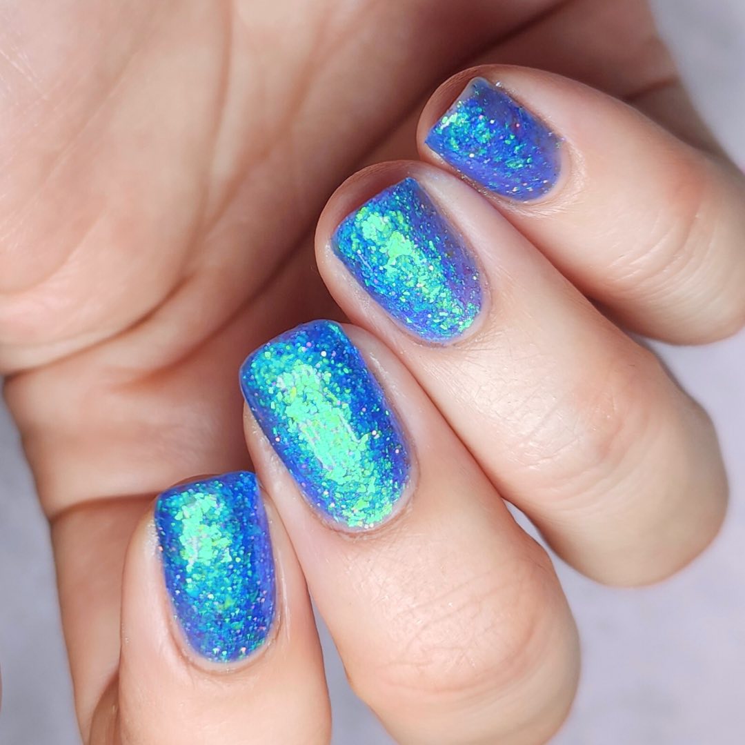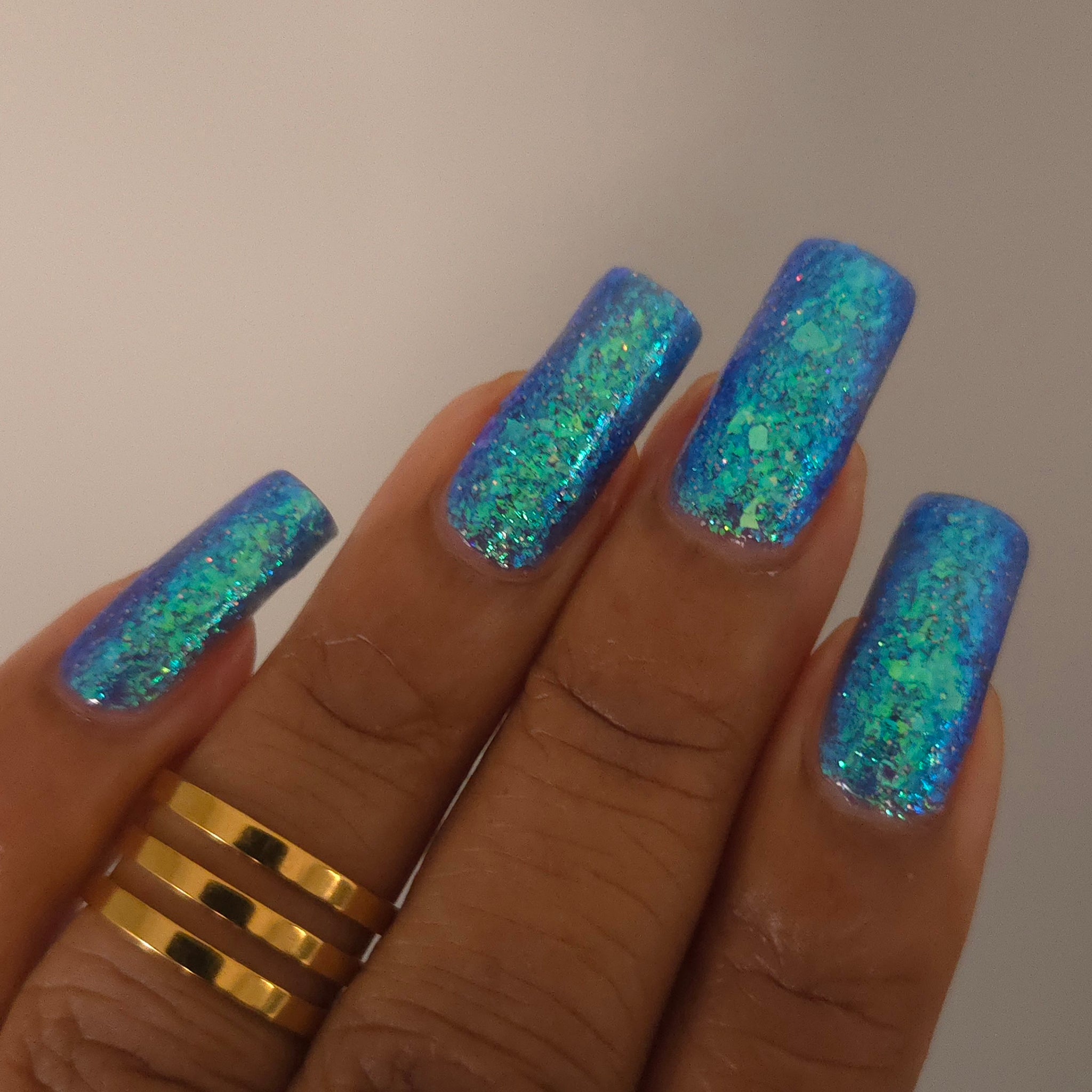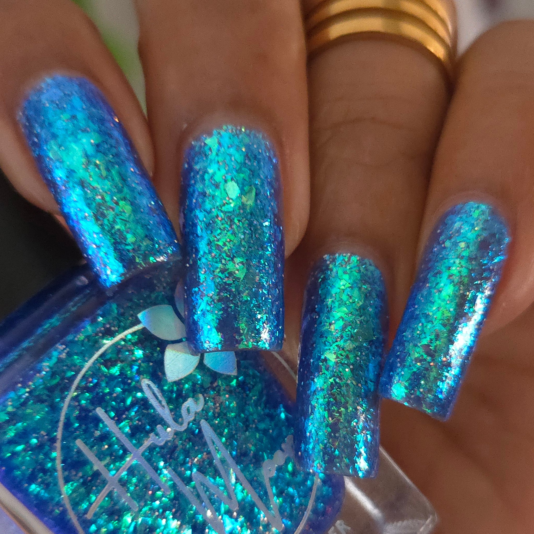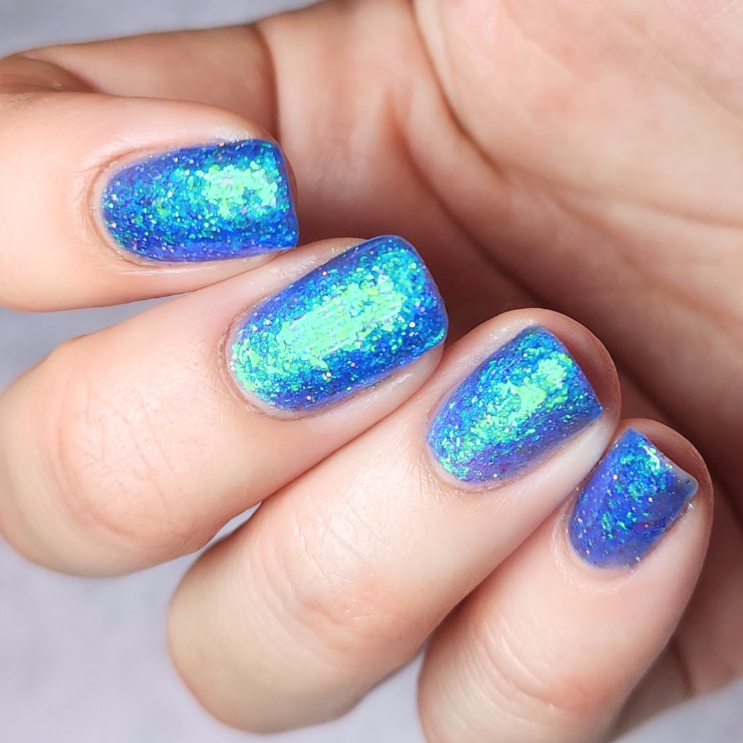 "One Love" has a Carribean blue base color with iridescent flakes that shift between blue, green and aqua. Holographic sparks that catch light like that’s reminiscent of the sun playing off the ocean.