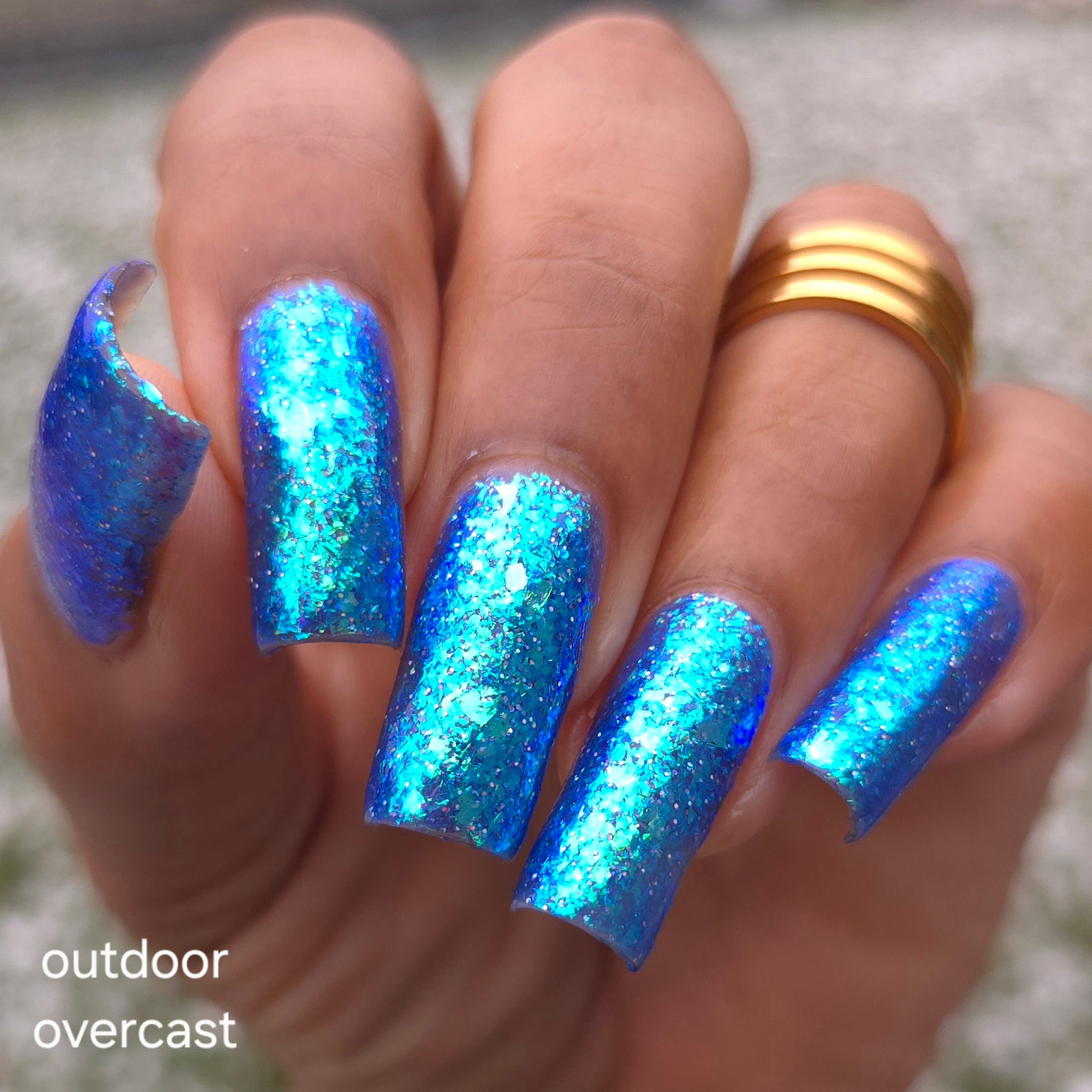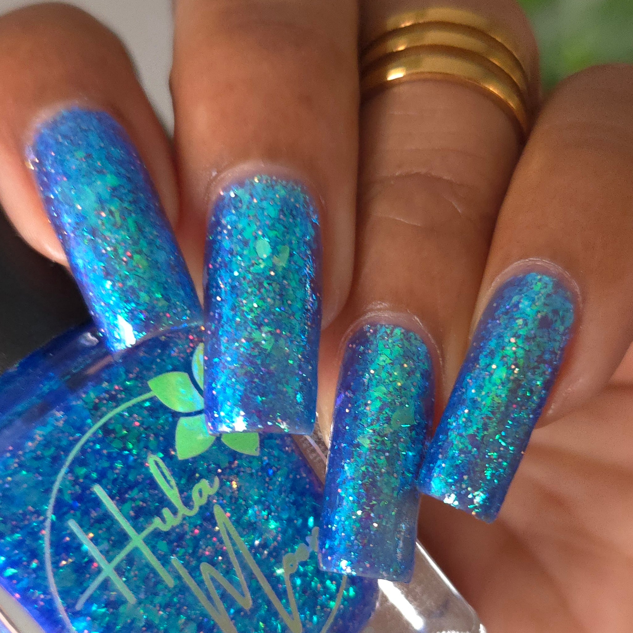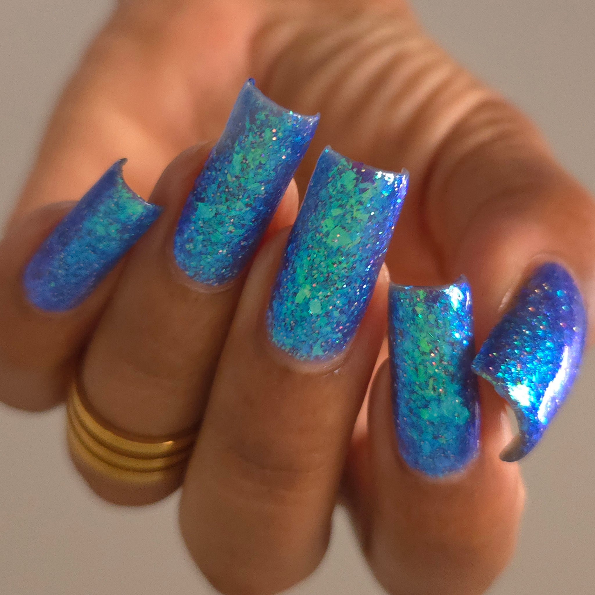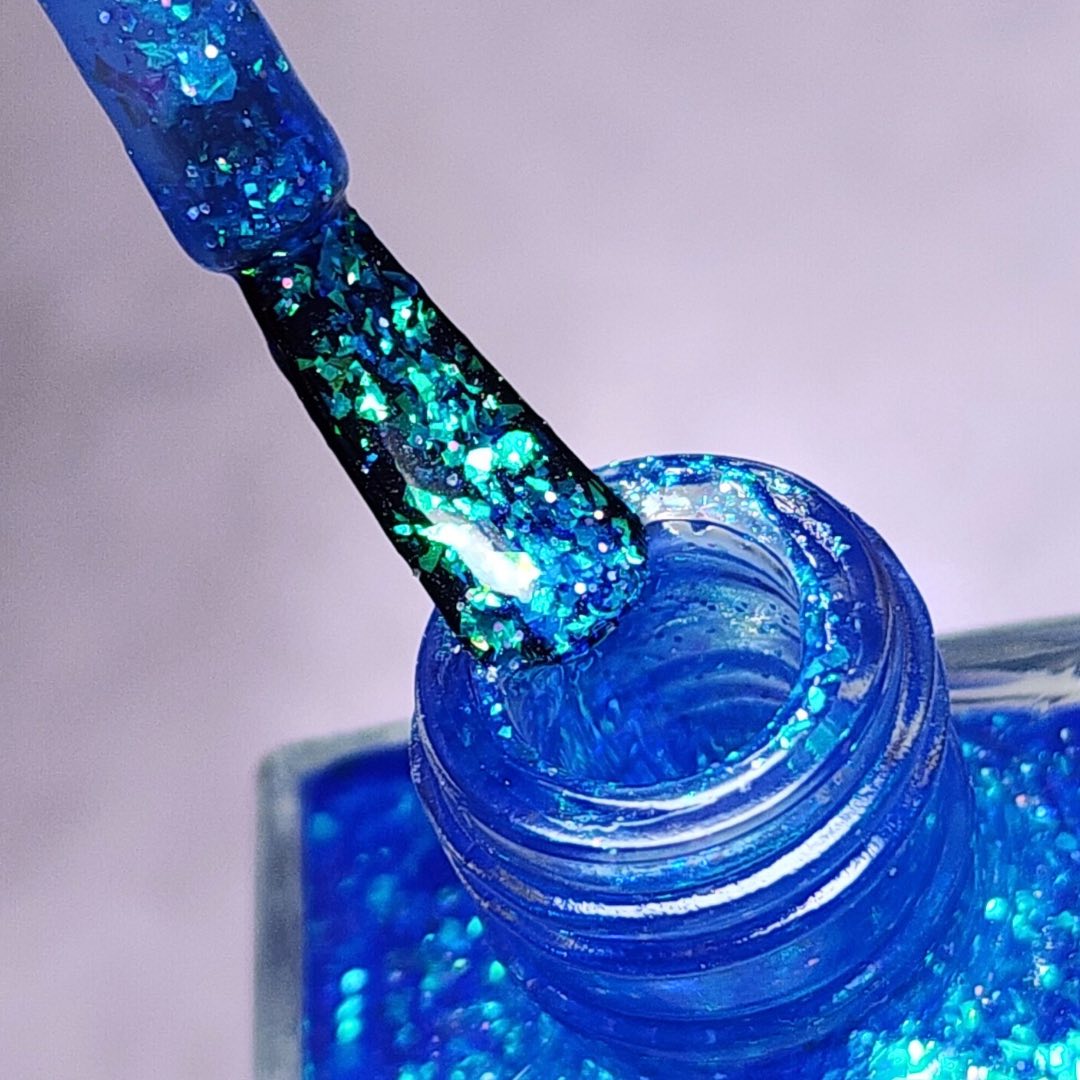 "One Love" has a Carribean blue base color with iridescent flakes that shift between blue, green and aqua. Holographic sparks that catch light like that’s reminiscent of the sun playing off the ocean.
