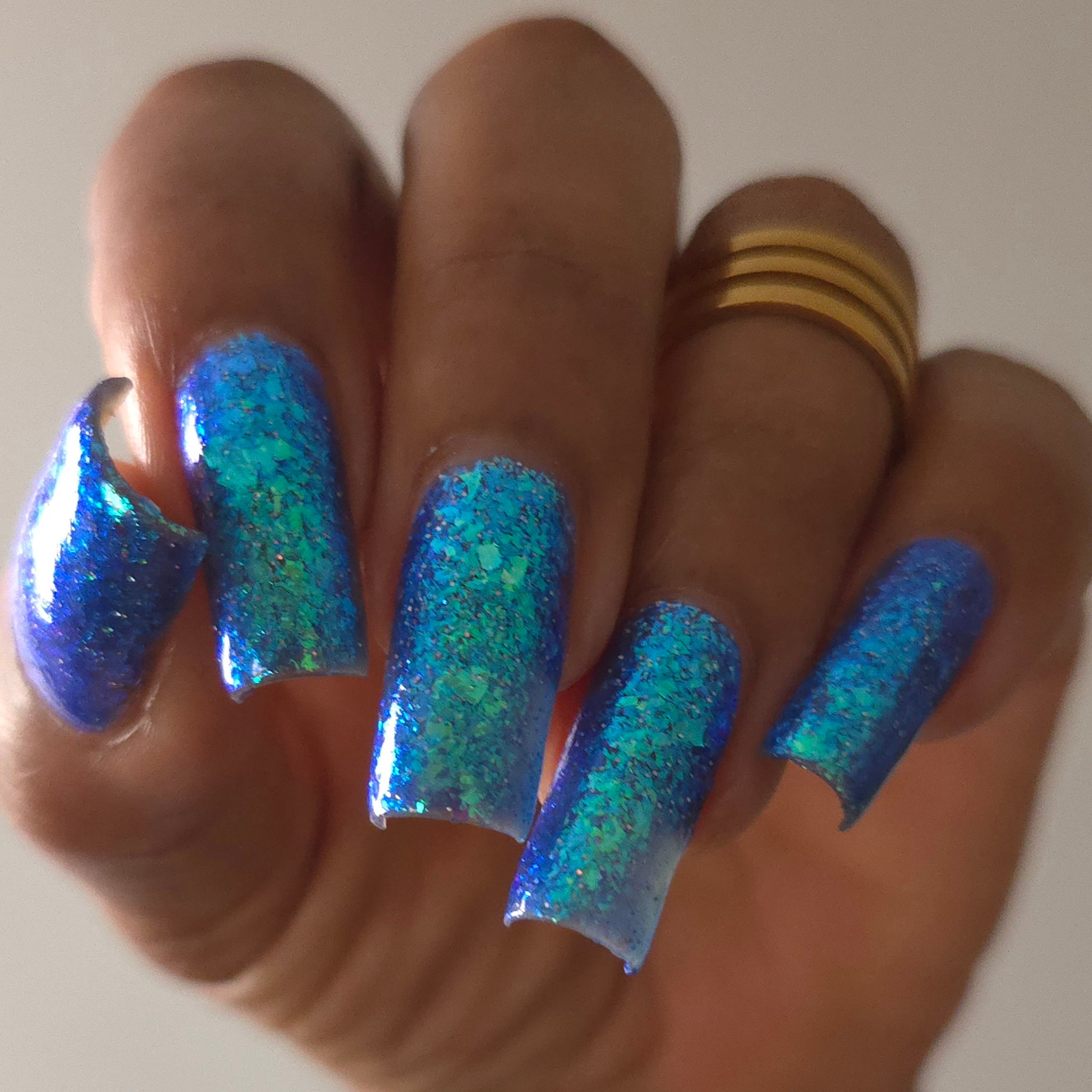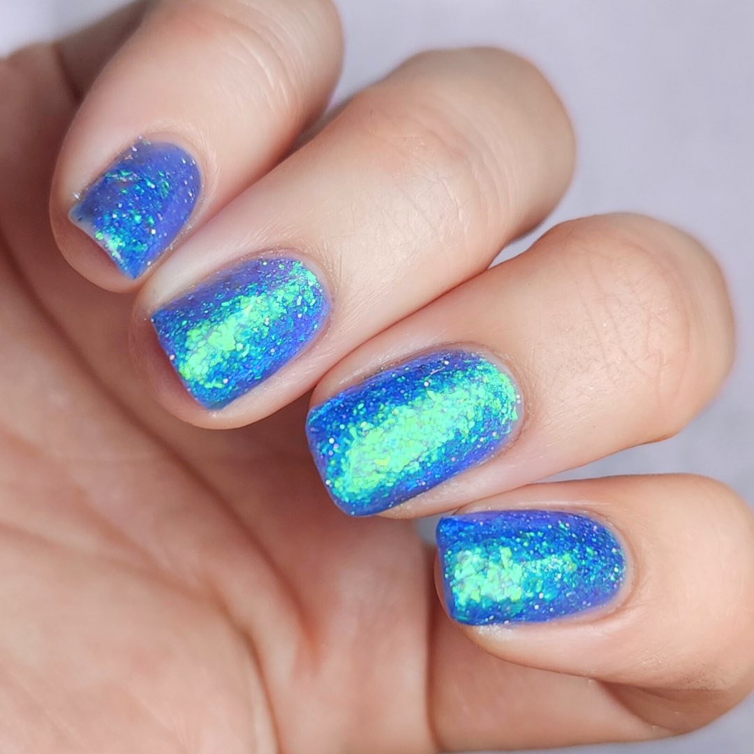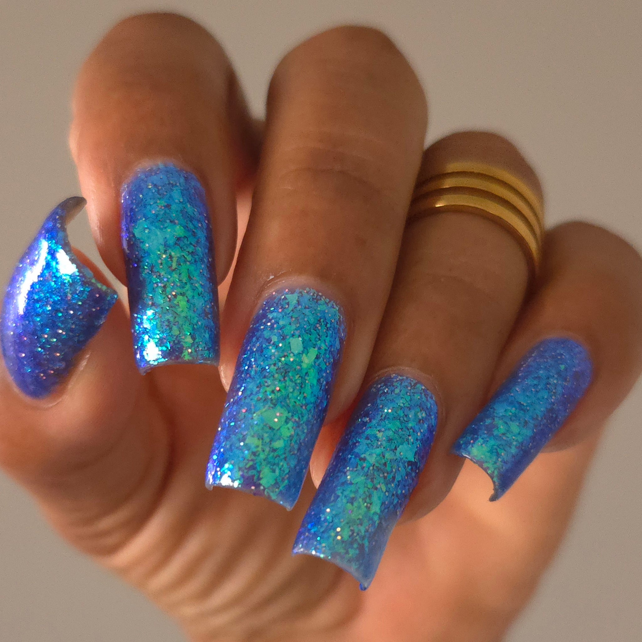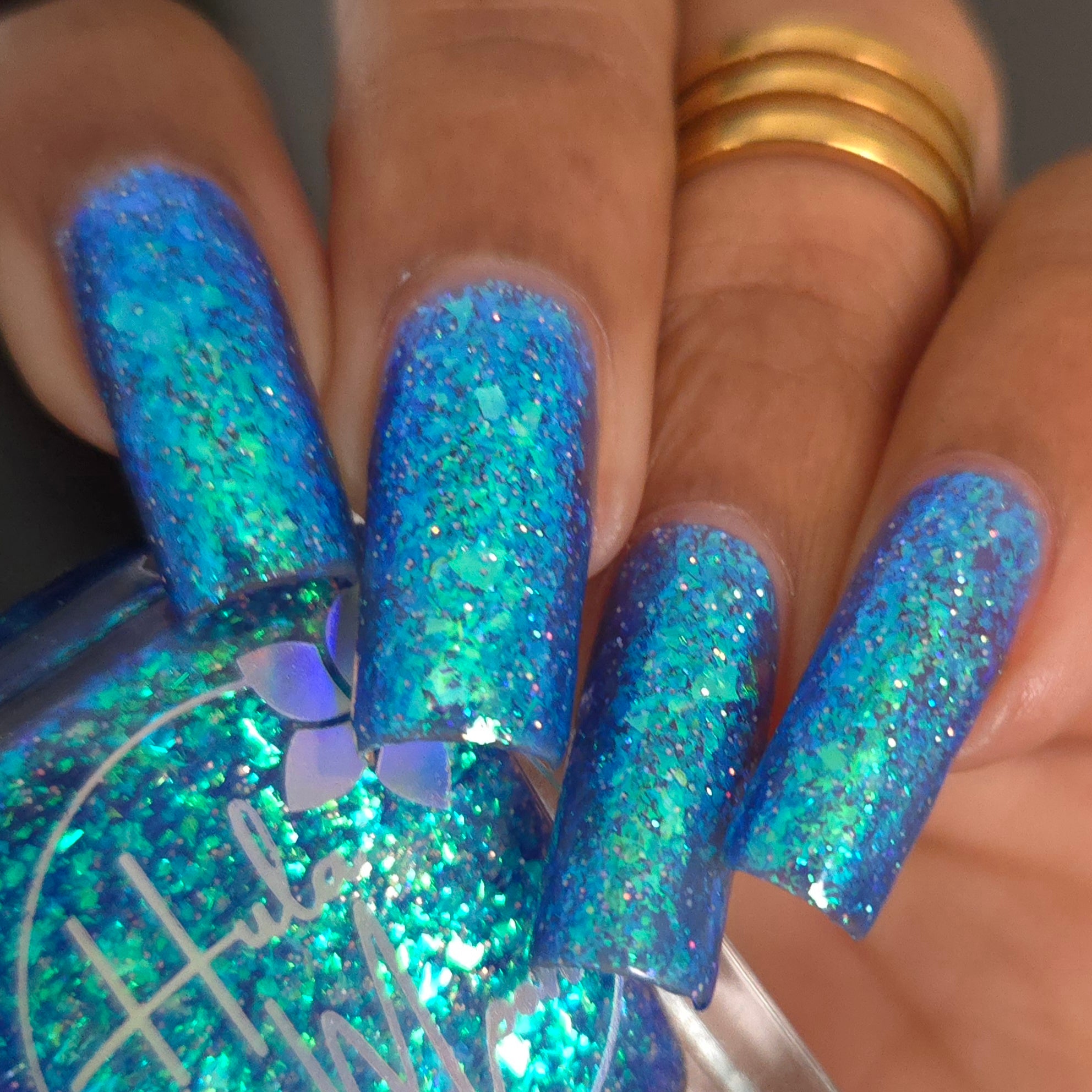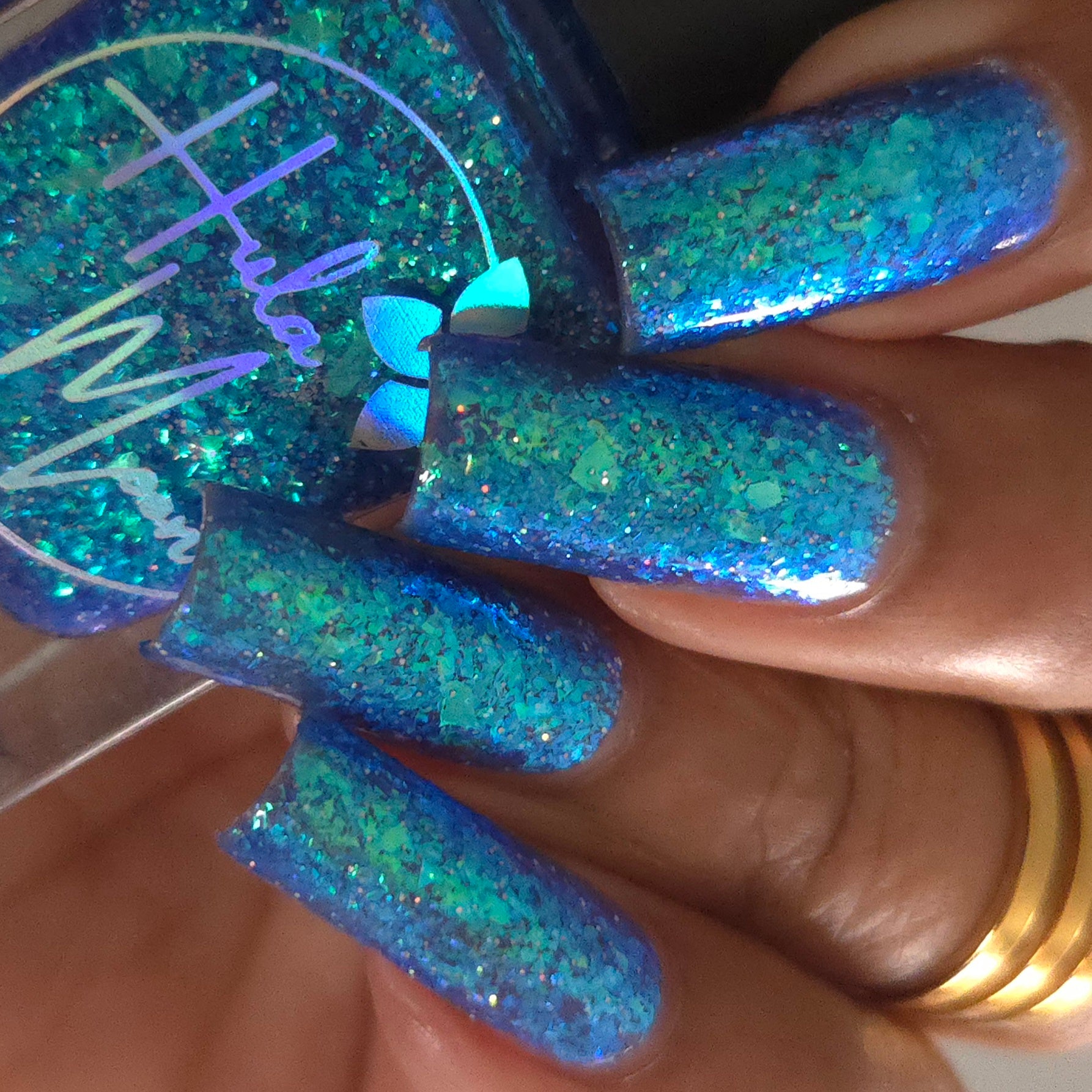 "One Love" has a Carribean blue base color with iridescent flakes that shift between blue, green and aqua. Holographic sparks that catch light like that’s reminiscent of the sun playing off the ocean.