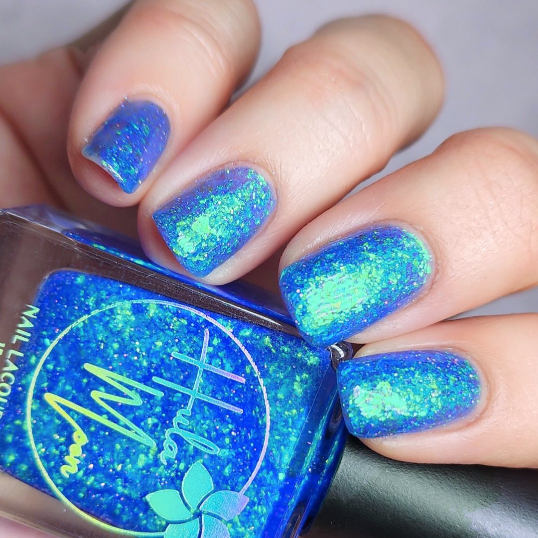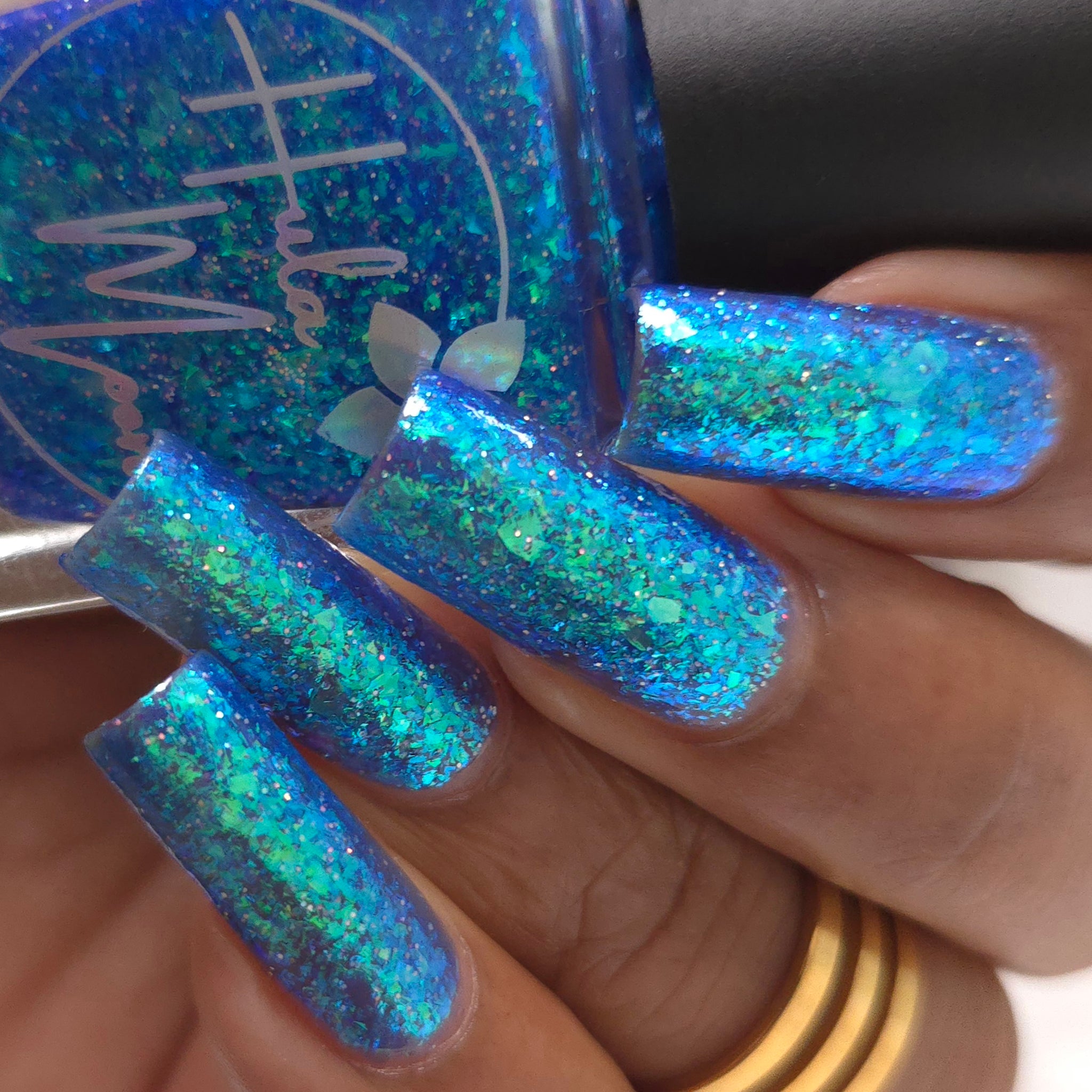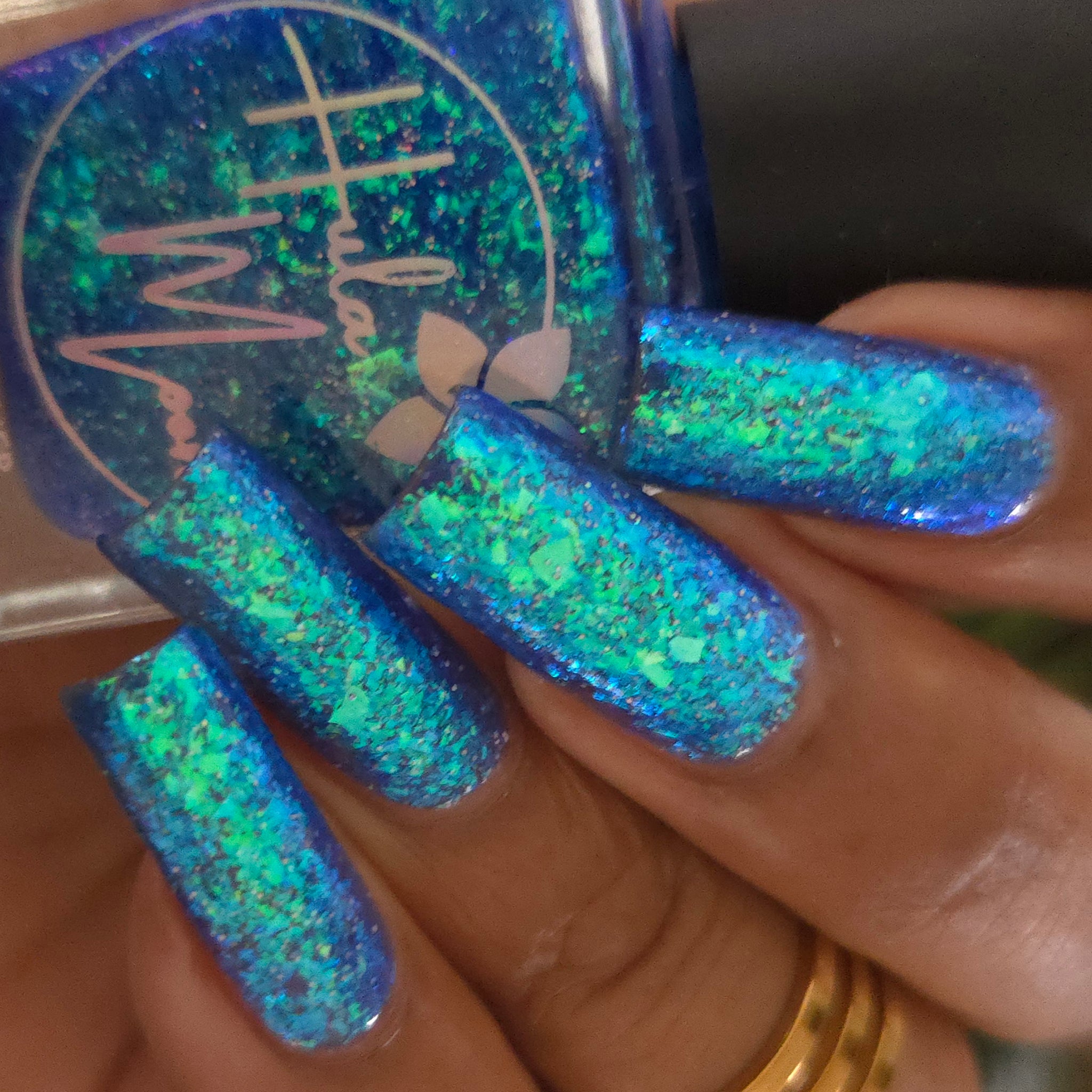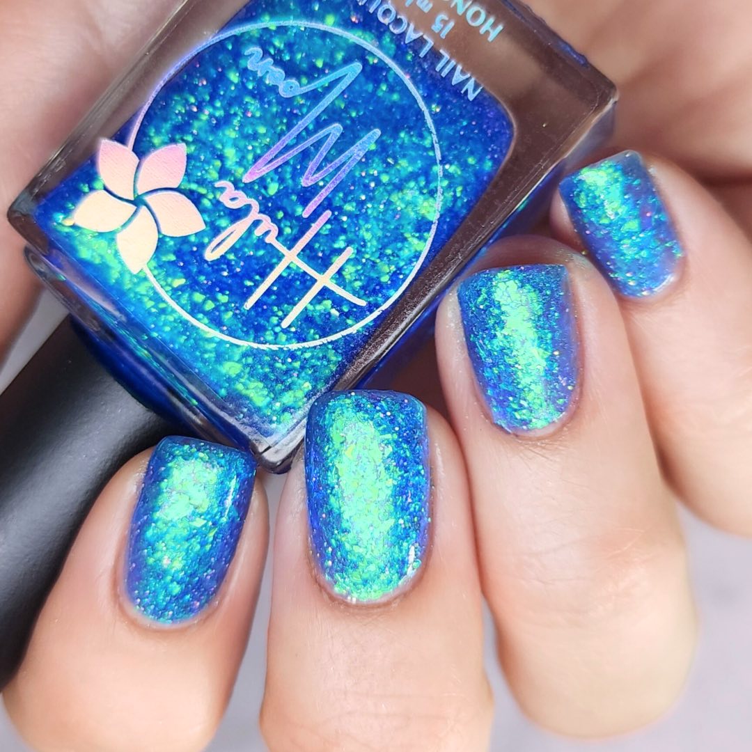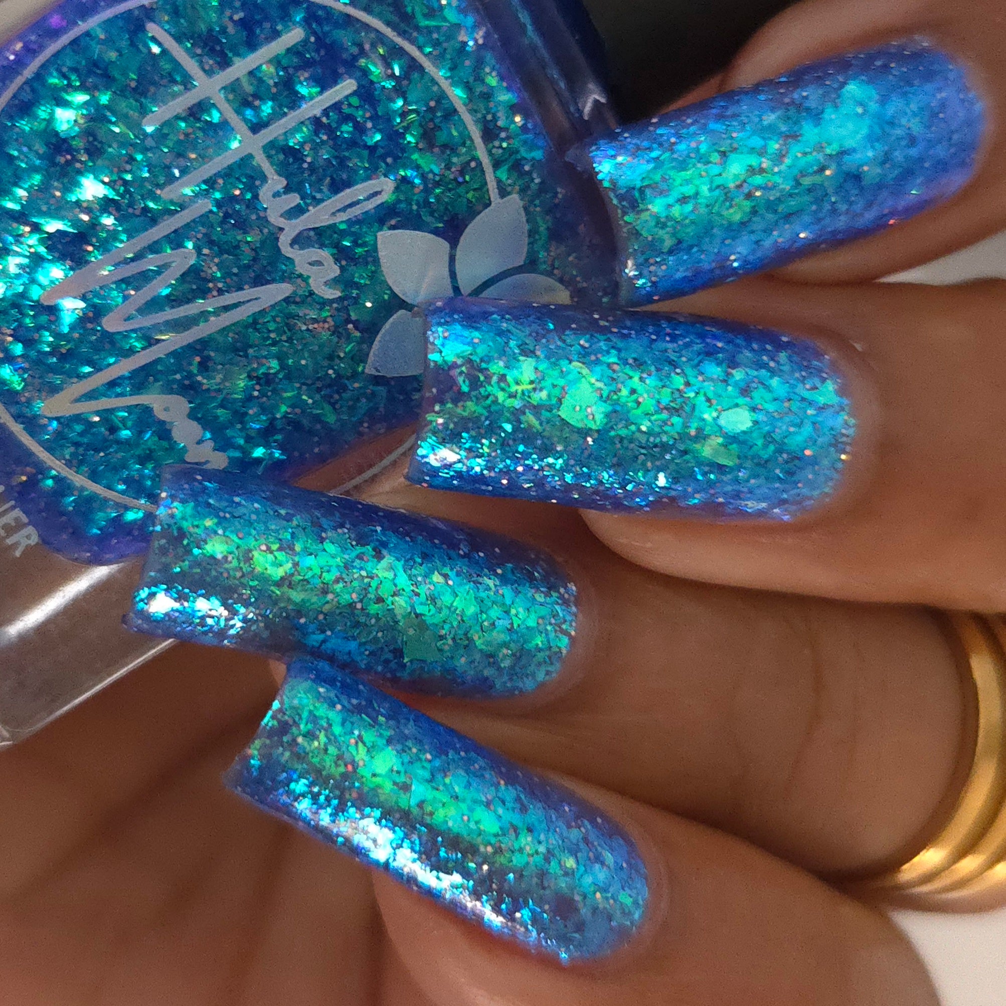 "One Love" has a Carribean blue base color with iridescent flakes that shift between blue, green and aqua. Holographic sparks that catch light like that’s reminiscent of the sun playing off the ocean.