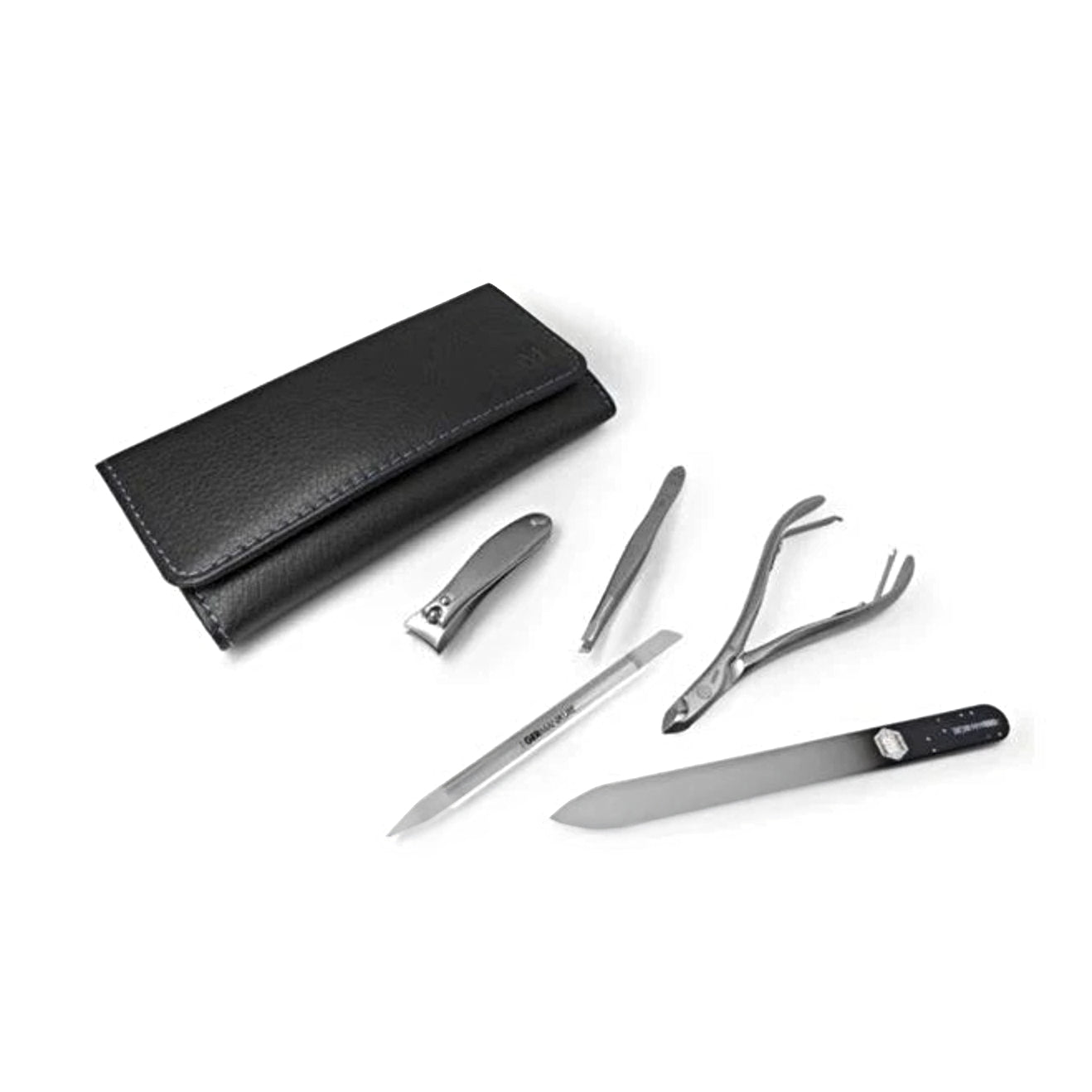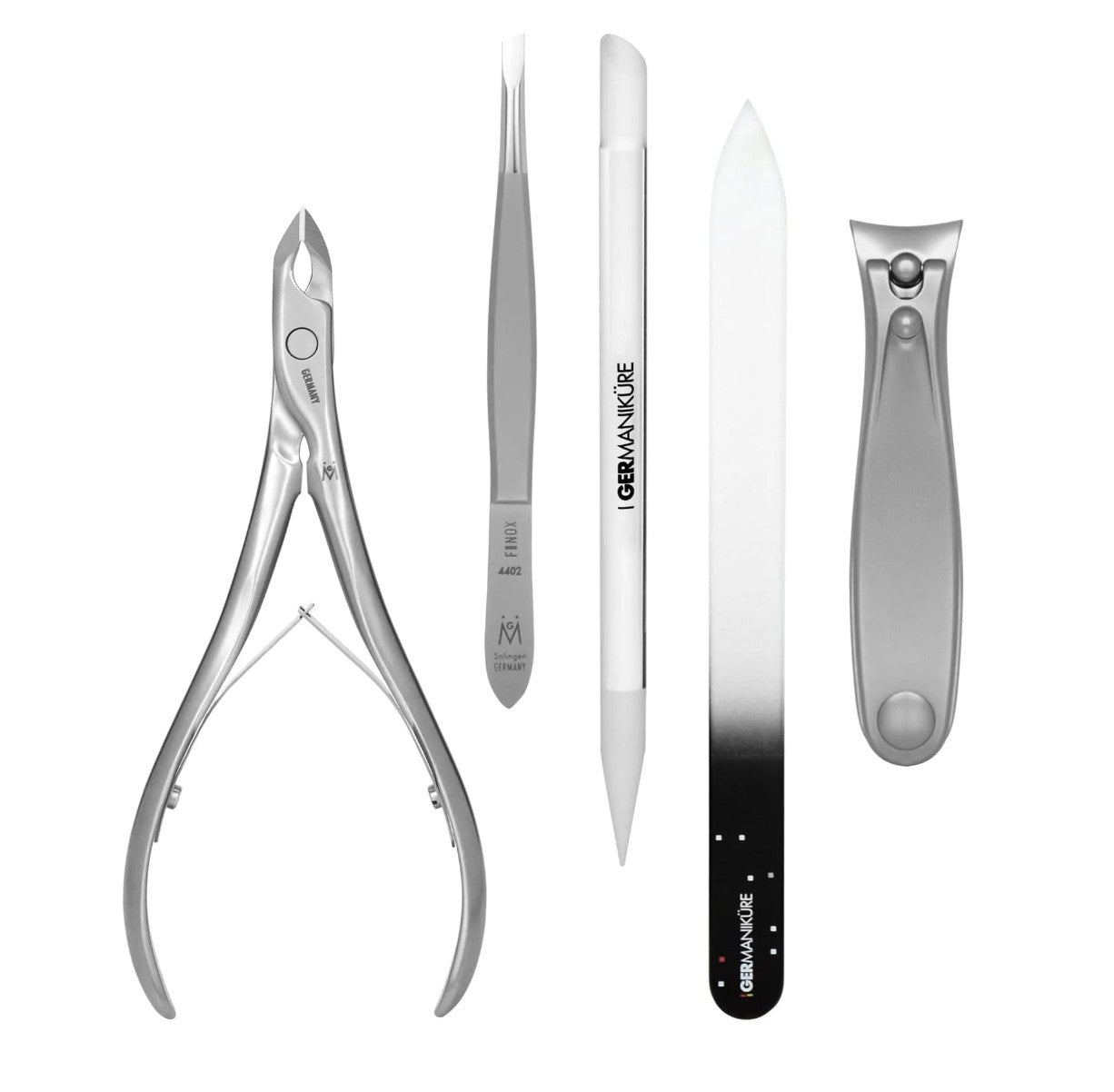GERMANIKURE - Five Piece Manicure Set: Nail Clipper, Cuticle Nipper, Slanted Tweezer, Glass Nail File and Cuticle Stick