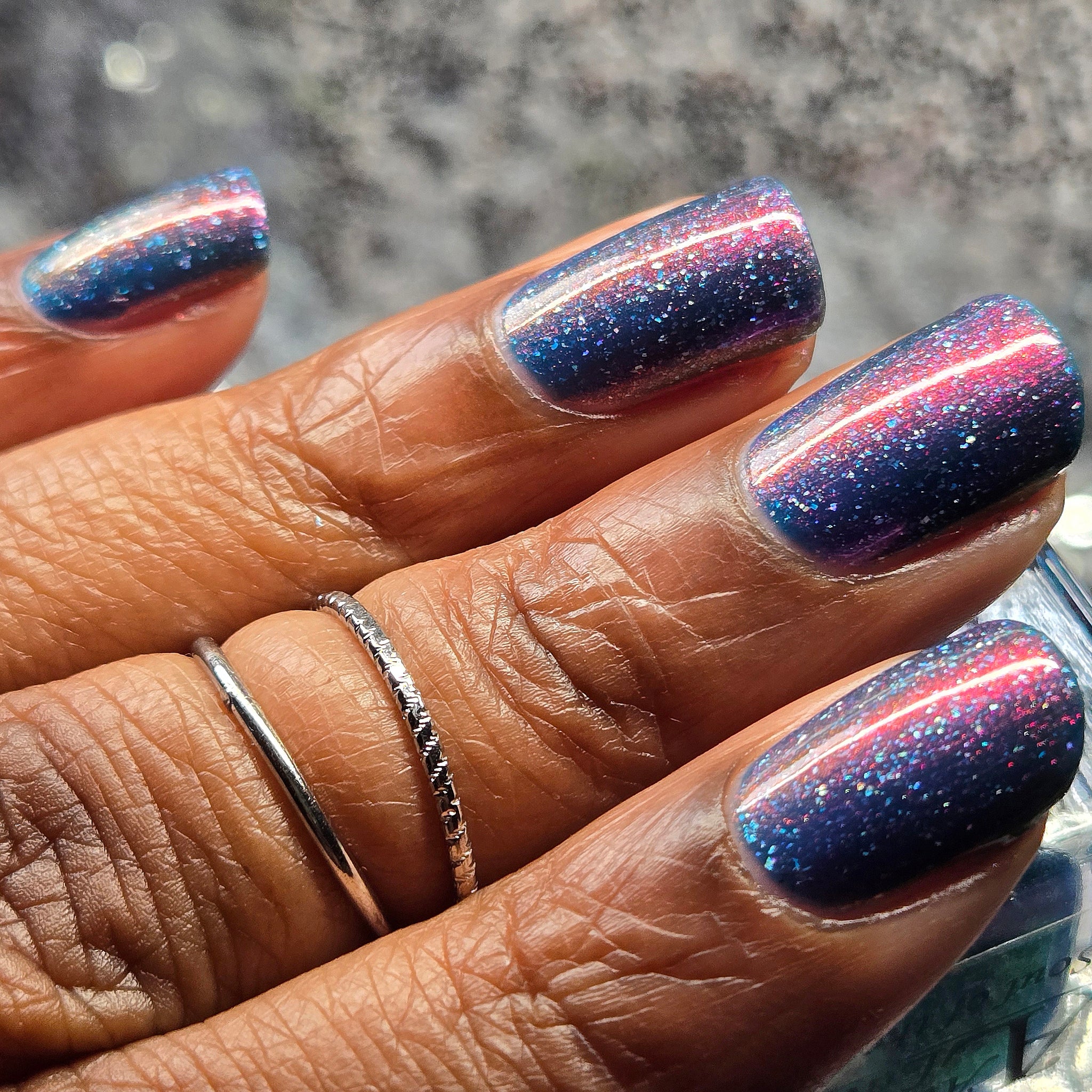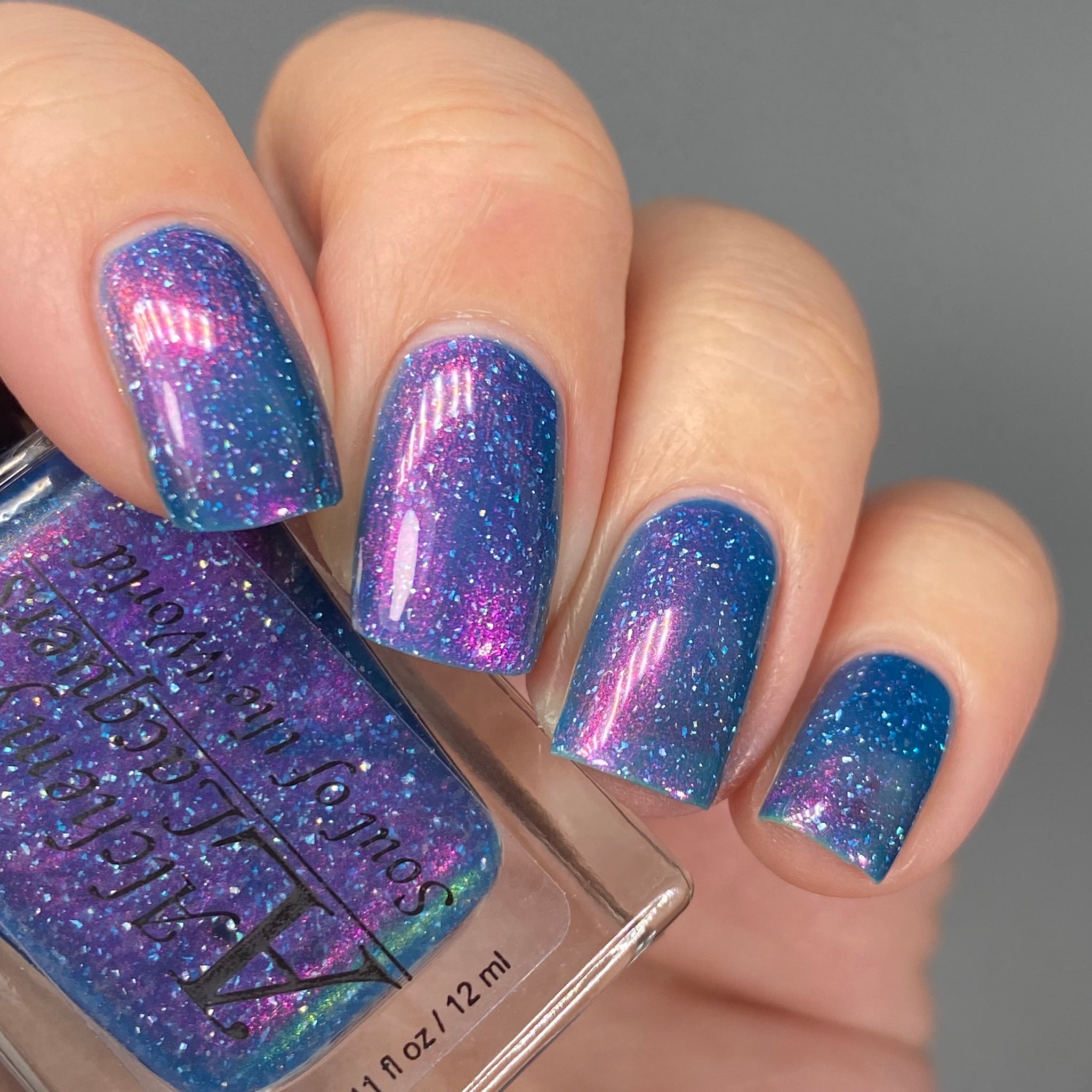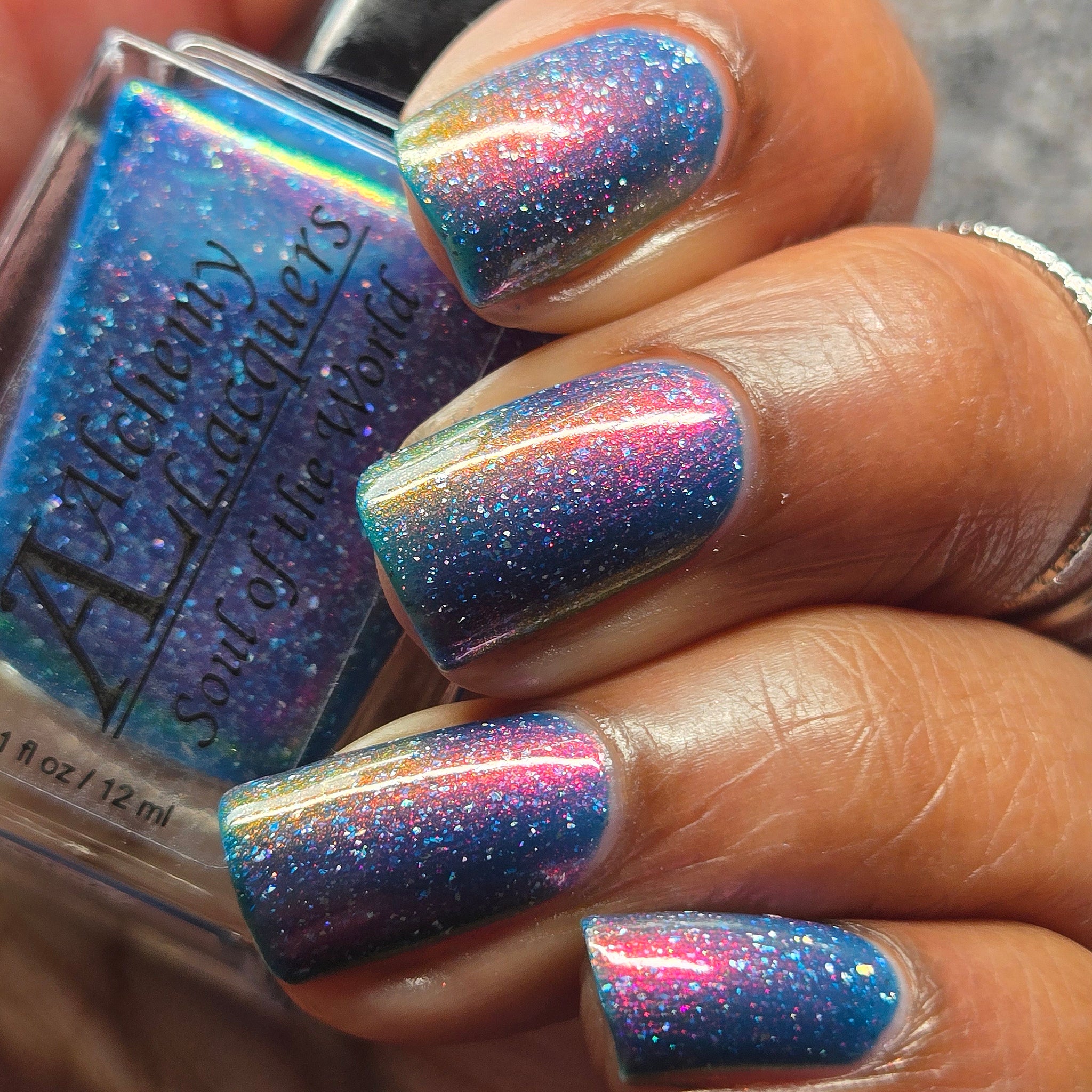 "Soul of the World" is a teal blue jelly nail lacquer with magenta to pink to orange to gold shifting iridescent shimmer and holographic flakes.