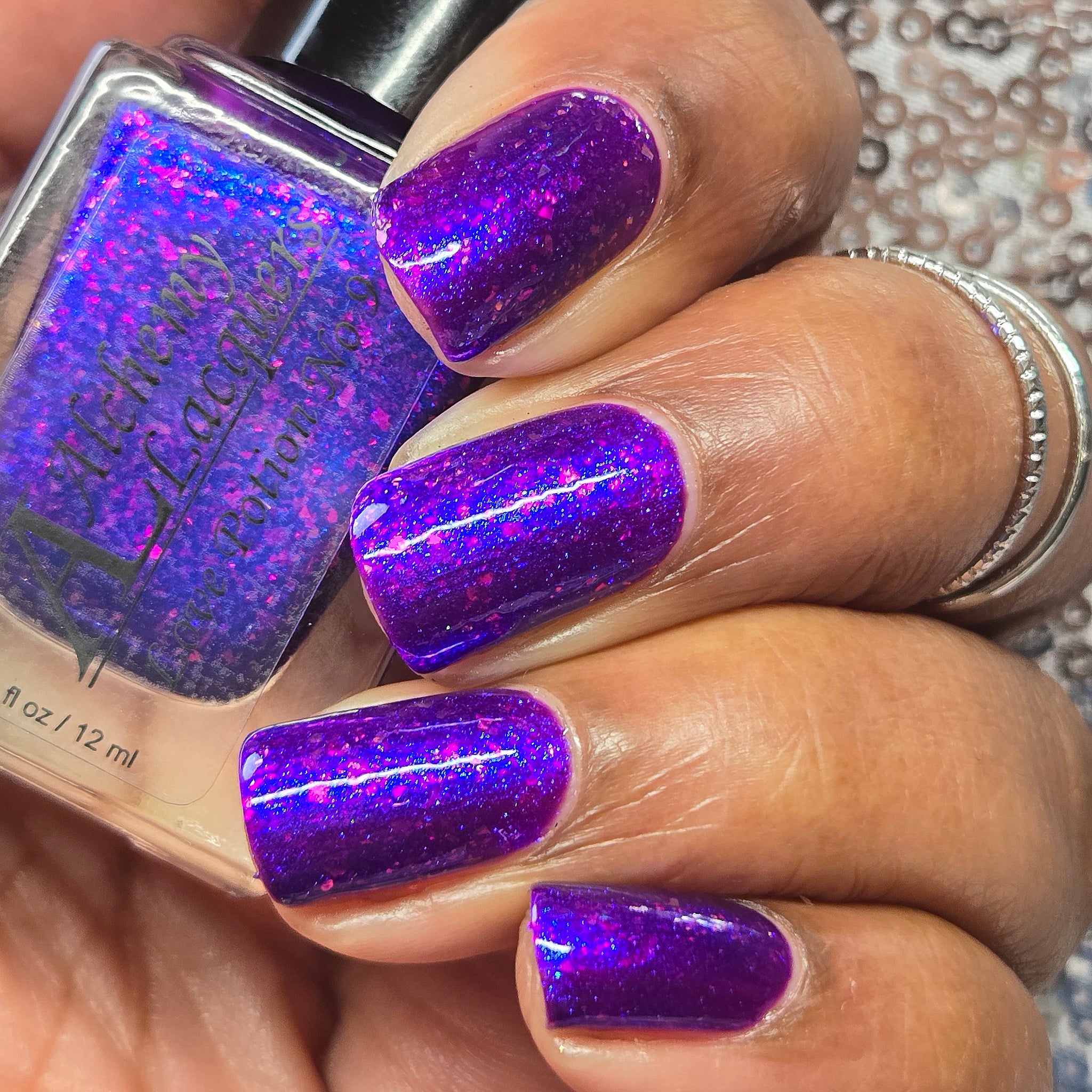 "Love Potion No 9" is a plum jelly nail lacquer with blue to purple shifting iridescent shimmer and pink to orange to gold to green shifting iridescent flakes.