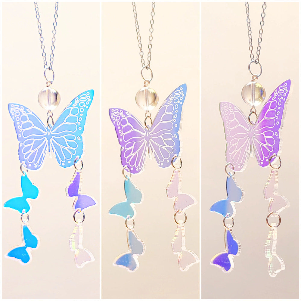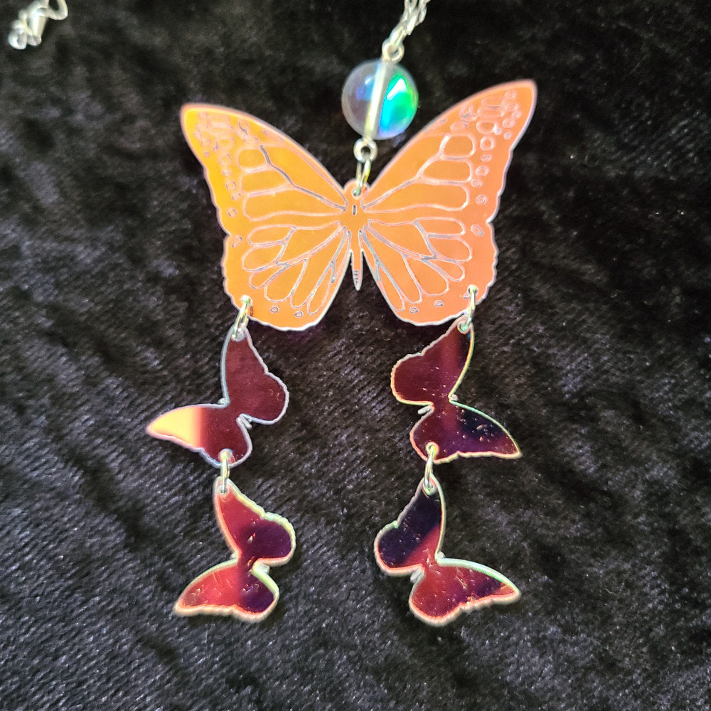 This necklace is made of mermaid beads and iridescent acrylic. The outline of a butterfly is etched in the large acrylic butterfly.