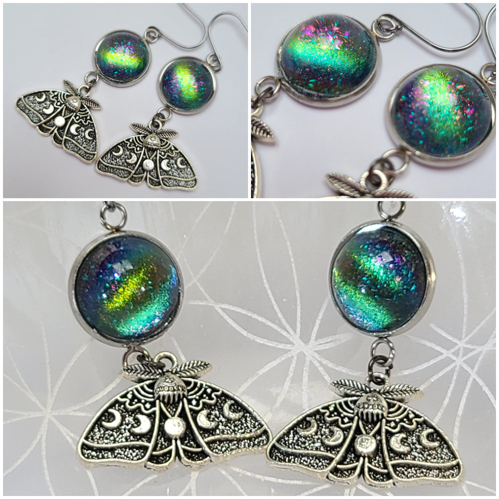 These earrings are made of moon moth charms and handpainted glass cabs. The earring hooks are hypoallergenic and you will receive silicone earring backs as well.