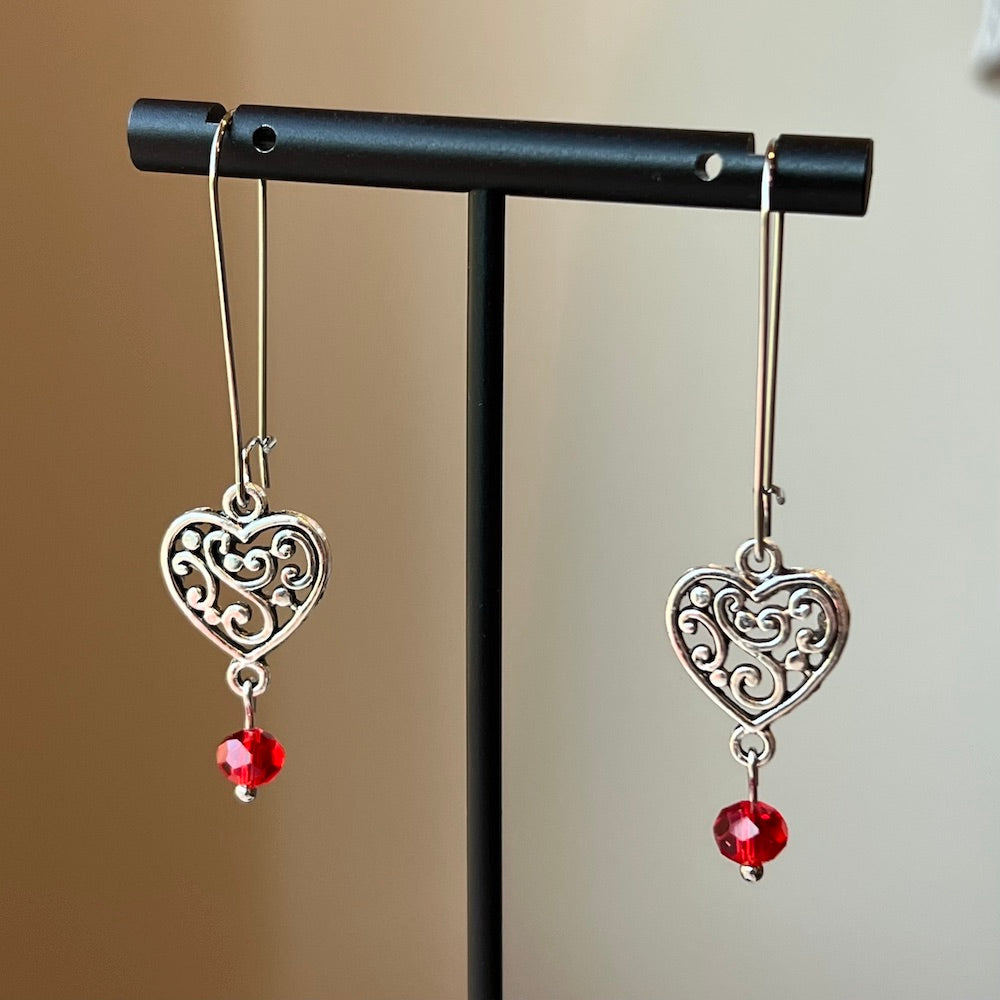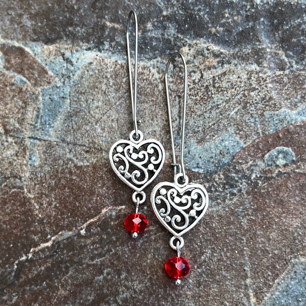 Fall head over heels for these sweet Valentine’s earrings featuring silver-finished filigree hearts paired with sparkling red faceted glass beads on long, graceful stainless steel kidney ear wires. Lightweight and versatile, you’ll love wearing these whimsical beauties with everything from casual jeans to dressier outfits. They also make a lovely gift for someone special. Earrings measure just over 2" long.