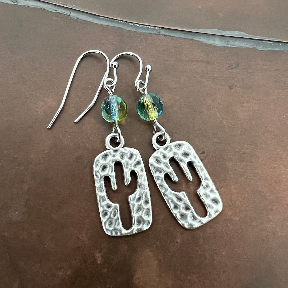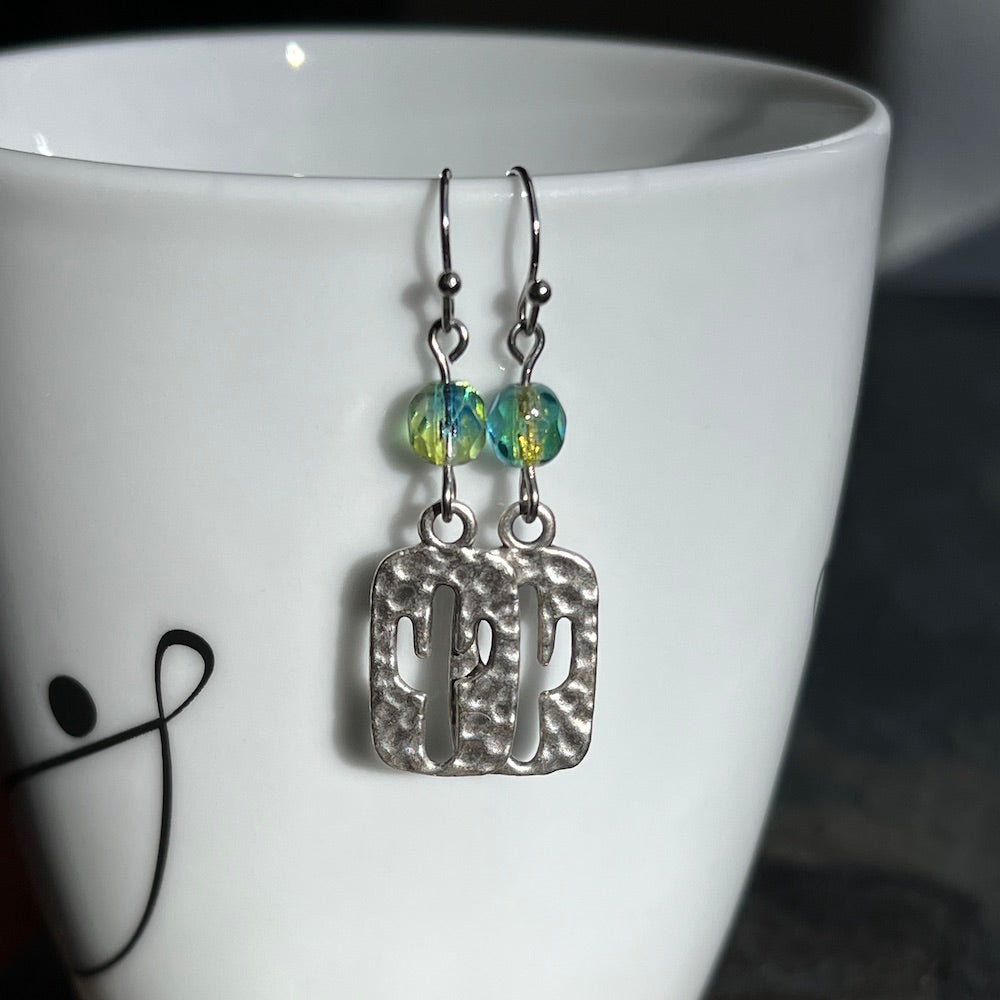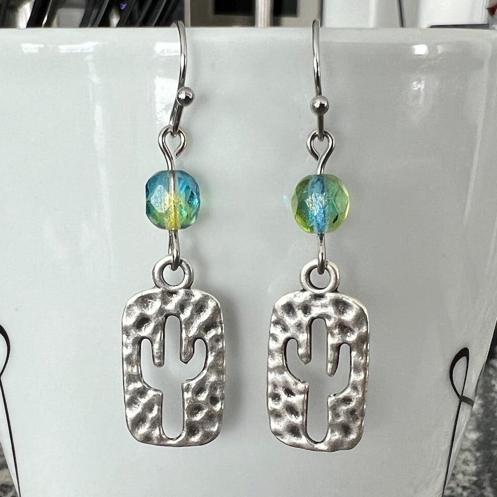 Bring a little desert magic to any outfit with these whimsical earrings that feature an adorable double-sided hammered cactus paired with a unique tri-colored Czech glass fire-polished bead in blue, green, and yellow. Measuring approximately 1 3/4" long, they’re finished with comfortable stainless steel ear wires and silicone backs for easy, lightweight wear. Effortlessly versatile, these botanical beauties pair perfectly with everyday looks and also make a thoughtful gift for someone special.