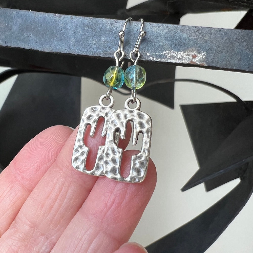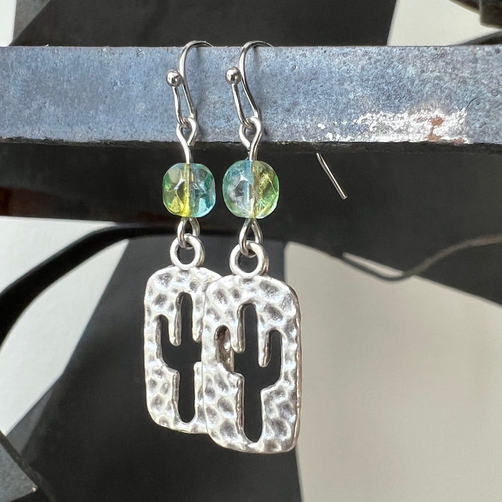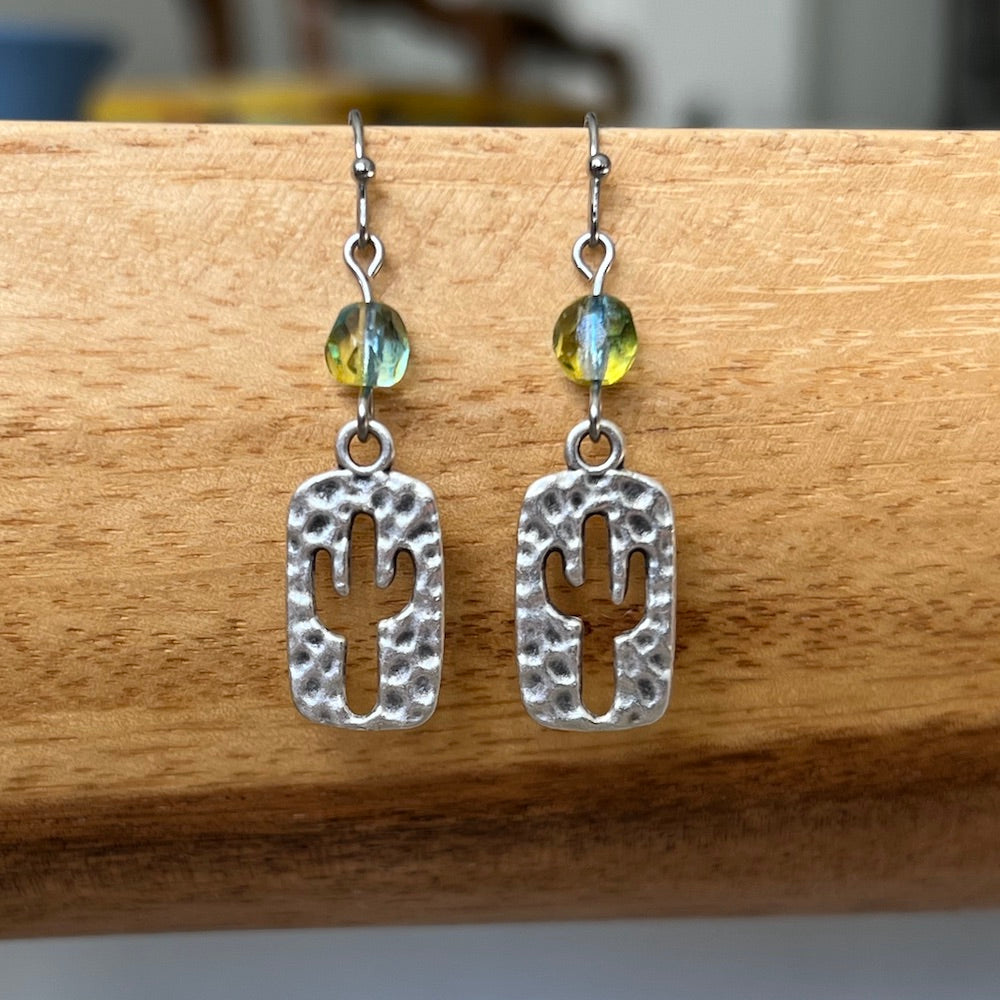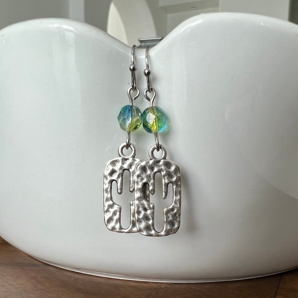 Bring a little desert magic to any outfit with these whimsical earrings that feature an adorable double-sided hammered cactus paired with a unique tri-colored Czech glass fire-polished bead in blue, green, and yellow. Measuring approximately 1 3/4" long, they’re finished with comfortable stainless steel ear wires and silicone backs for easy, lightweight wear. Effortlessly versatile, these botanical beauties pair perfectly with everyday looks and also make a thoughtful gift for someone special.
