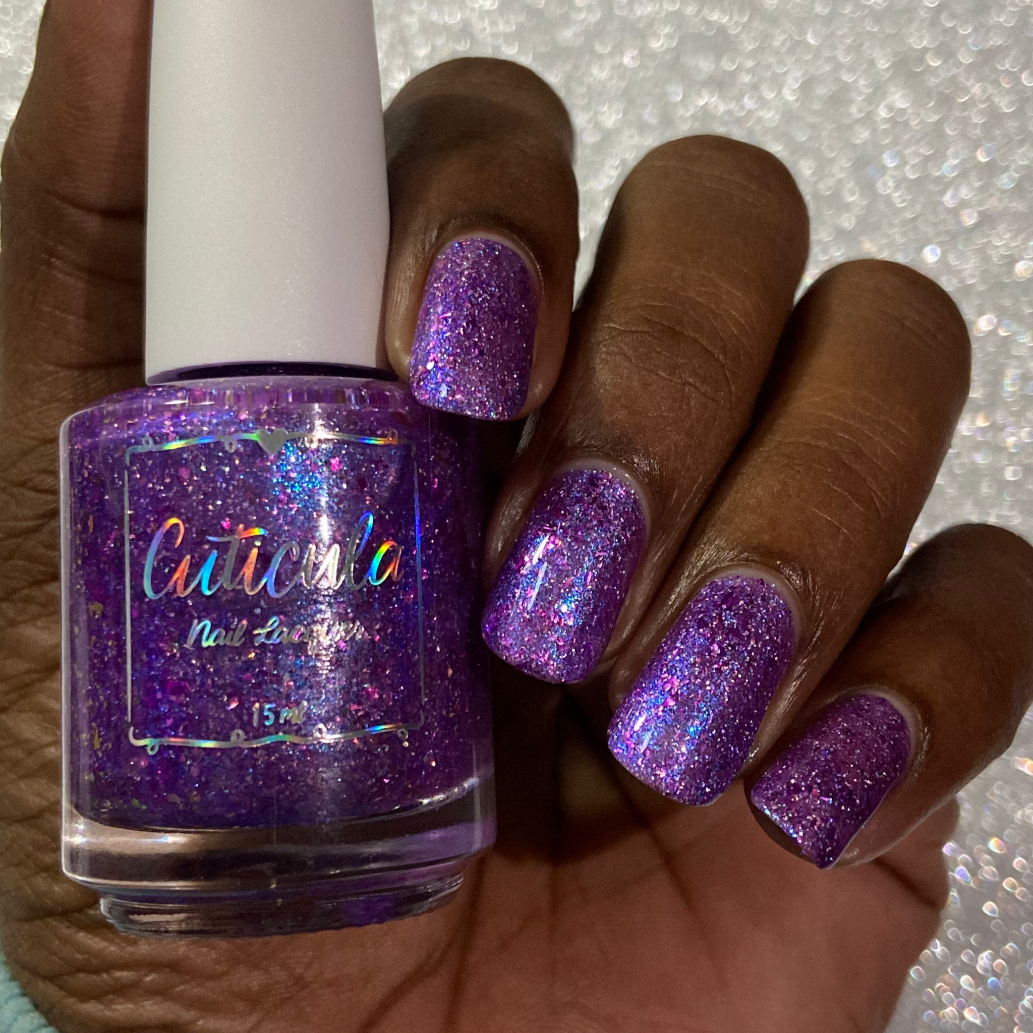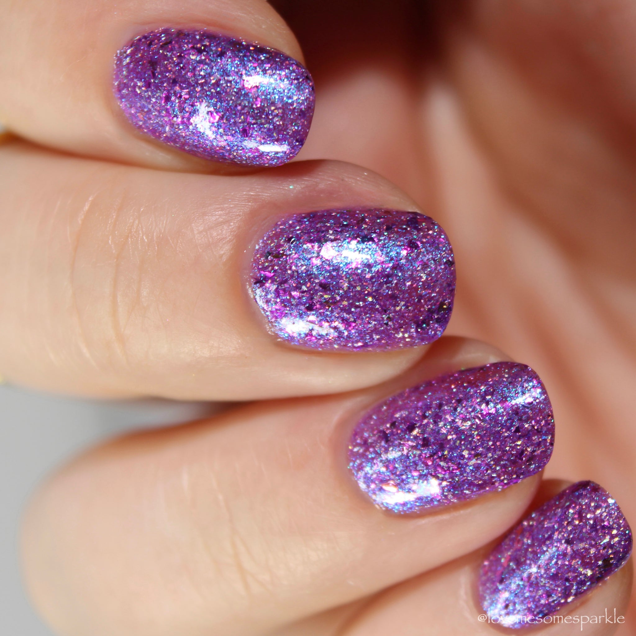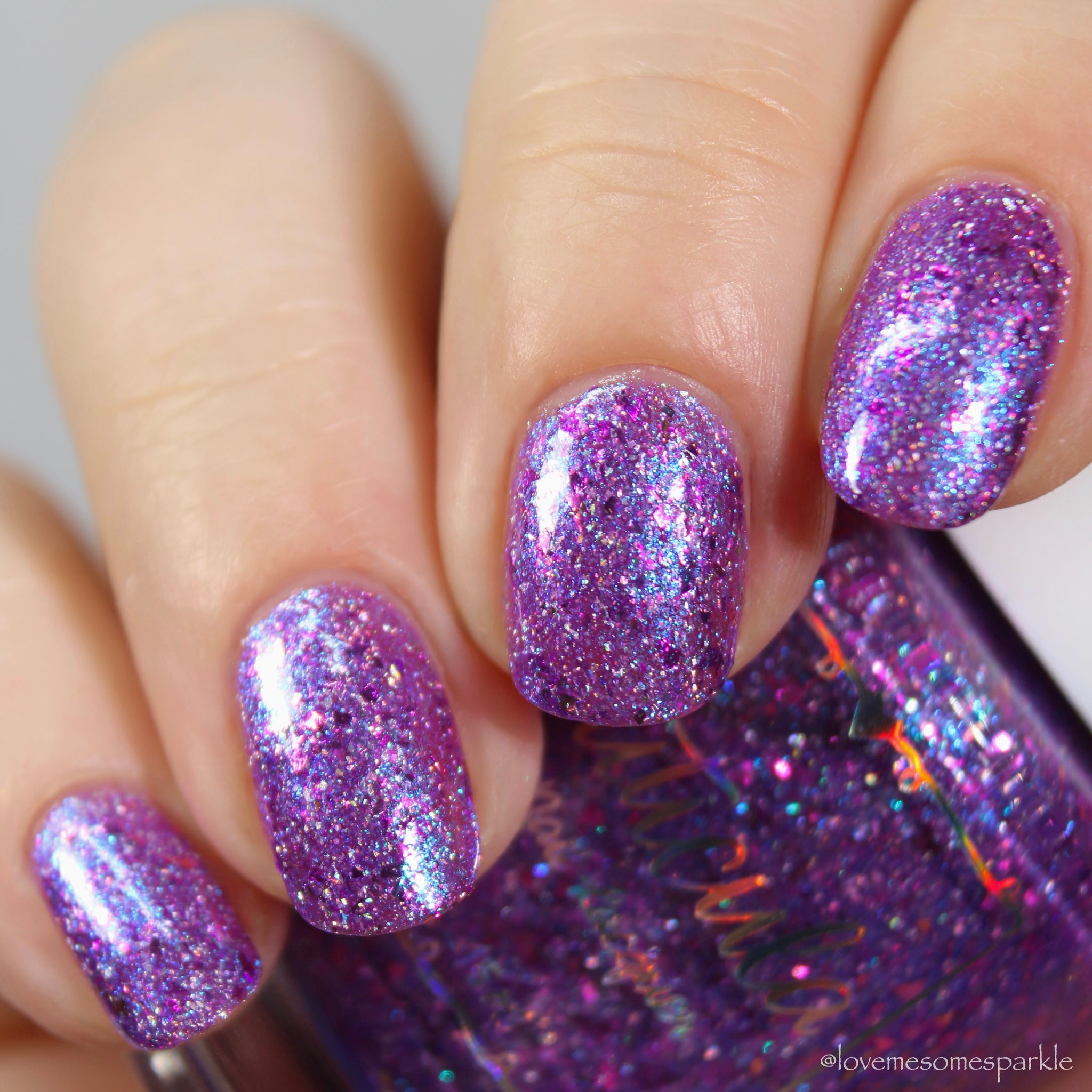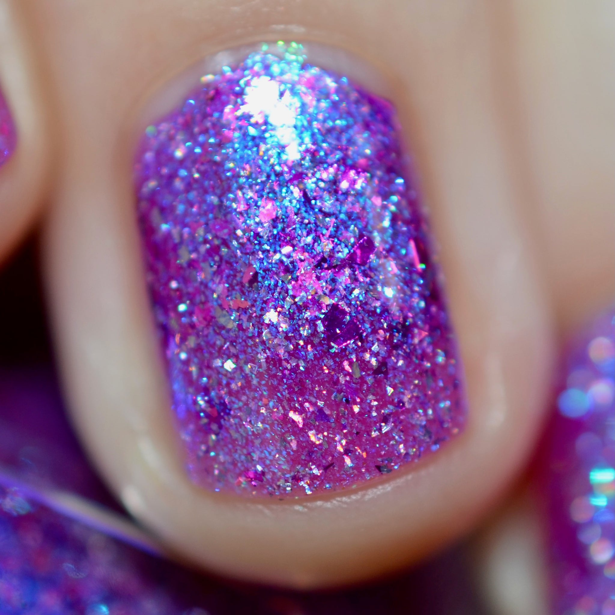 "Social Butterfly" has a purple jelly base with striking blue shimmer, fuchsia flakes in various sizes, and silver holographic flakes.