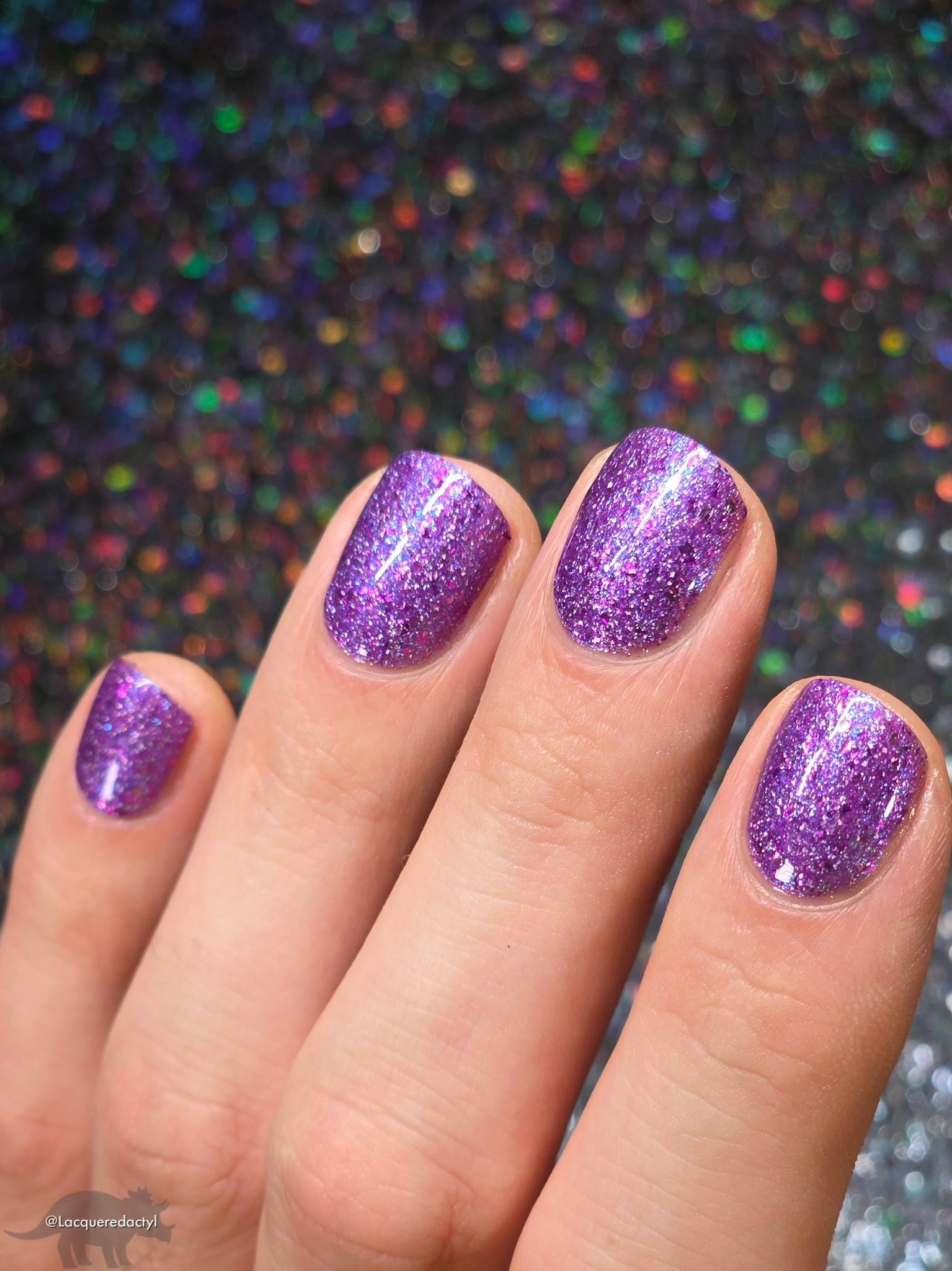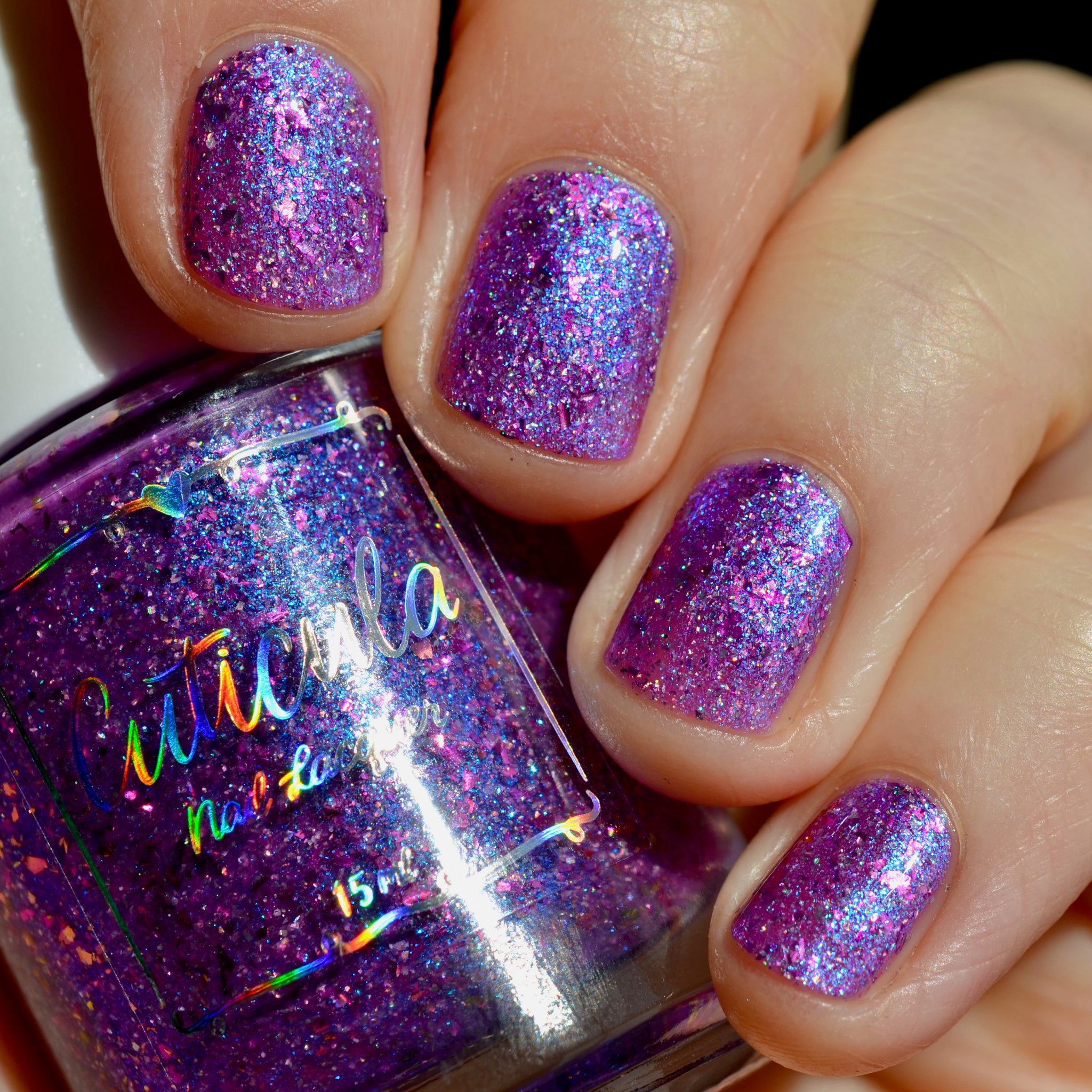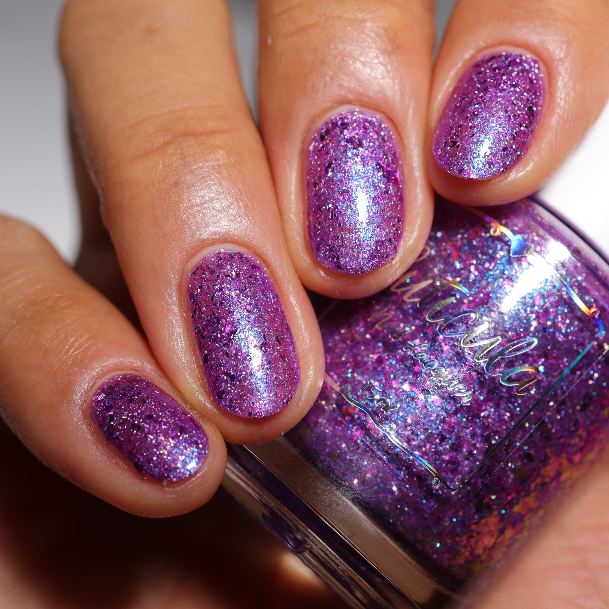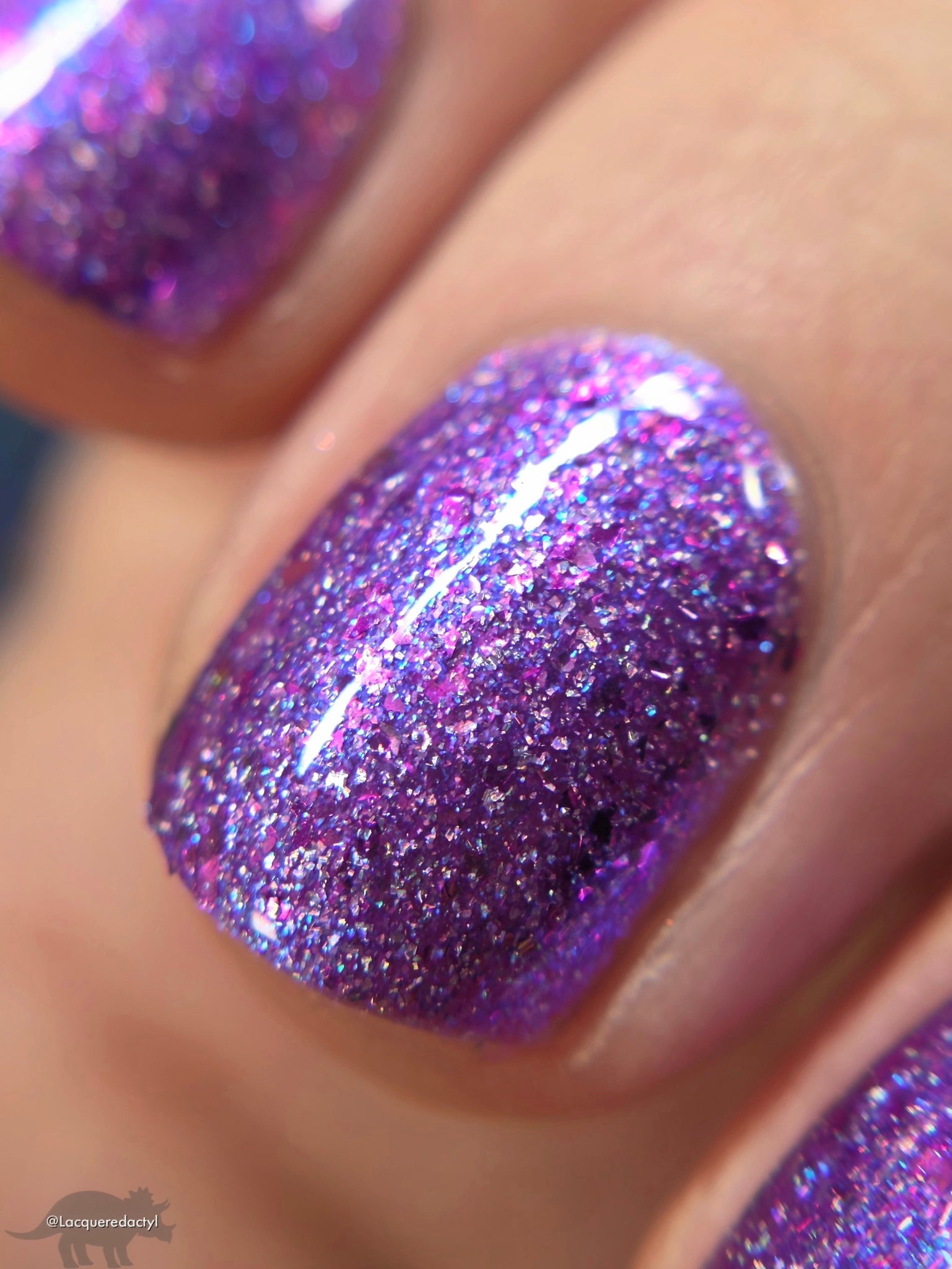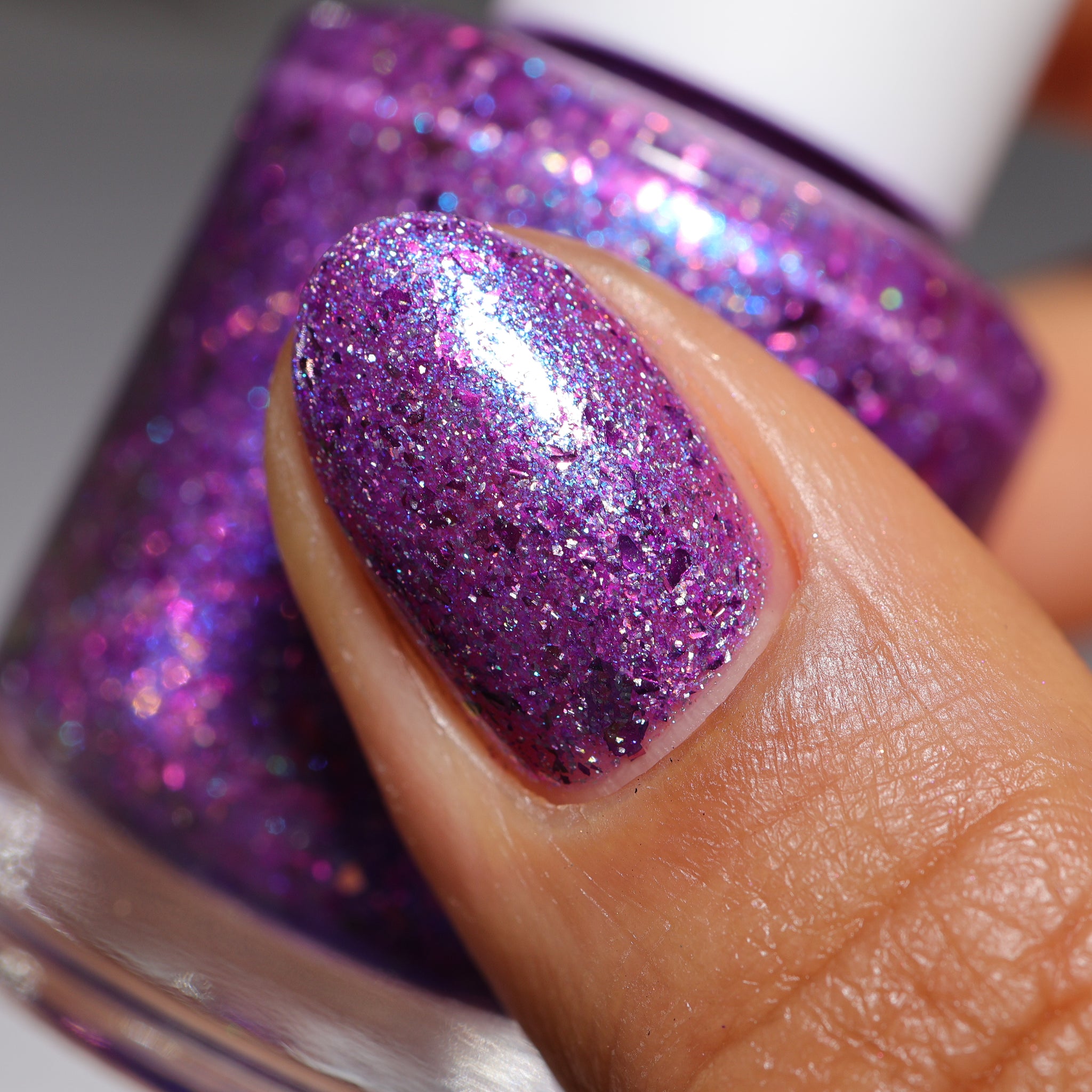 "Social Butterfly" has a purple jelly base with striking blue shimmer, fuchsia flakes in various sizes, and silver holographic flakes.