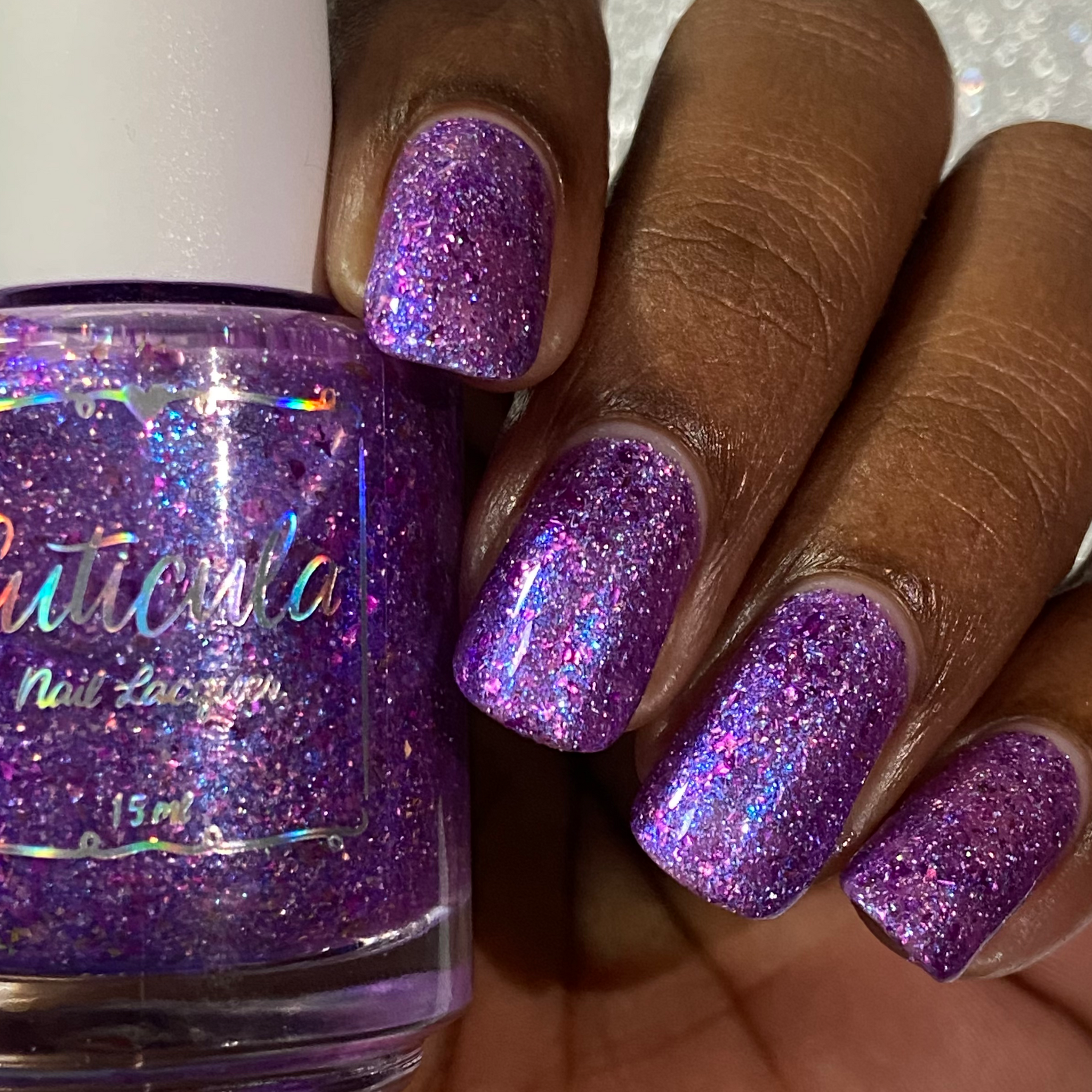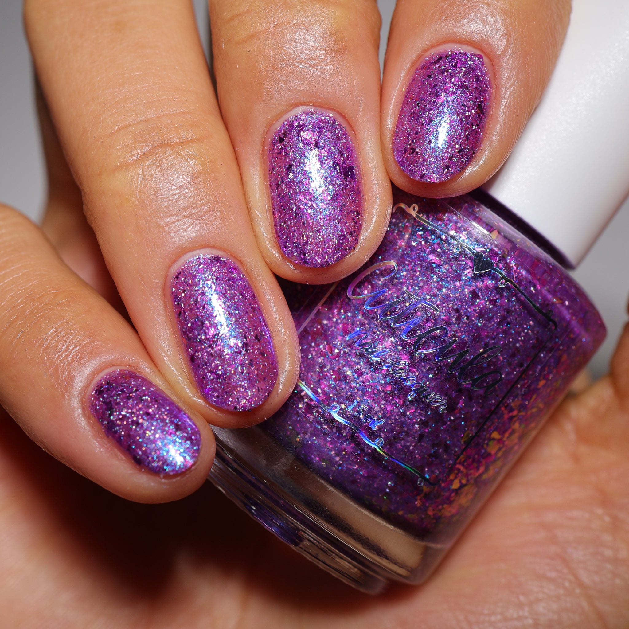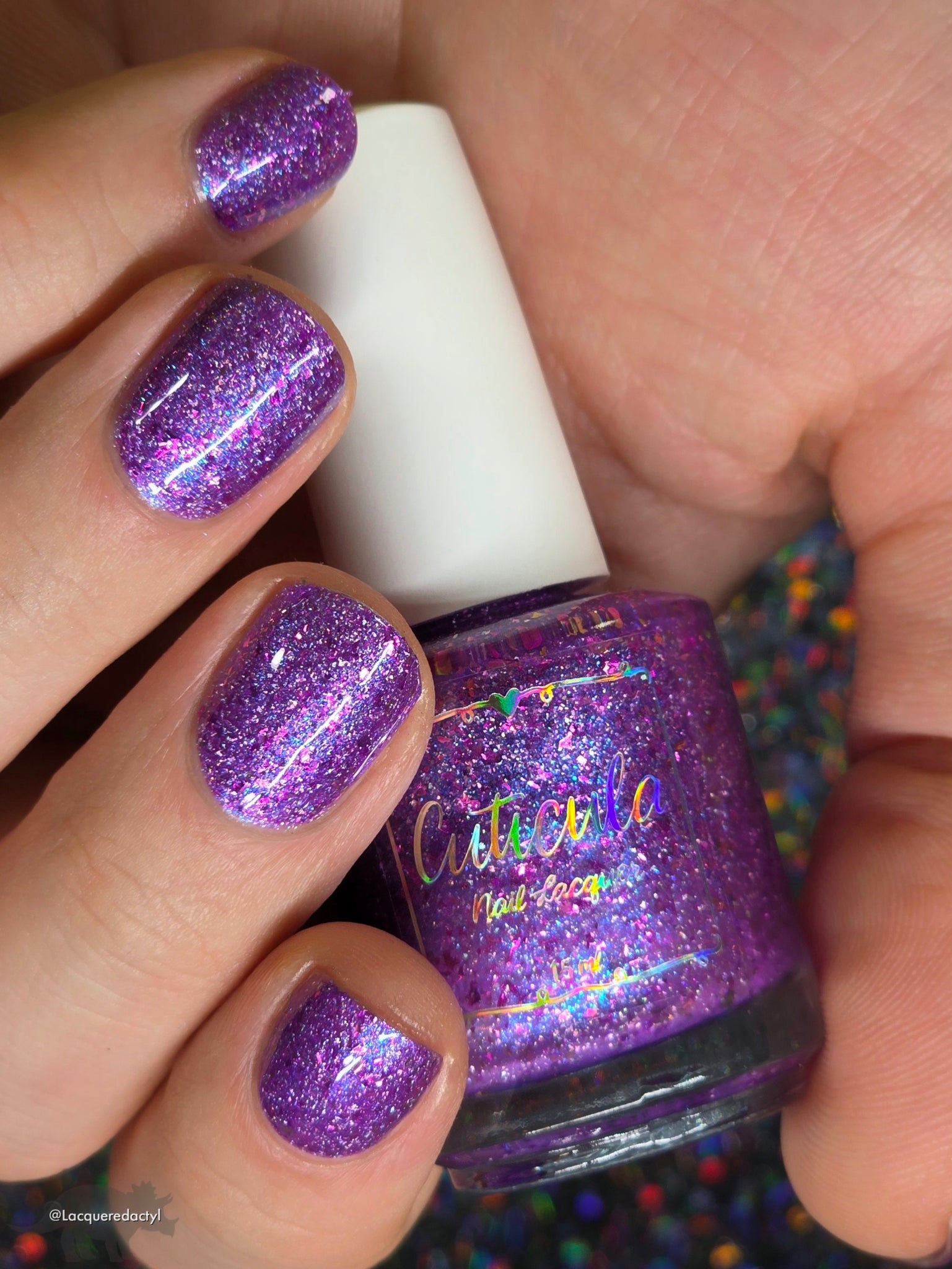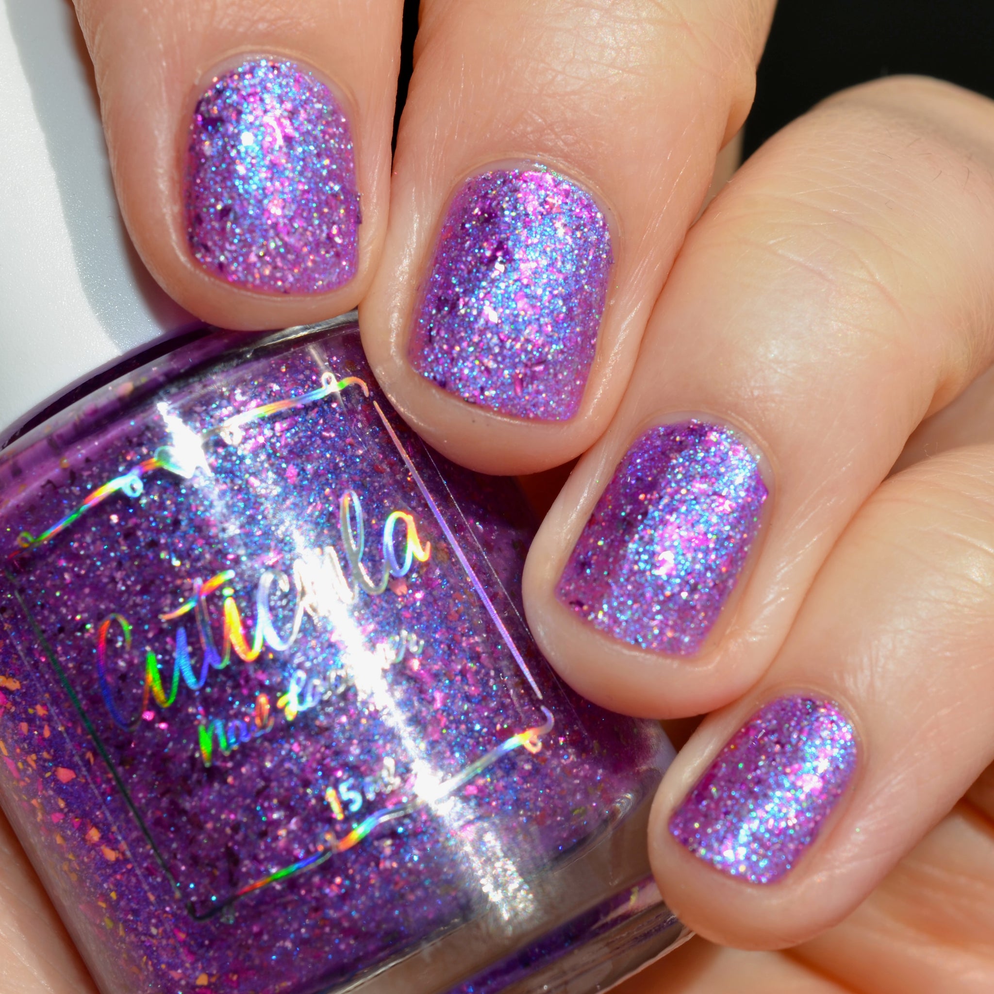 "Social Butterfly" has a purple jelly base with striking blue shimmer, fuchsia flakes in various sizes, and silver holographic flakes.