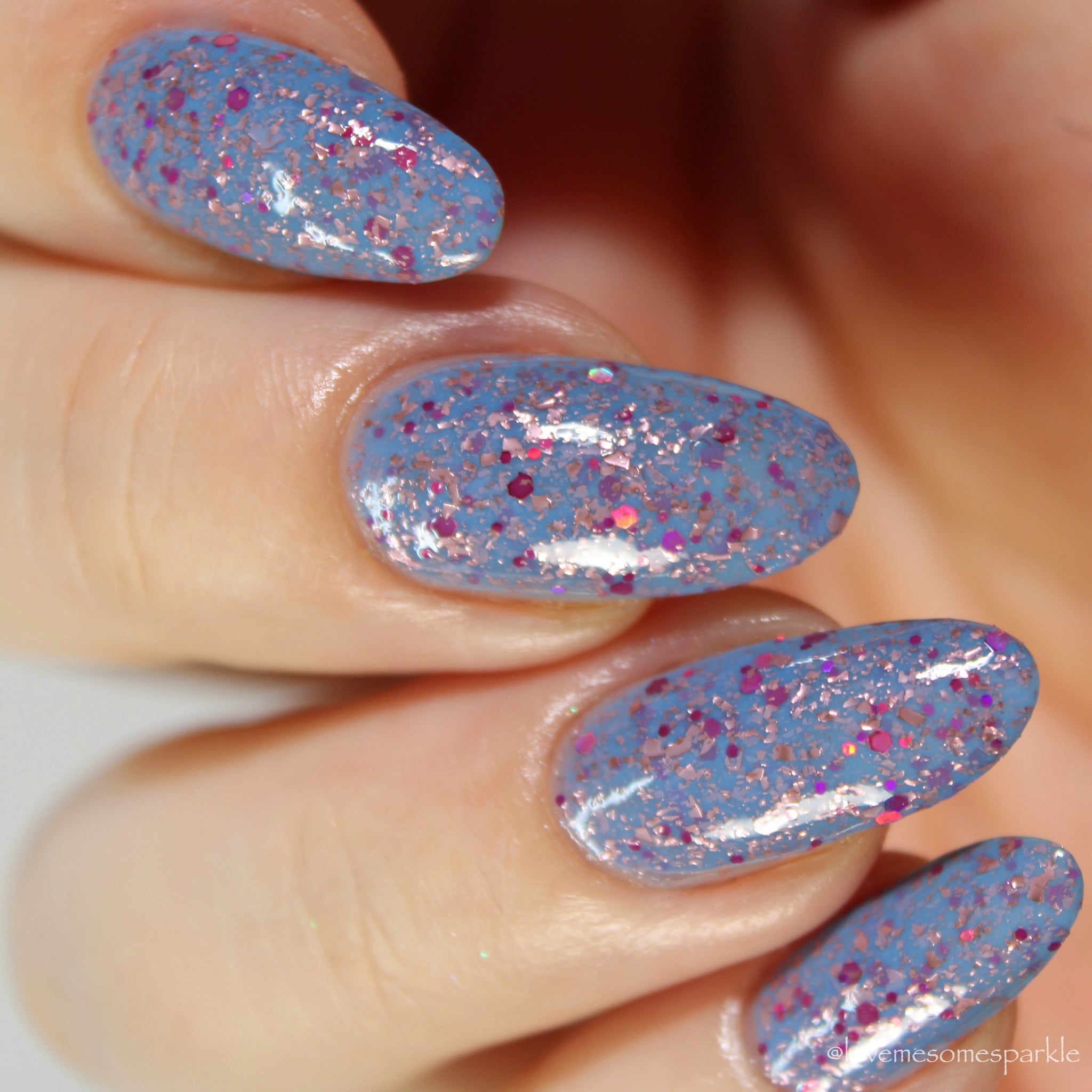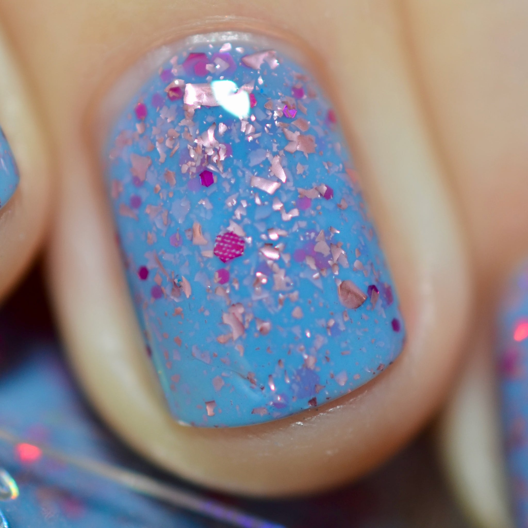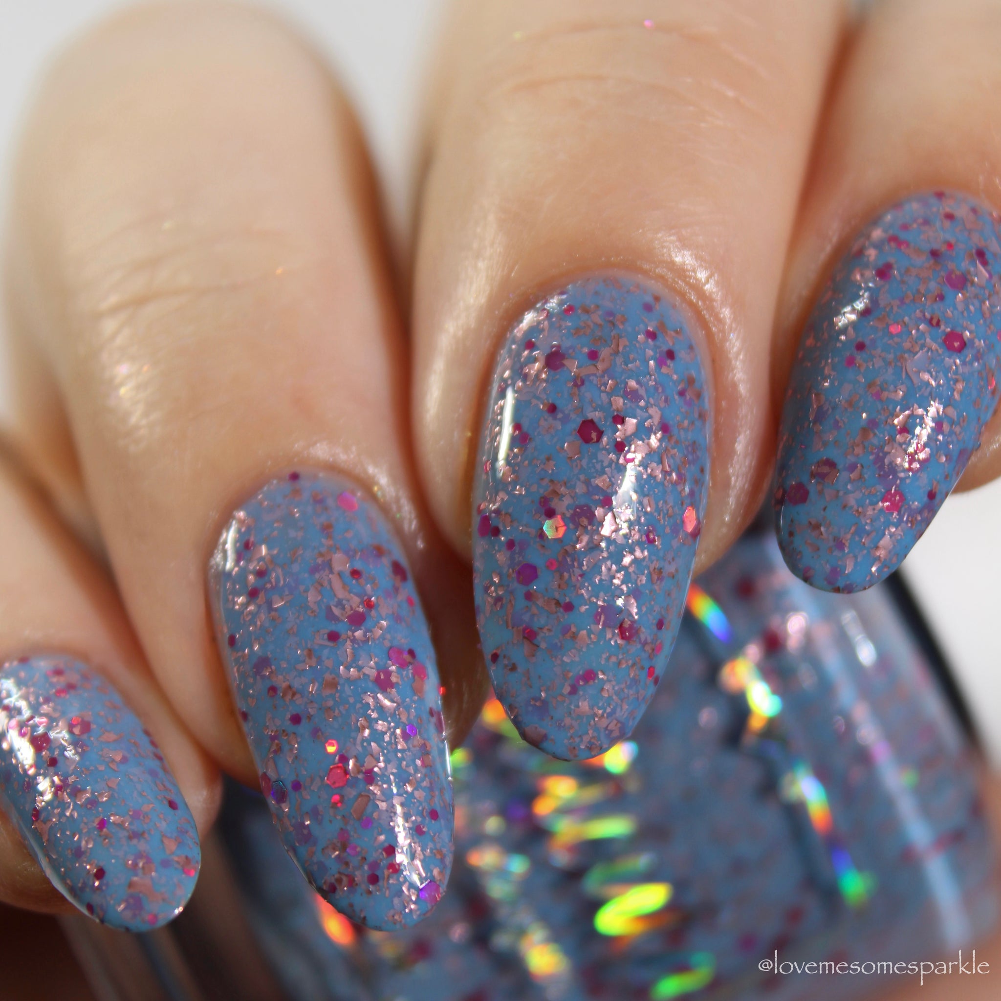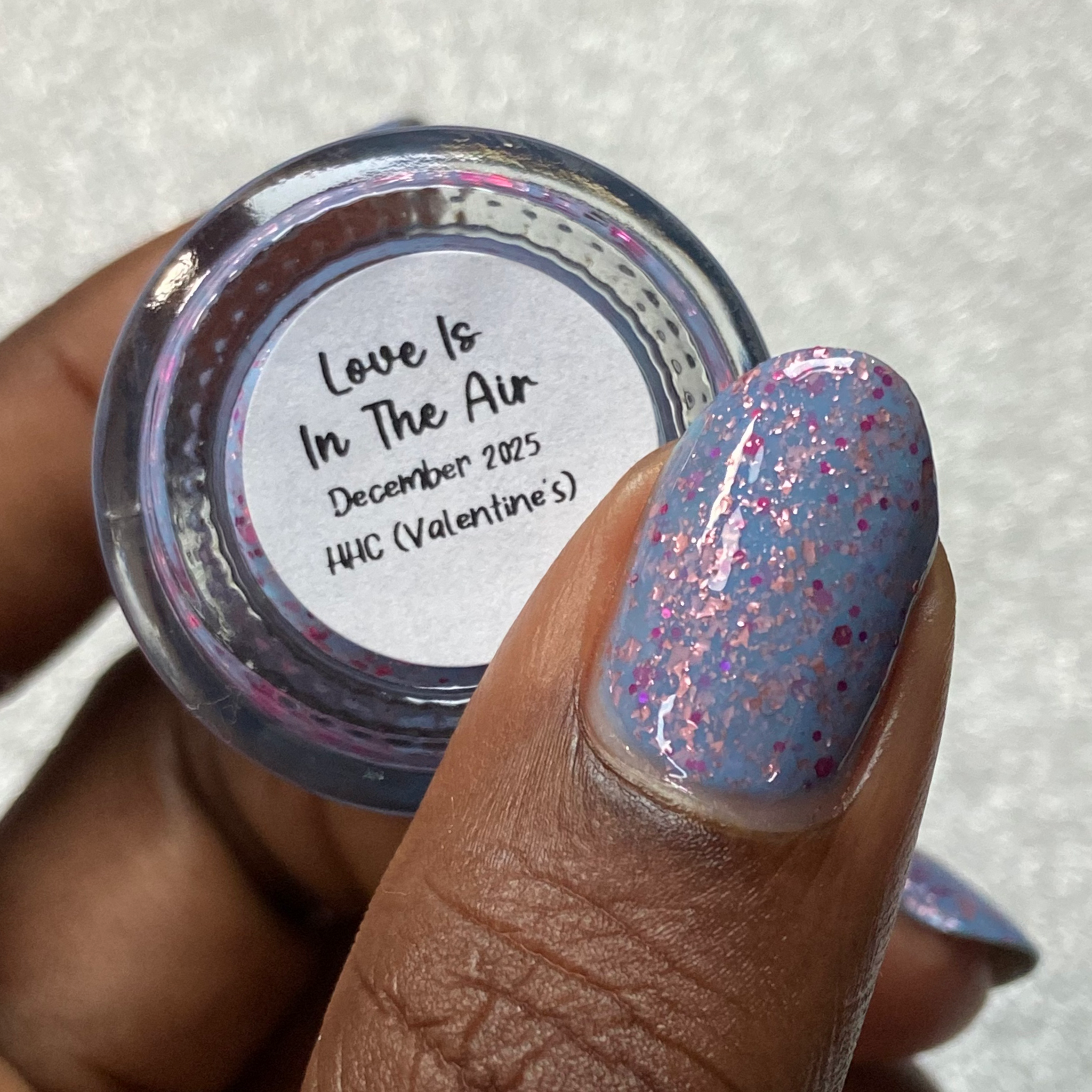 "Love Is In The Air" is a dusty baby blue crelly with rose gold metallic flakes and bright pink holographic flakes in 2 various sizes. It's a little nod to an older HHC called Magic In The Air.