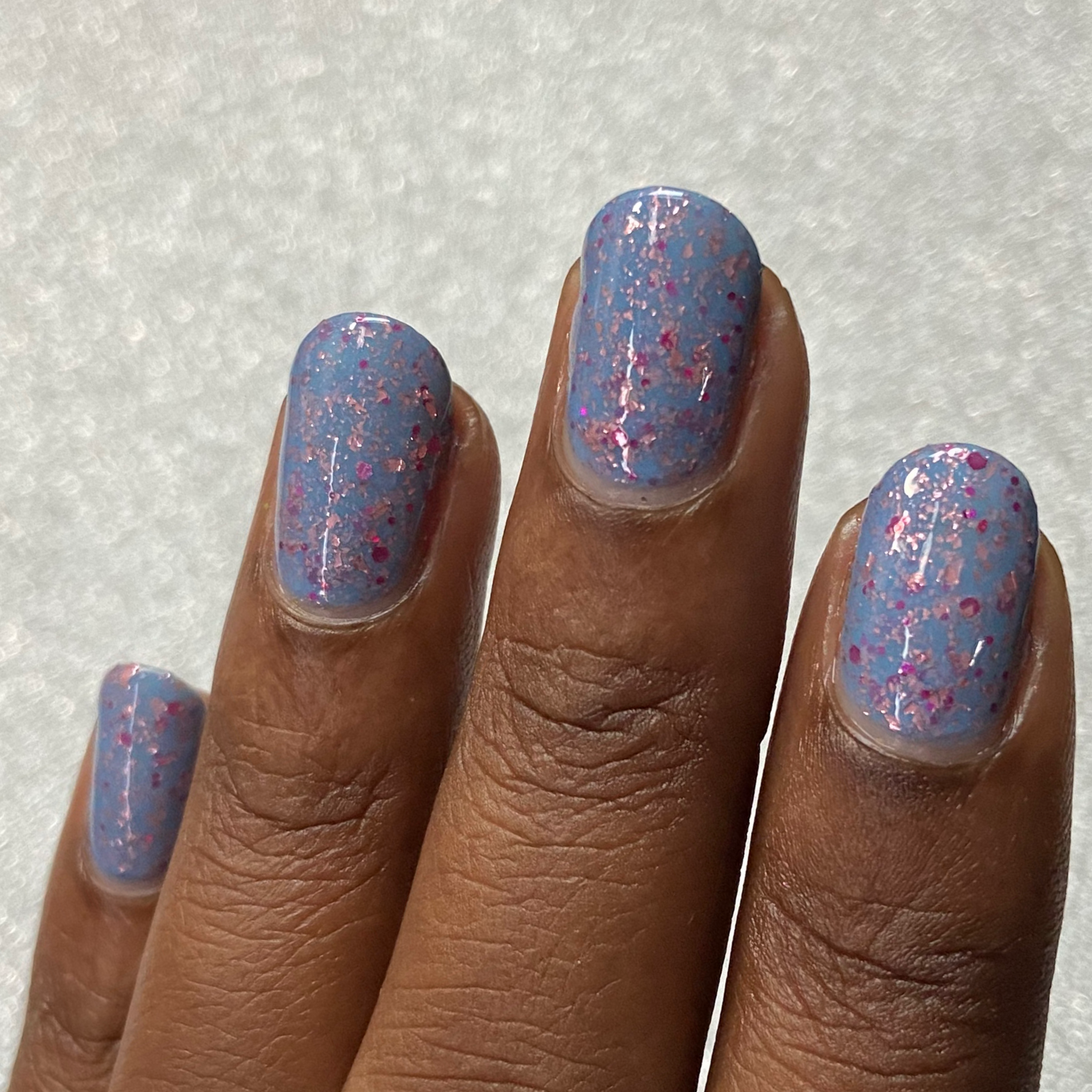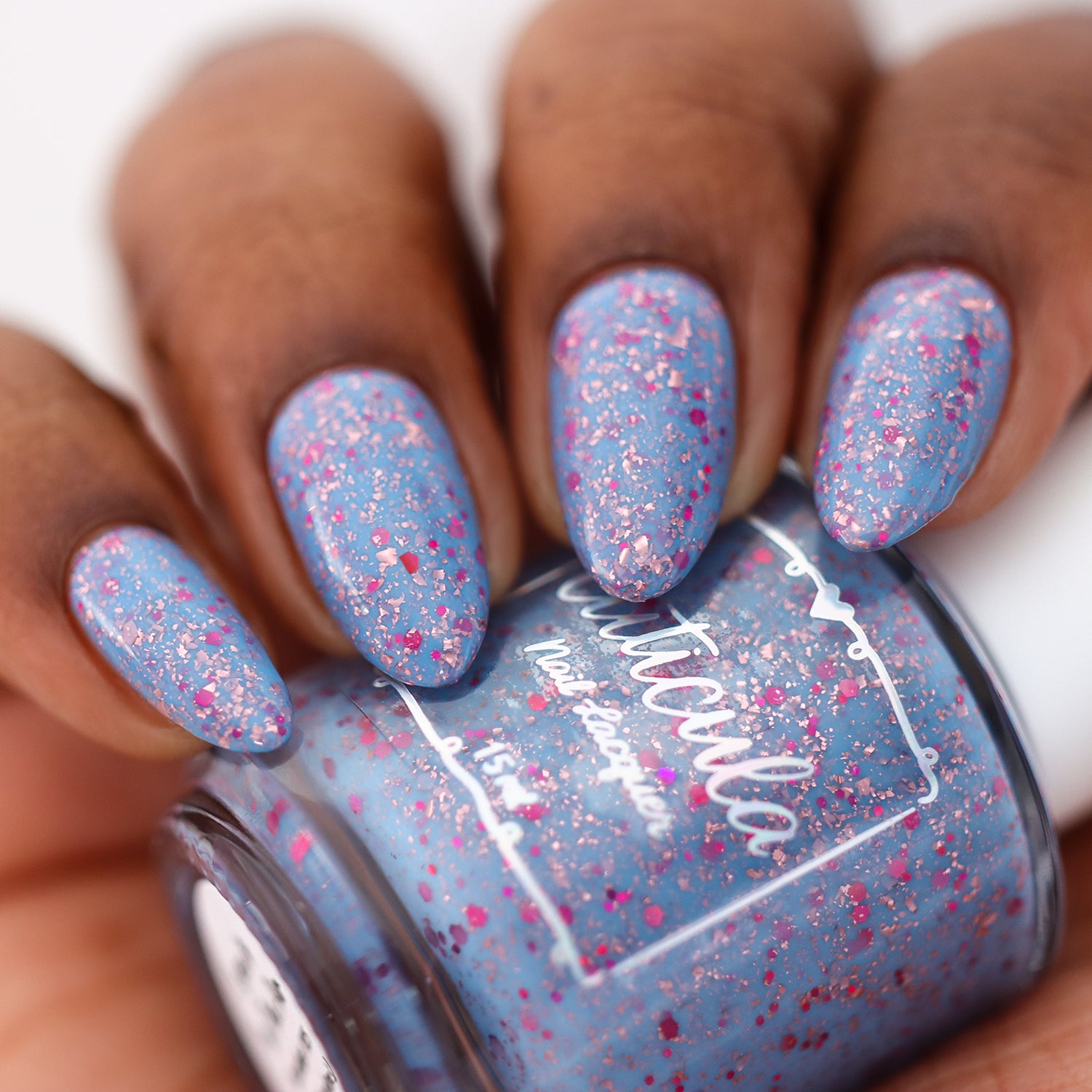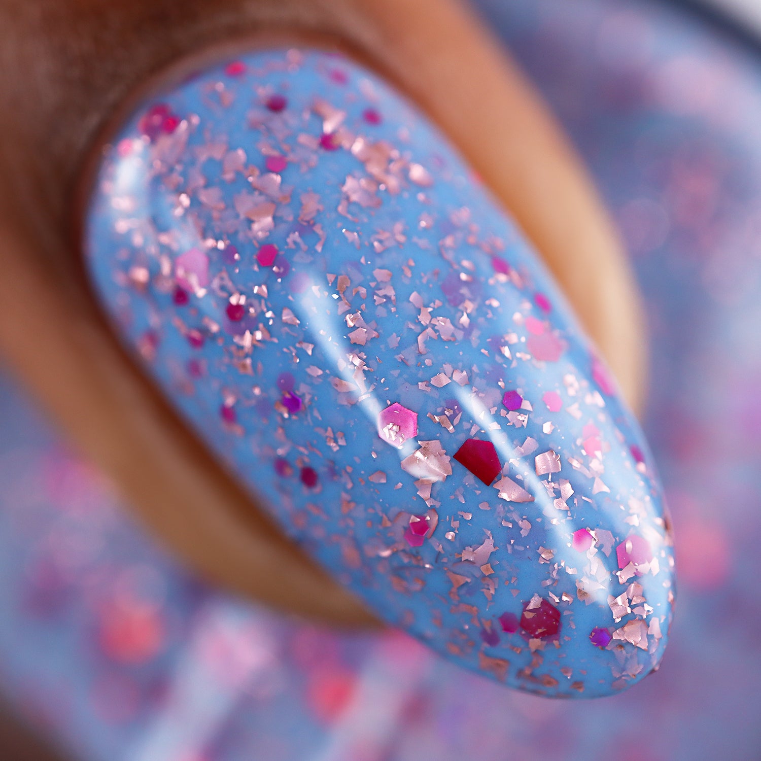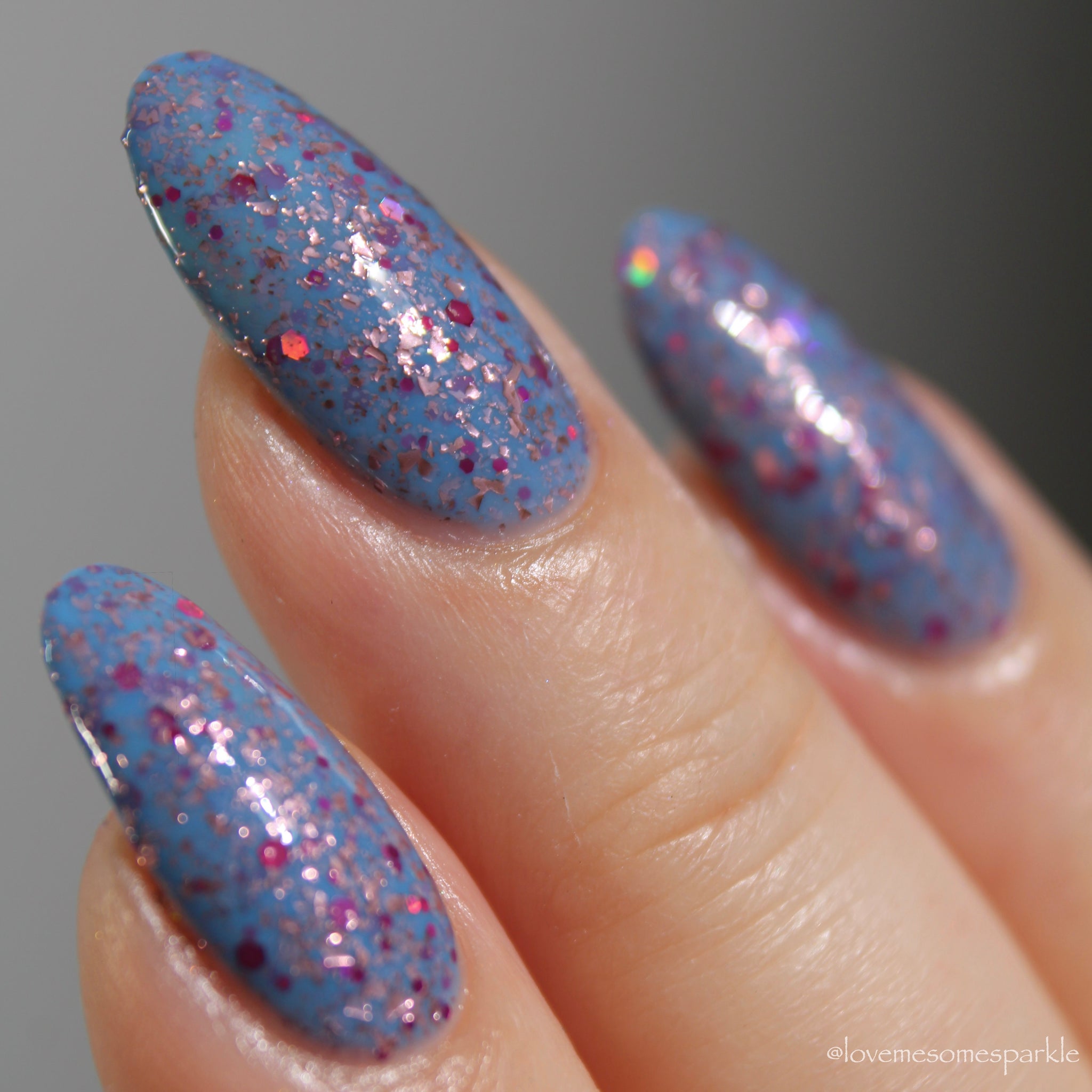 "Love Is In The Air" is a dusty baby blue crelly with rose gold metallic flakes and bright pink holographic flakes in 2 various sizes. It's a little nod to an older HHC called Magic In The Air.