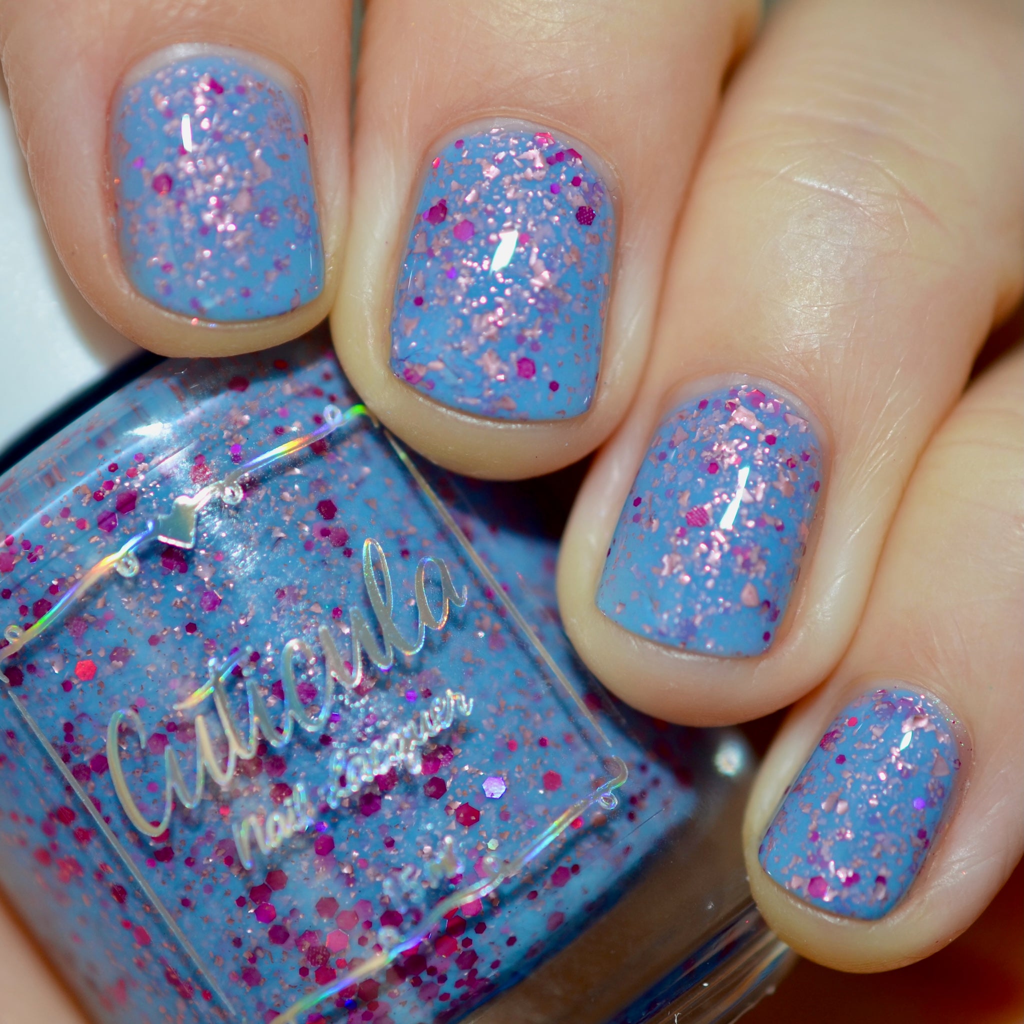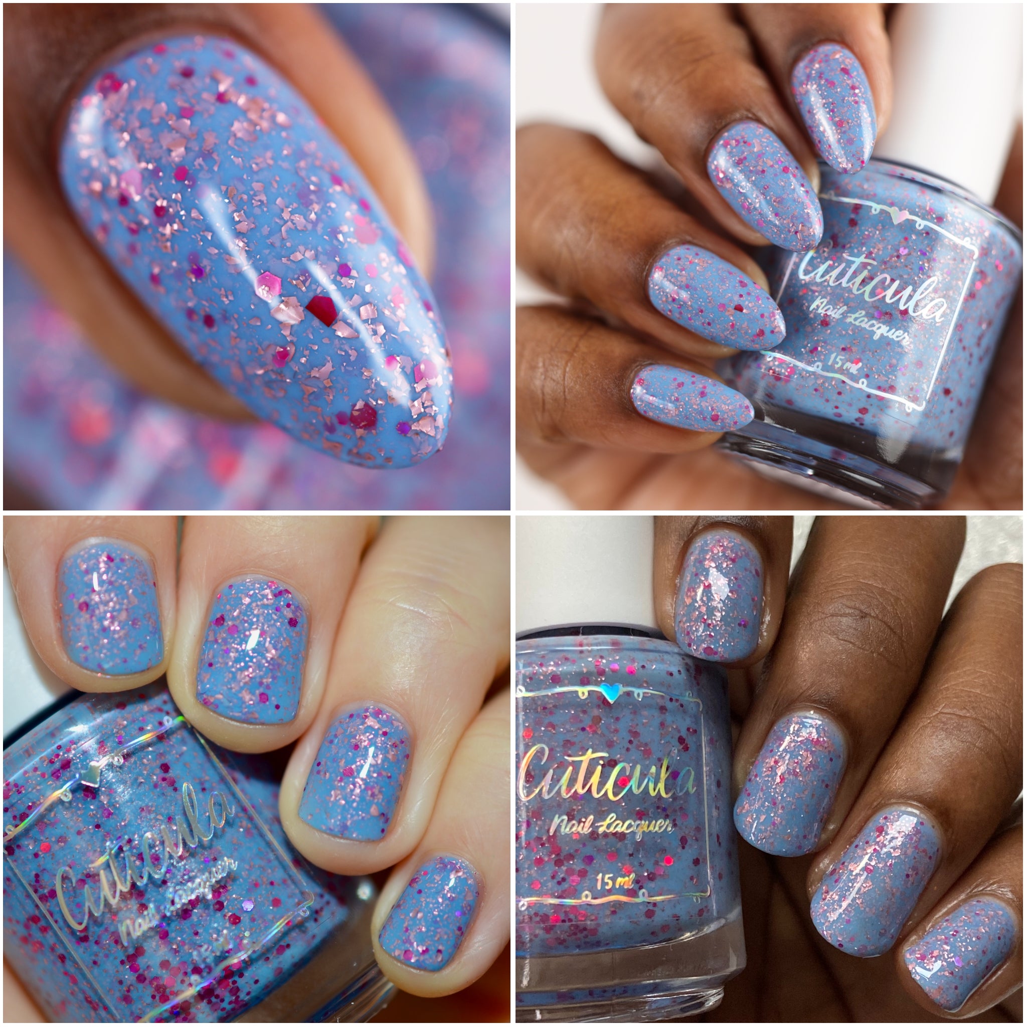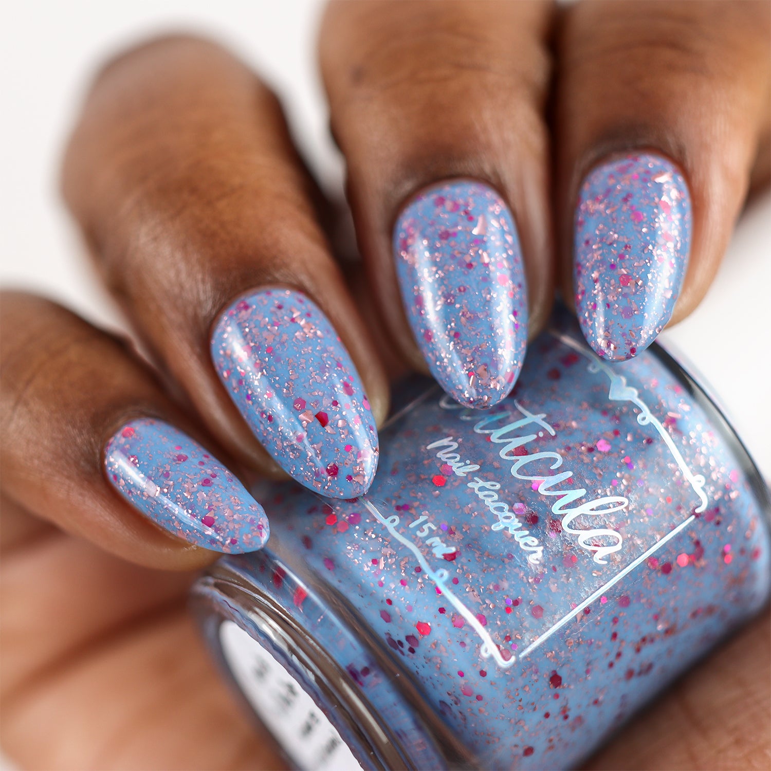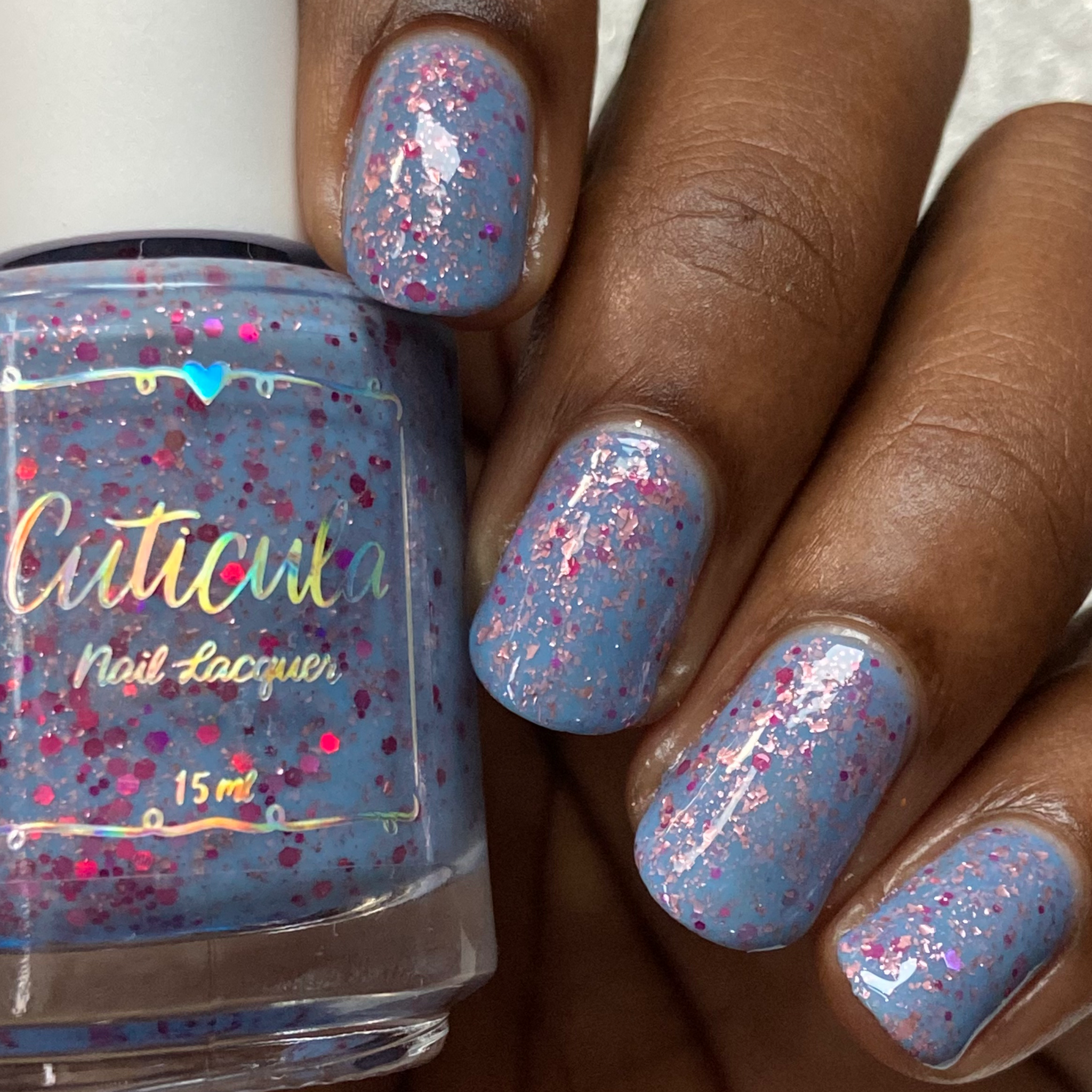 "Love Is In The Air" is a dusty baby blue crelly with rose gold metallic flakes and bright pink holographic flakes in 2 various sizes. It's a little nod to an older HHC called Magic In The Air.