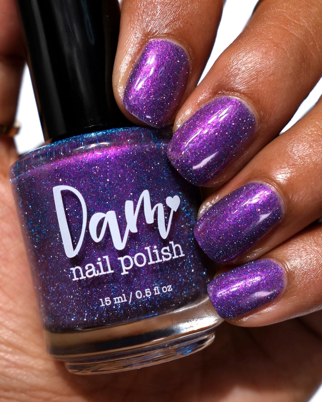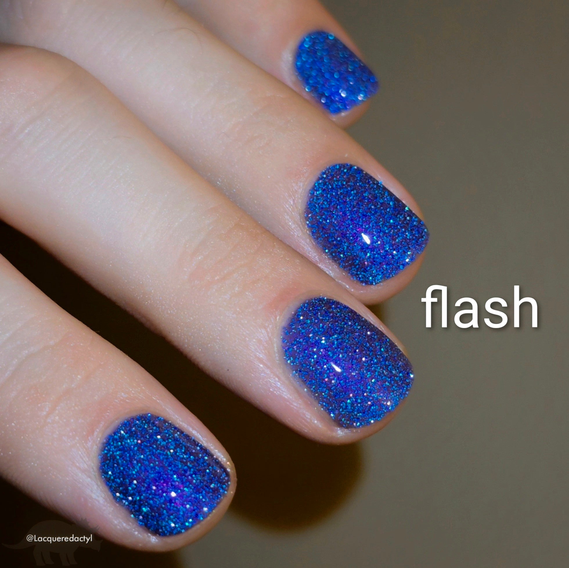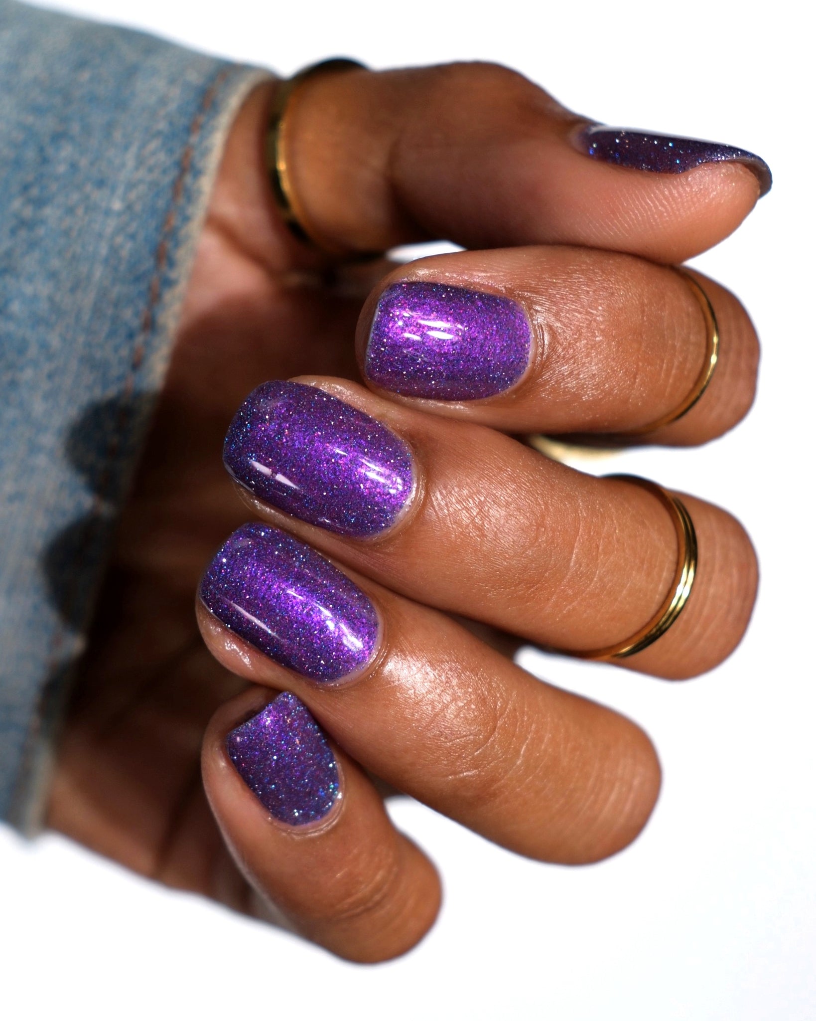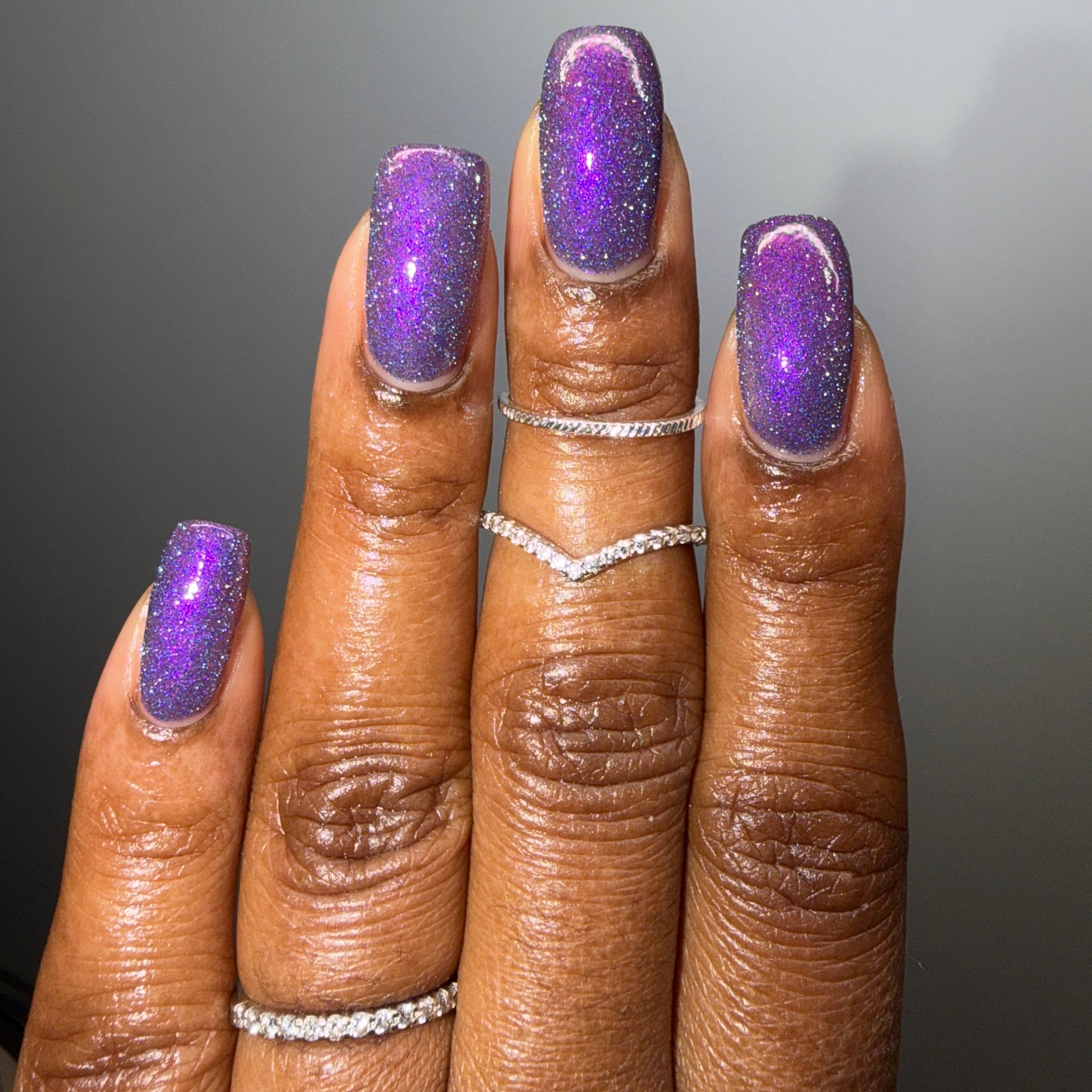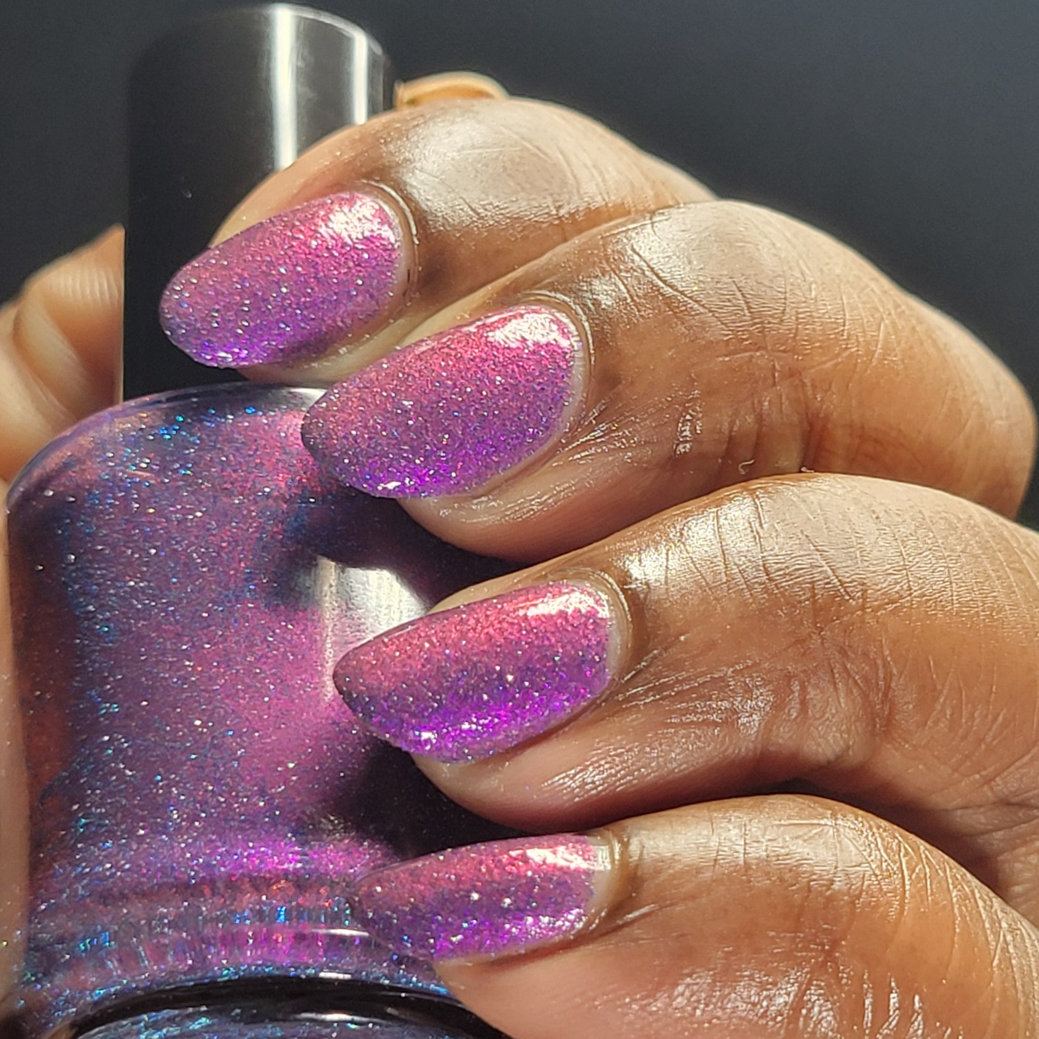 "Rumi" has a deep purple base with purple/pink shifting shimmer and blue/teal reflective glitters.