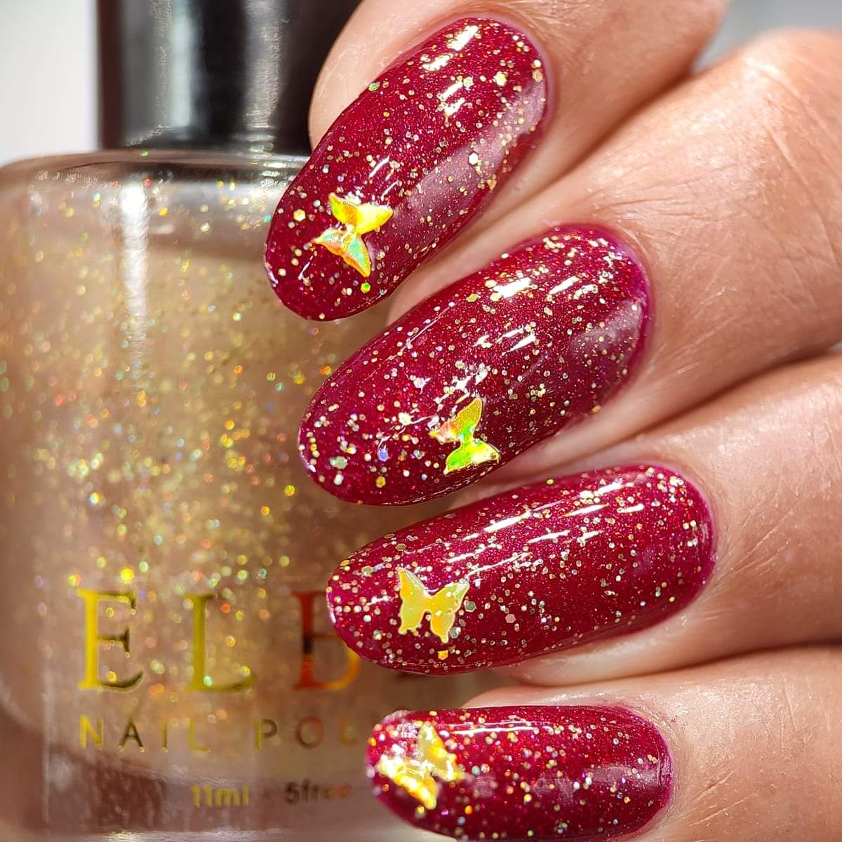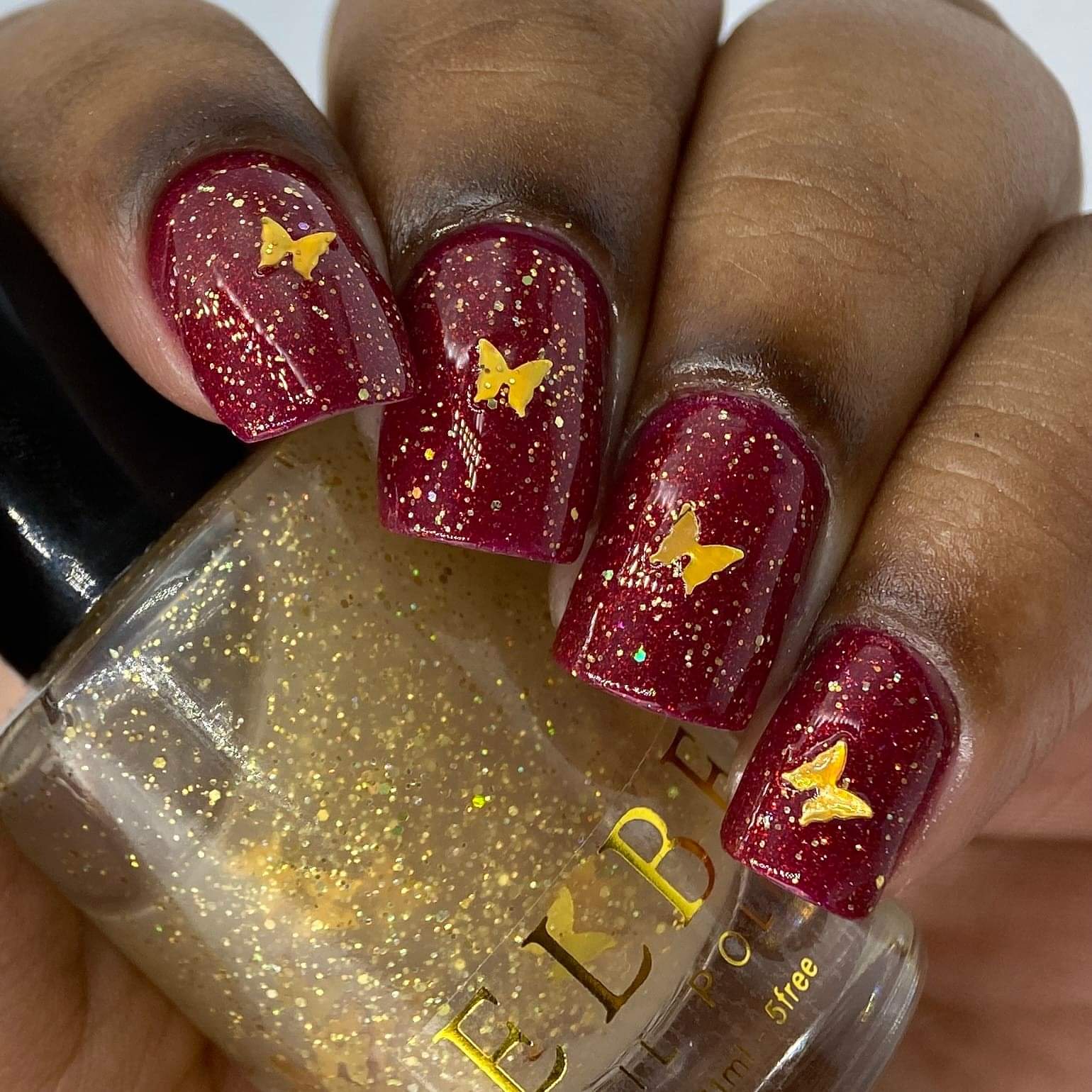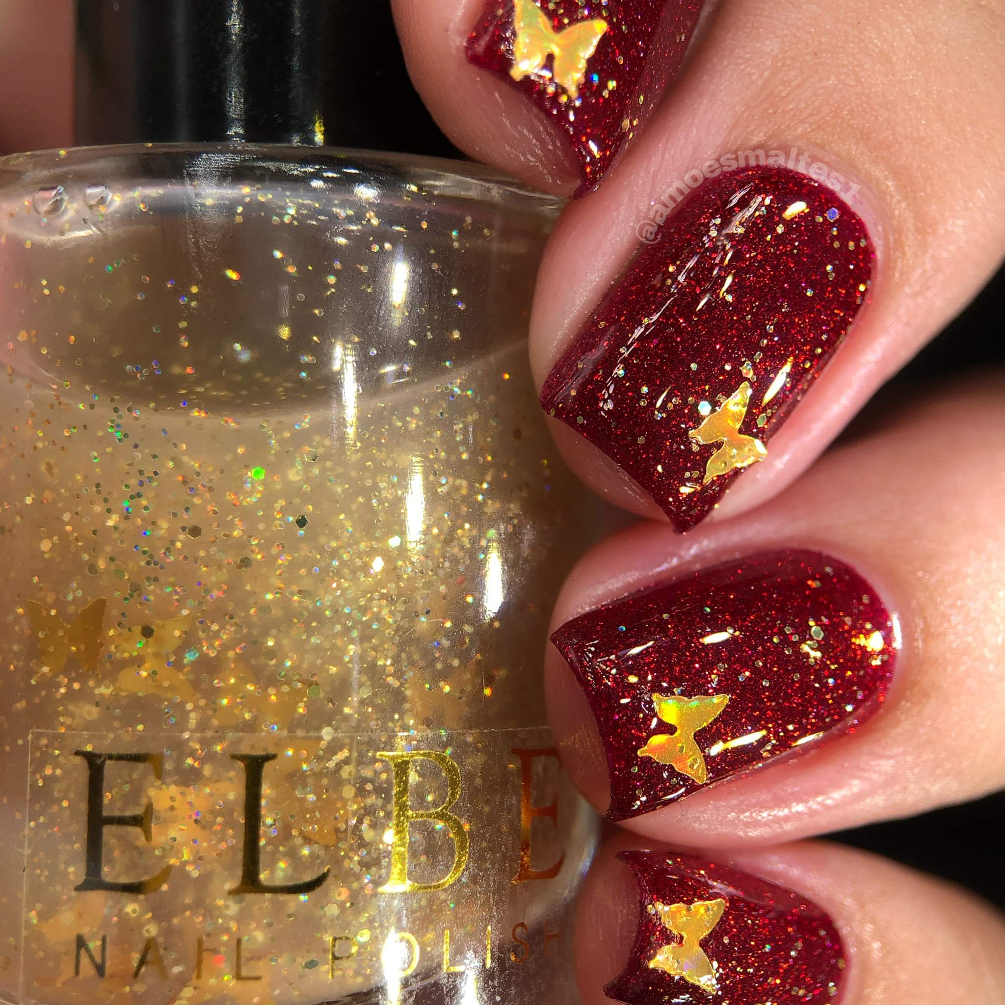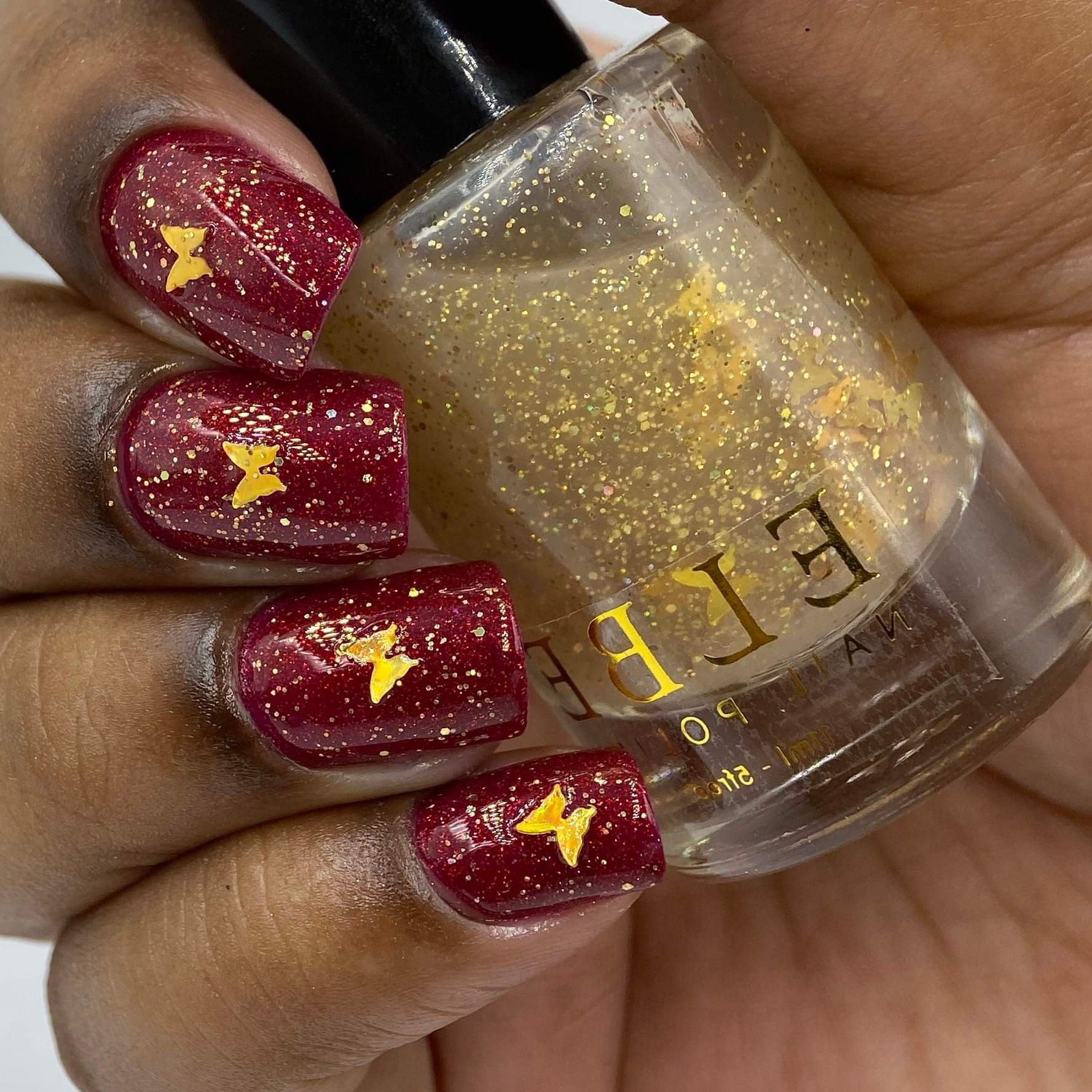 ELBE Nail Polish continues the series inspired by butterflies with "Red Admiral" which is a red Jelly with red reflective glitter and shimmer, and "Heavenly Gold" which is a mixed glitter gold holo topper with gold holo butterflies.