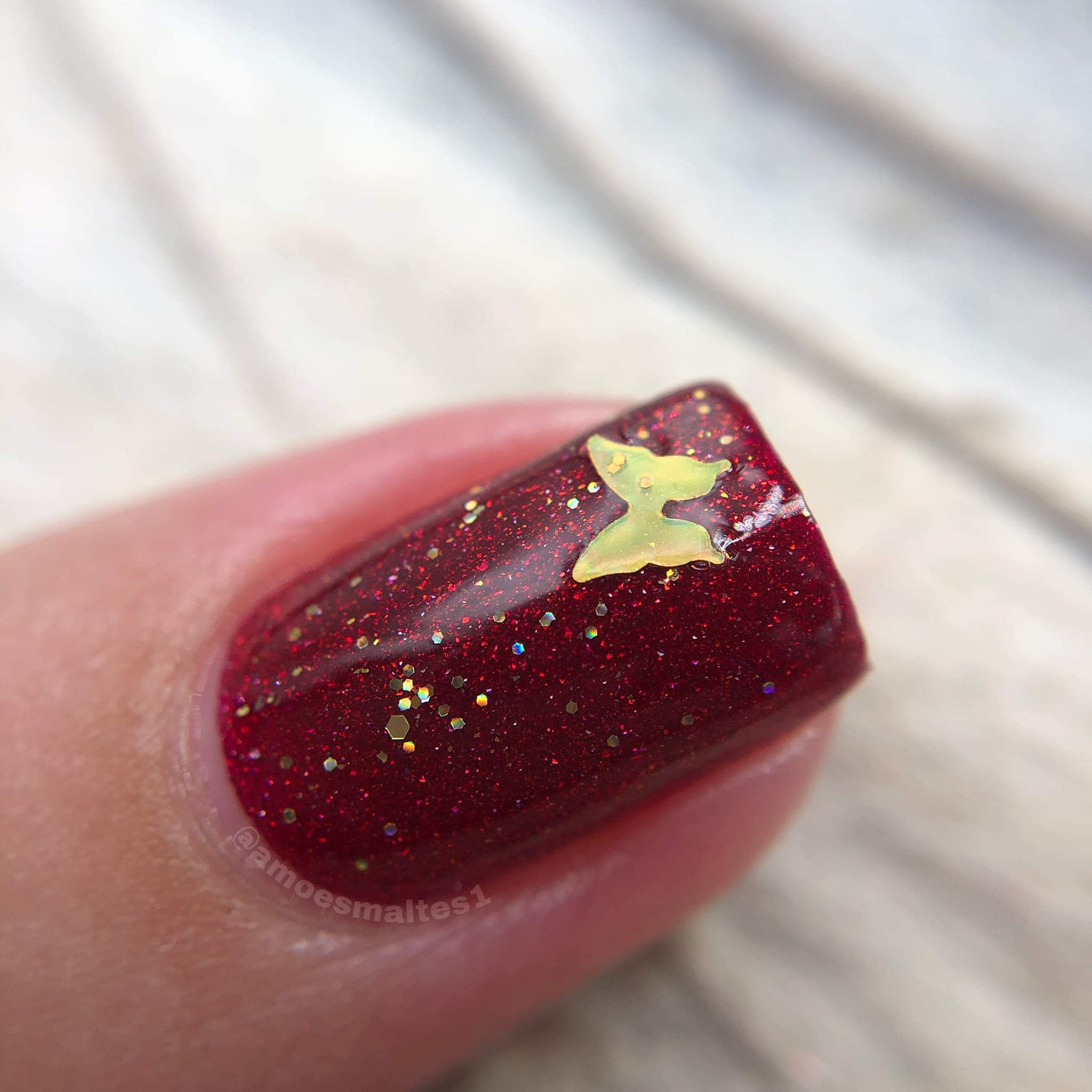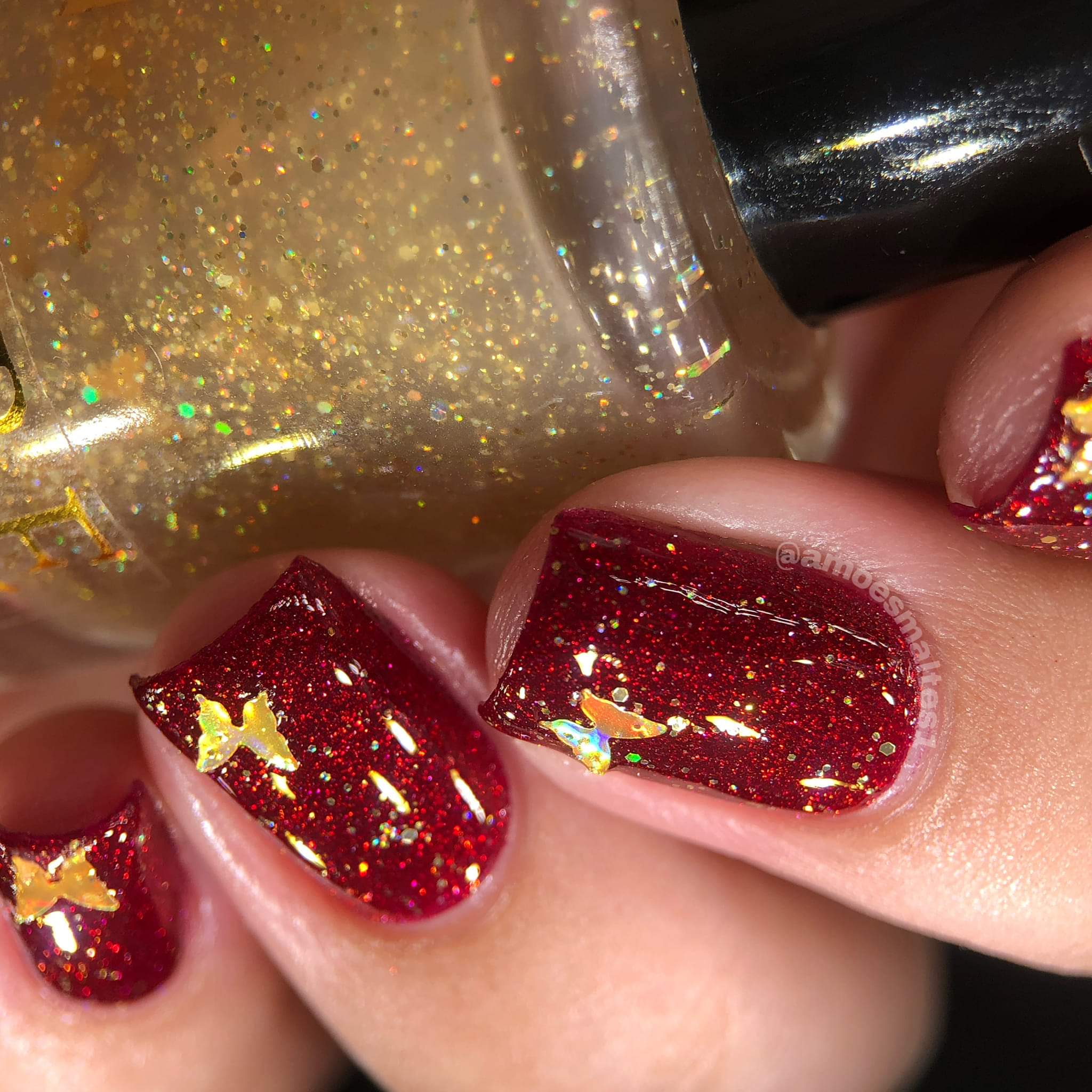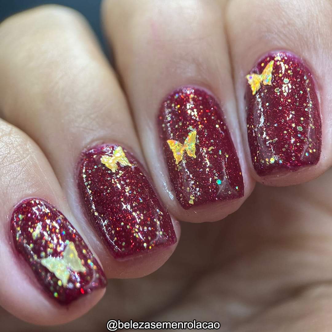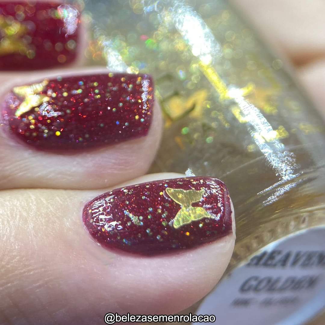 ELBE Nail Polish continues the series inspired by butterflies with "Red Admiral" which is a red Jelly with red reflective glitter and shimmer, and "Heavenly Gold" which is a mixed glitter gold holo topper with gold holo butterflies.