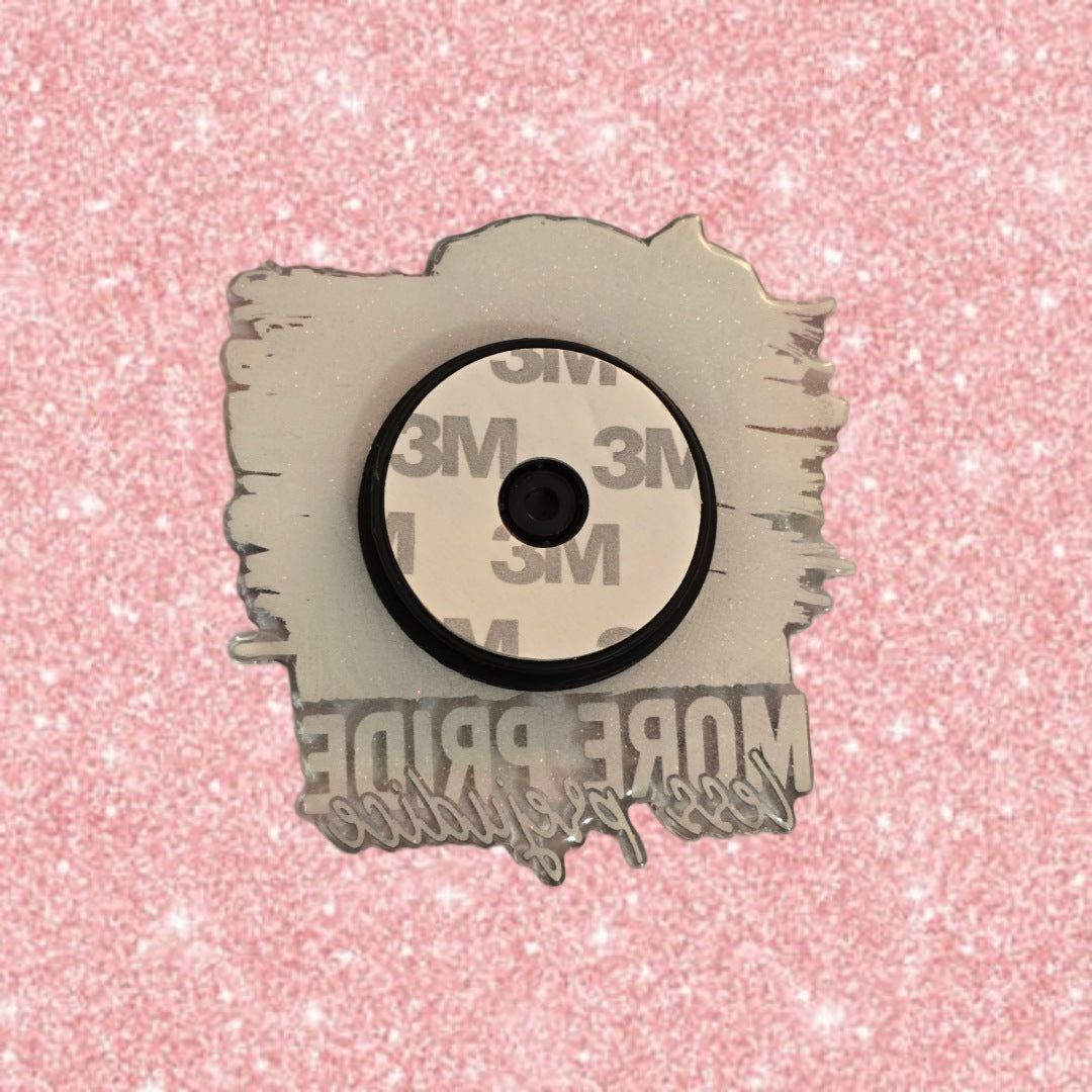 Golly Oodelally Designs is incredibly excited to celebrate Pride month and offers the "More Pride Less Prejudice" phone grip. Acrylic topper measures 2.8 inches wide by 3 inches tall.