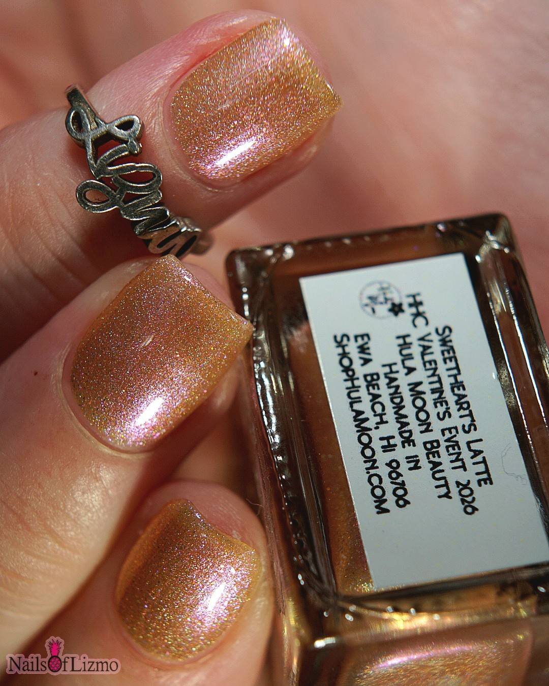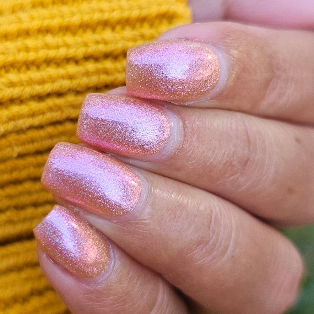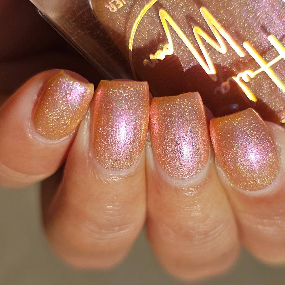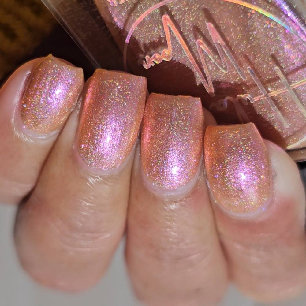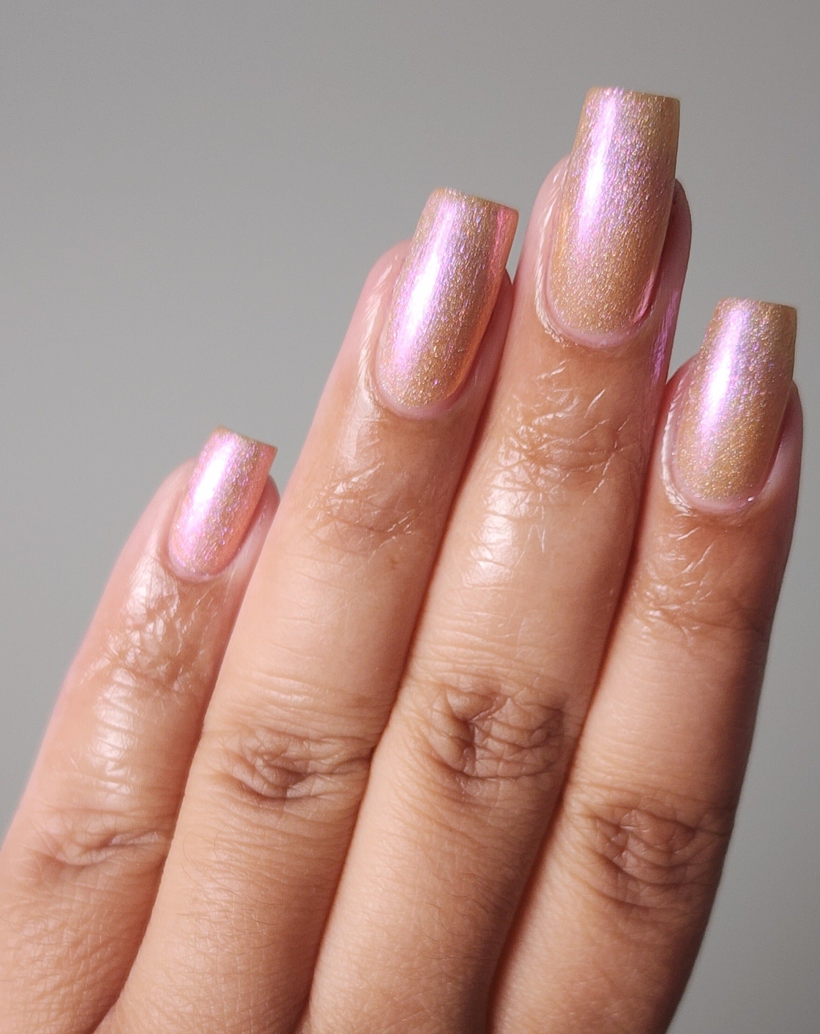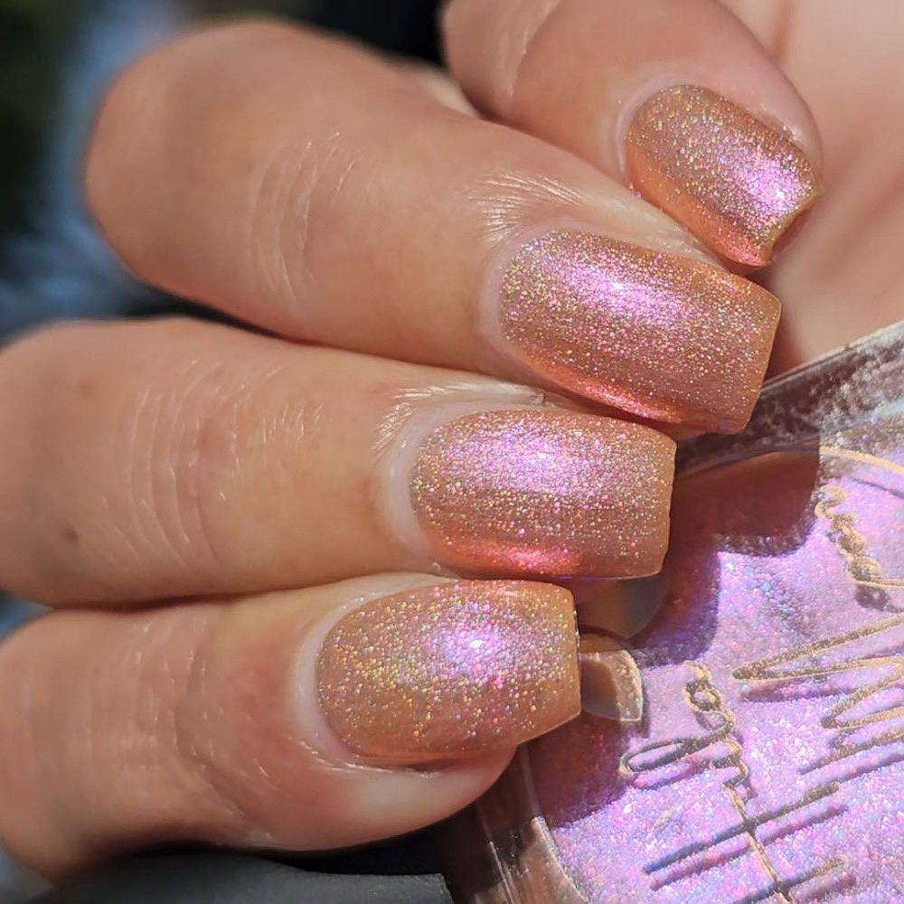 “Sweetheart’s Latte” has a peachy base with pink shimmer that shifts gold at extreme angles and holographic pigment.