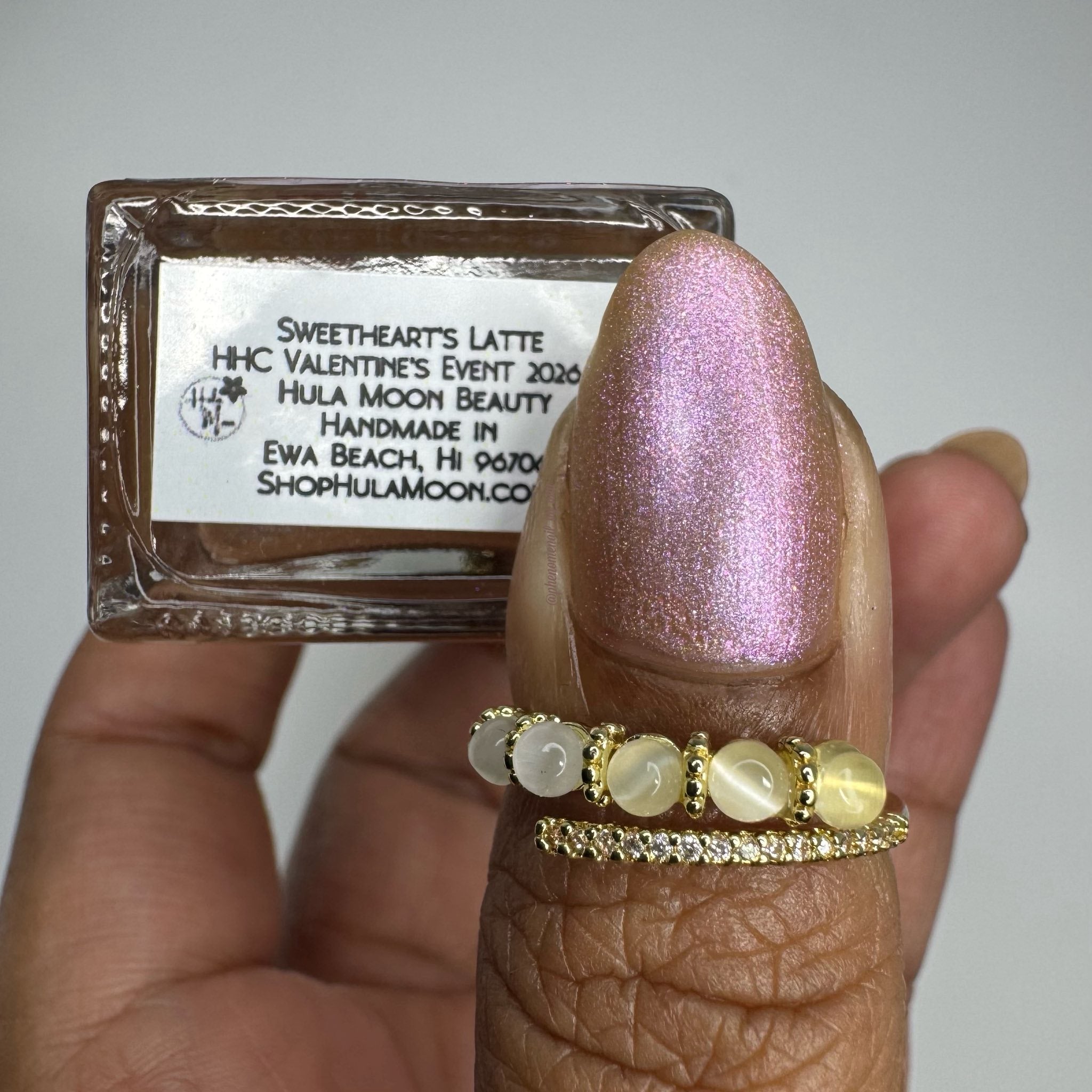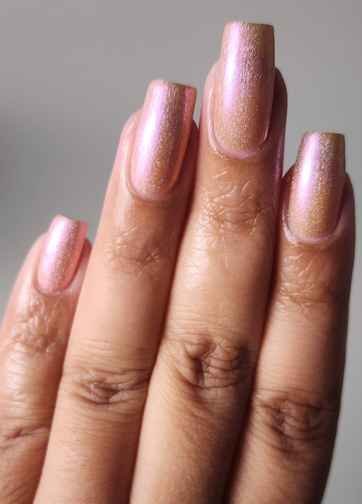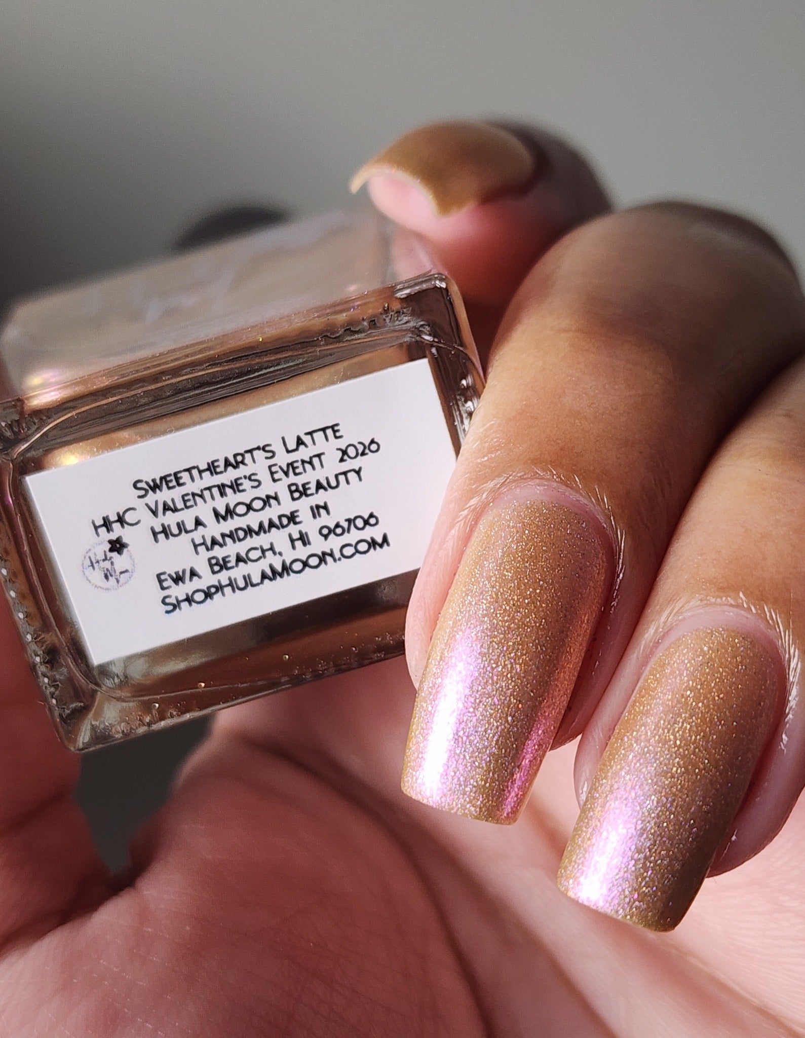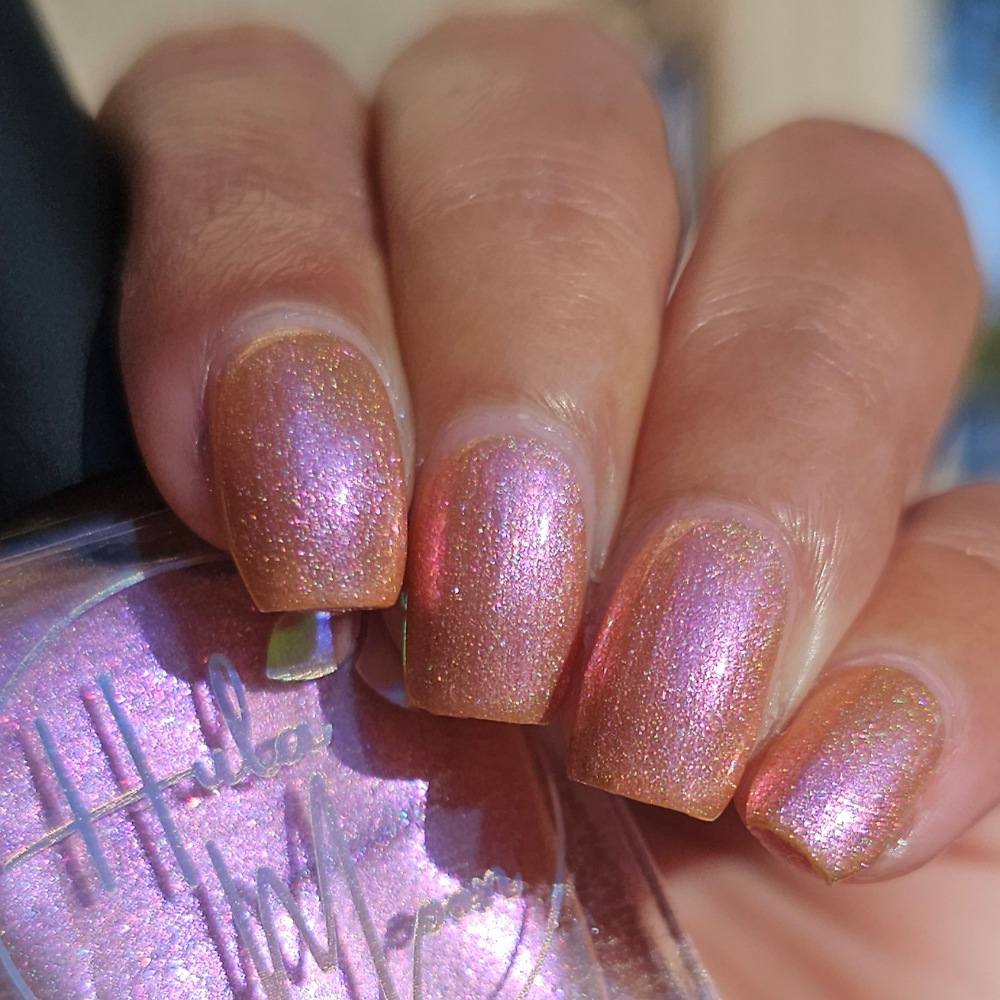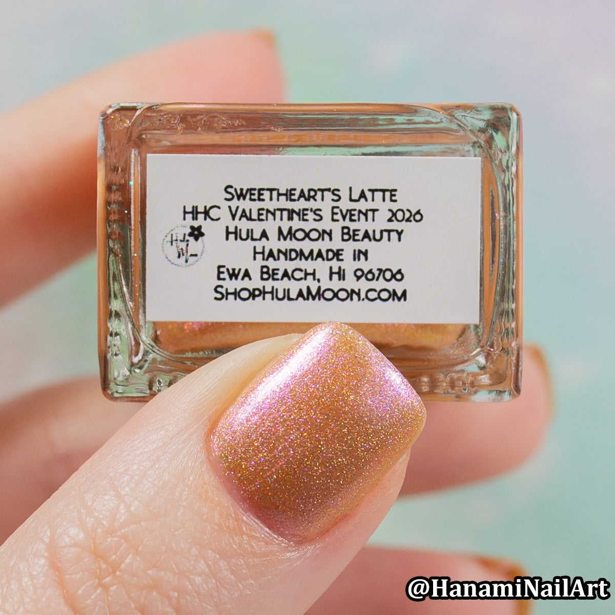 “Sweetheart’s Latte” has a peachy base with pink shimmer that shifts gold at extreme angles and holographic pigment.