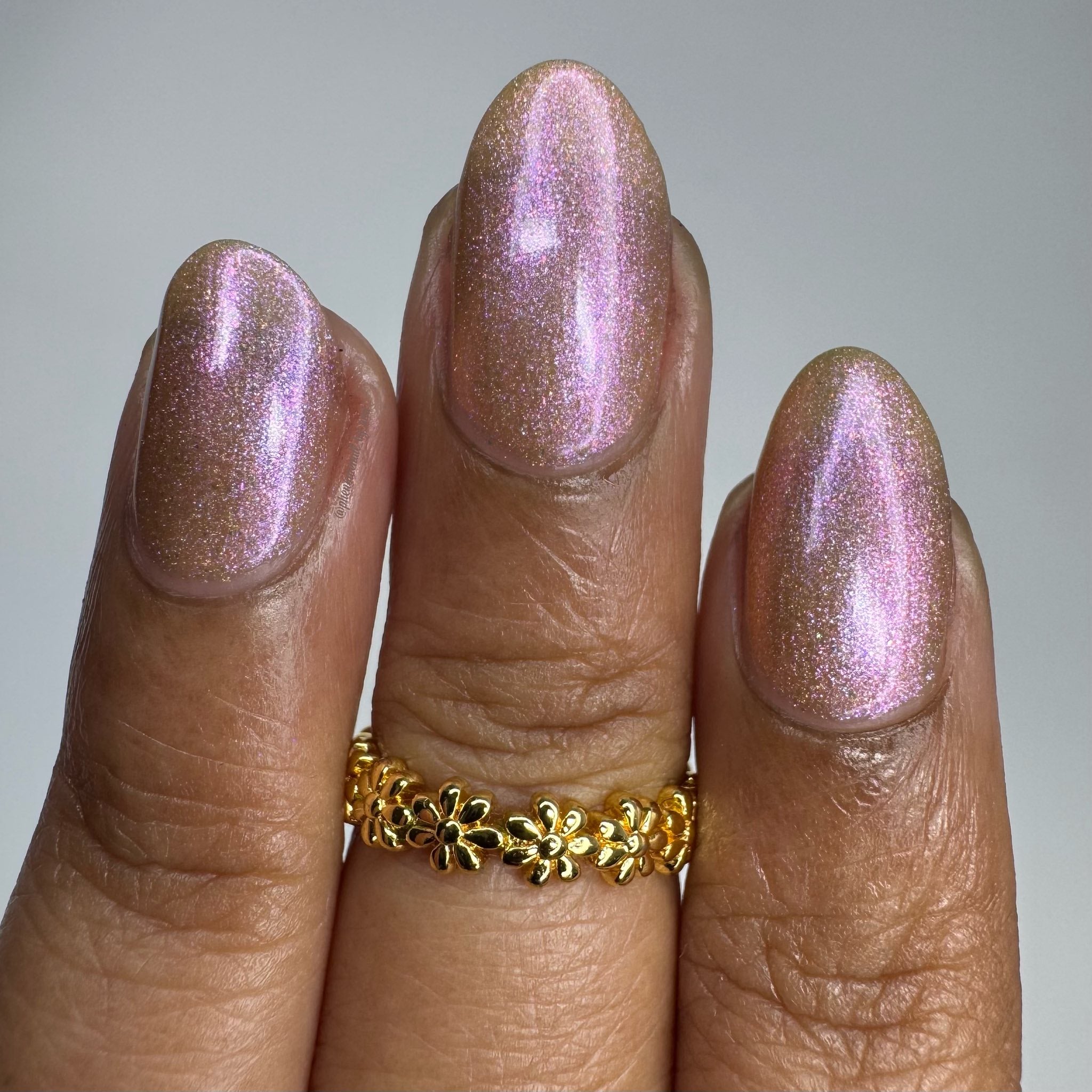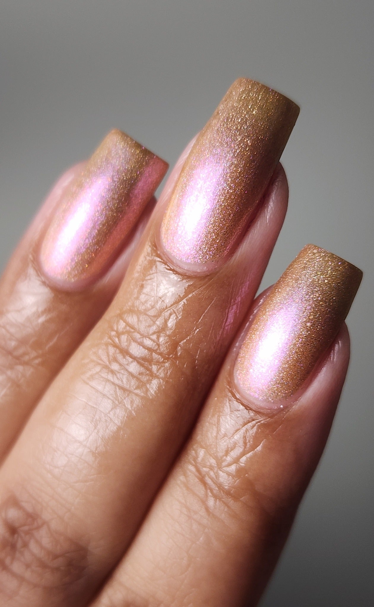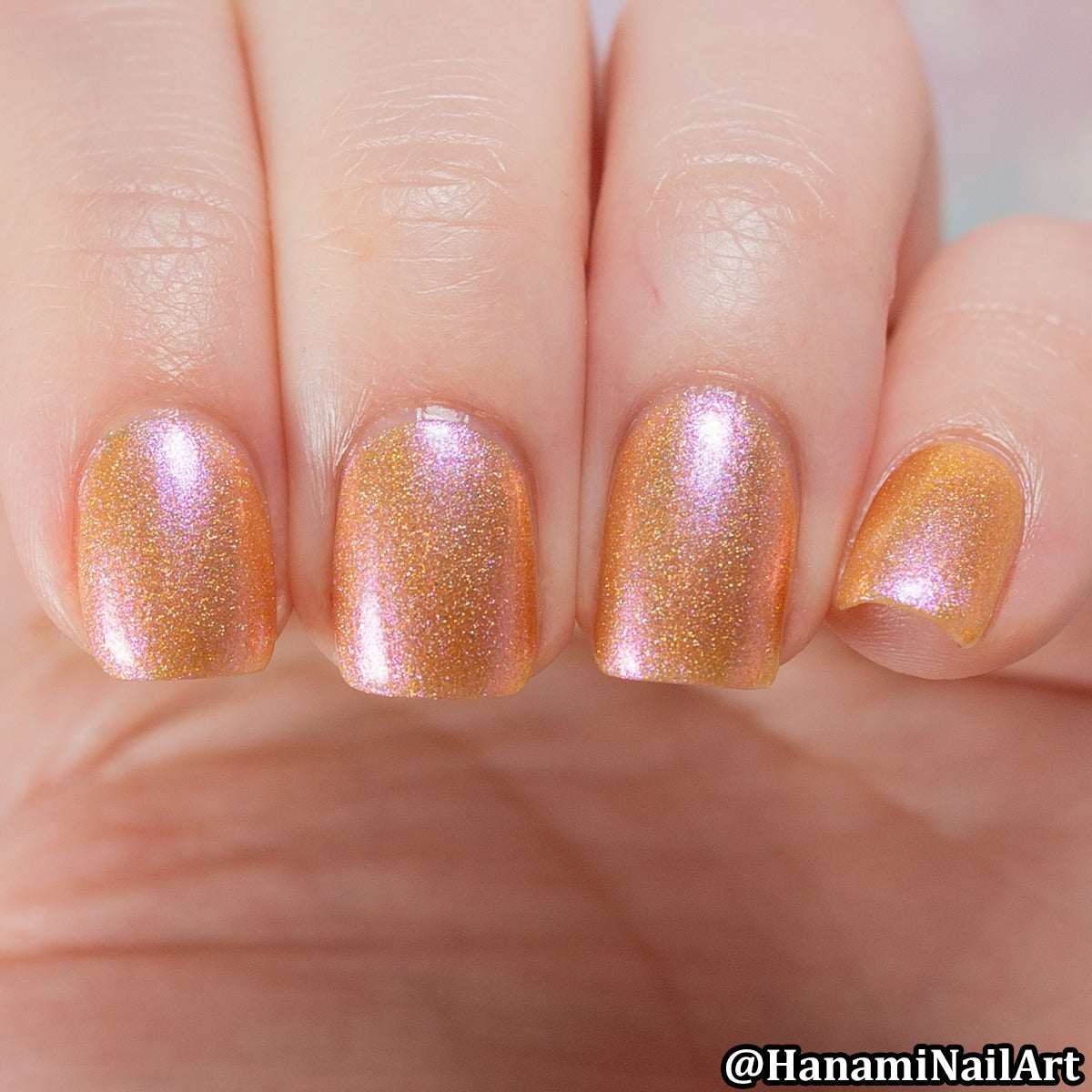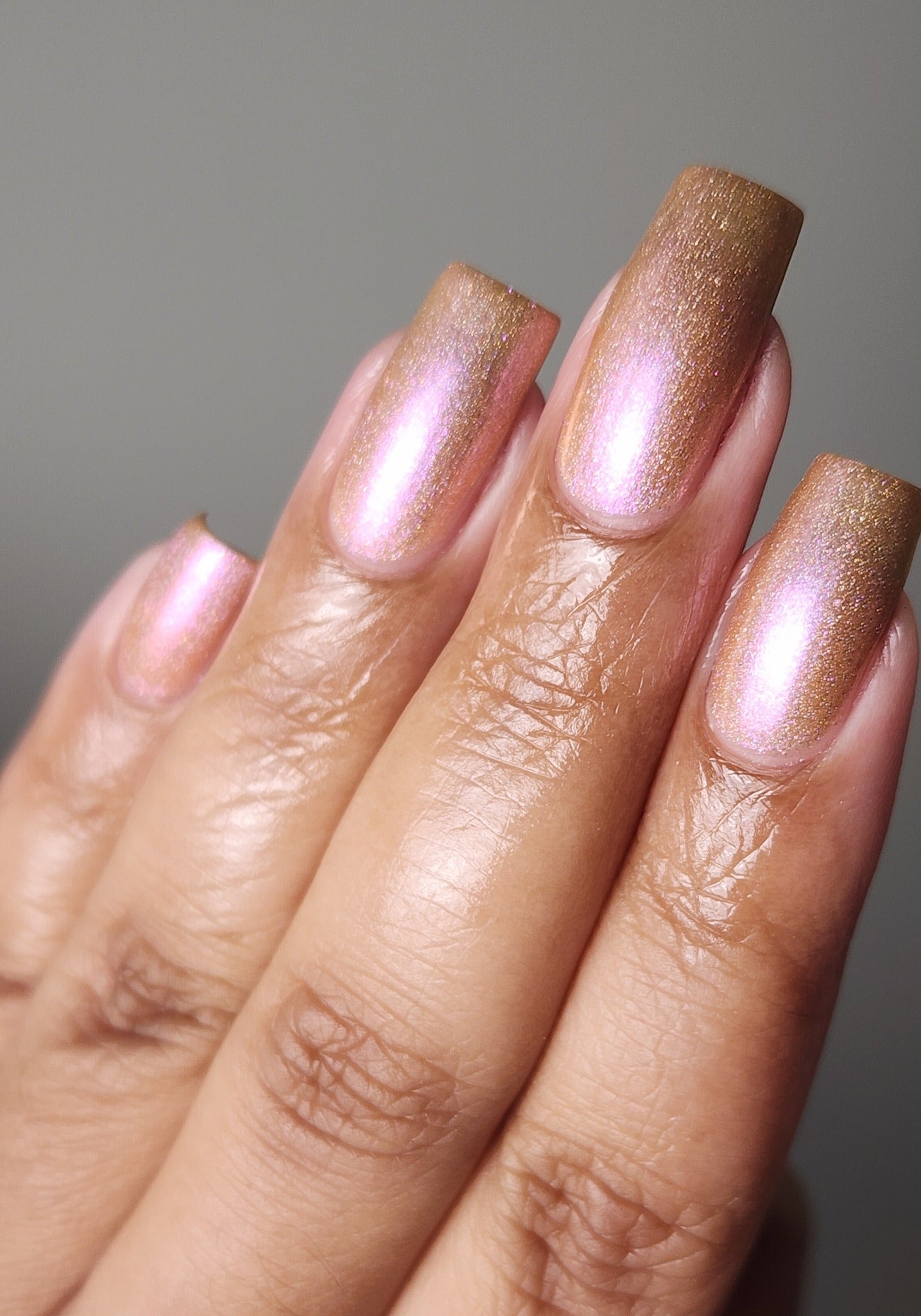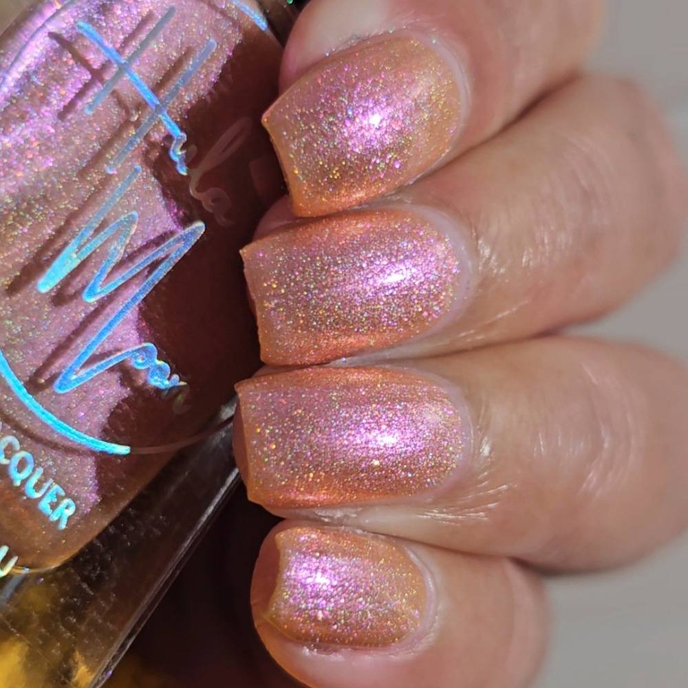 “Sweetheart’s Latte” has a peachy base with pink shimmer that shifts gold at extreme angles and holographic pigment.