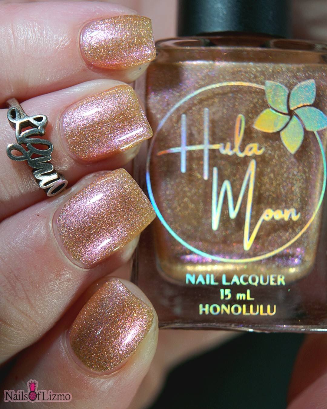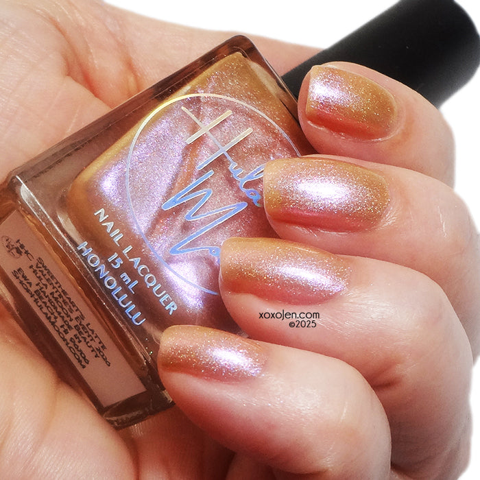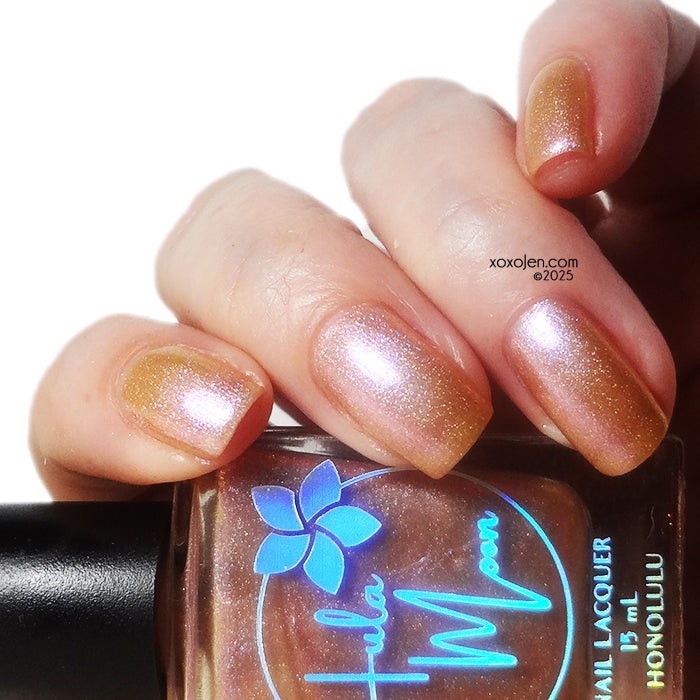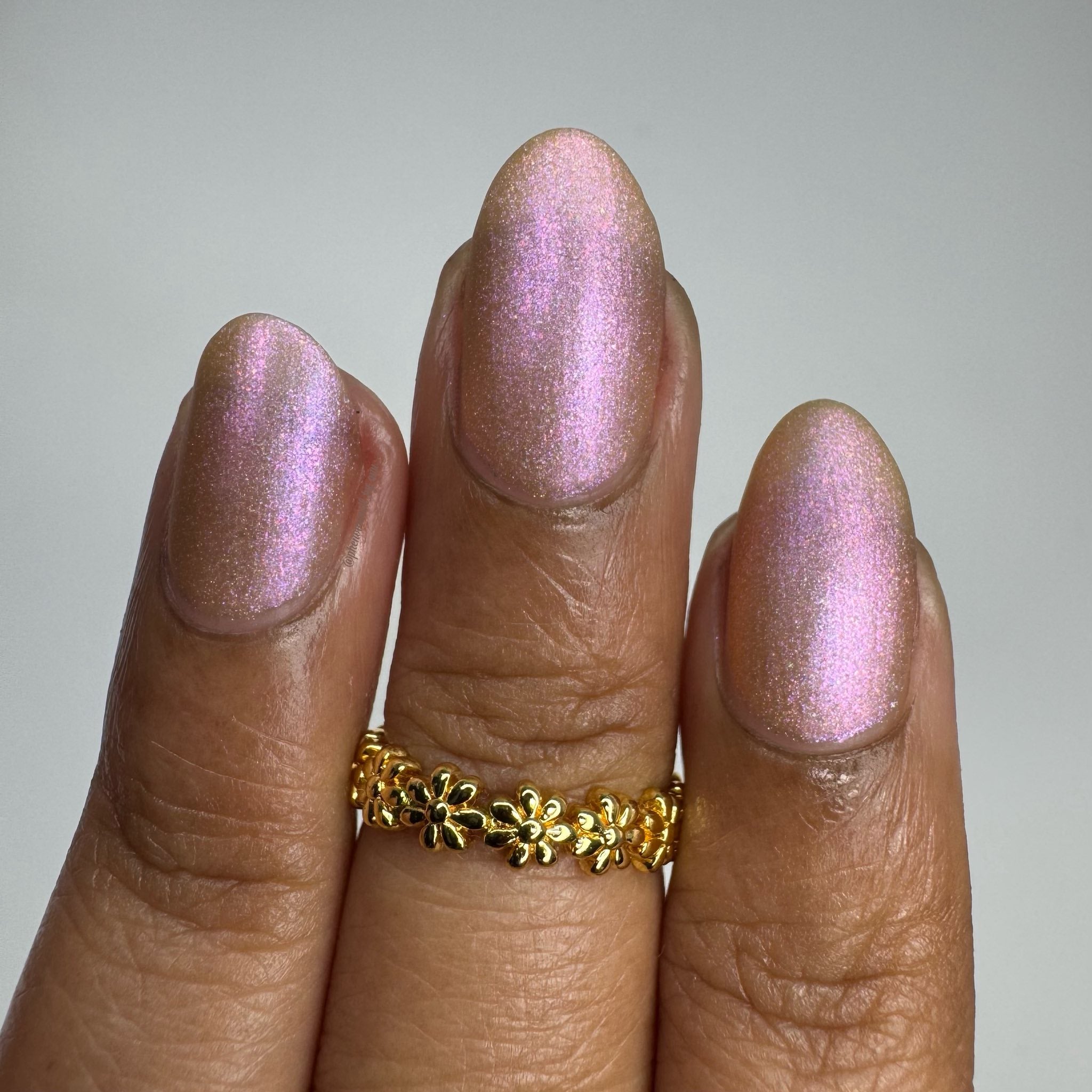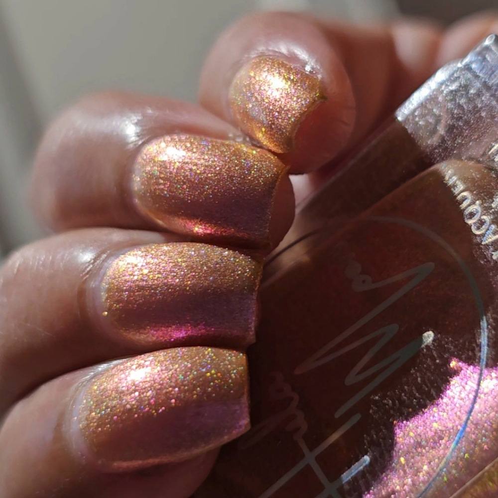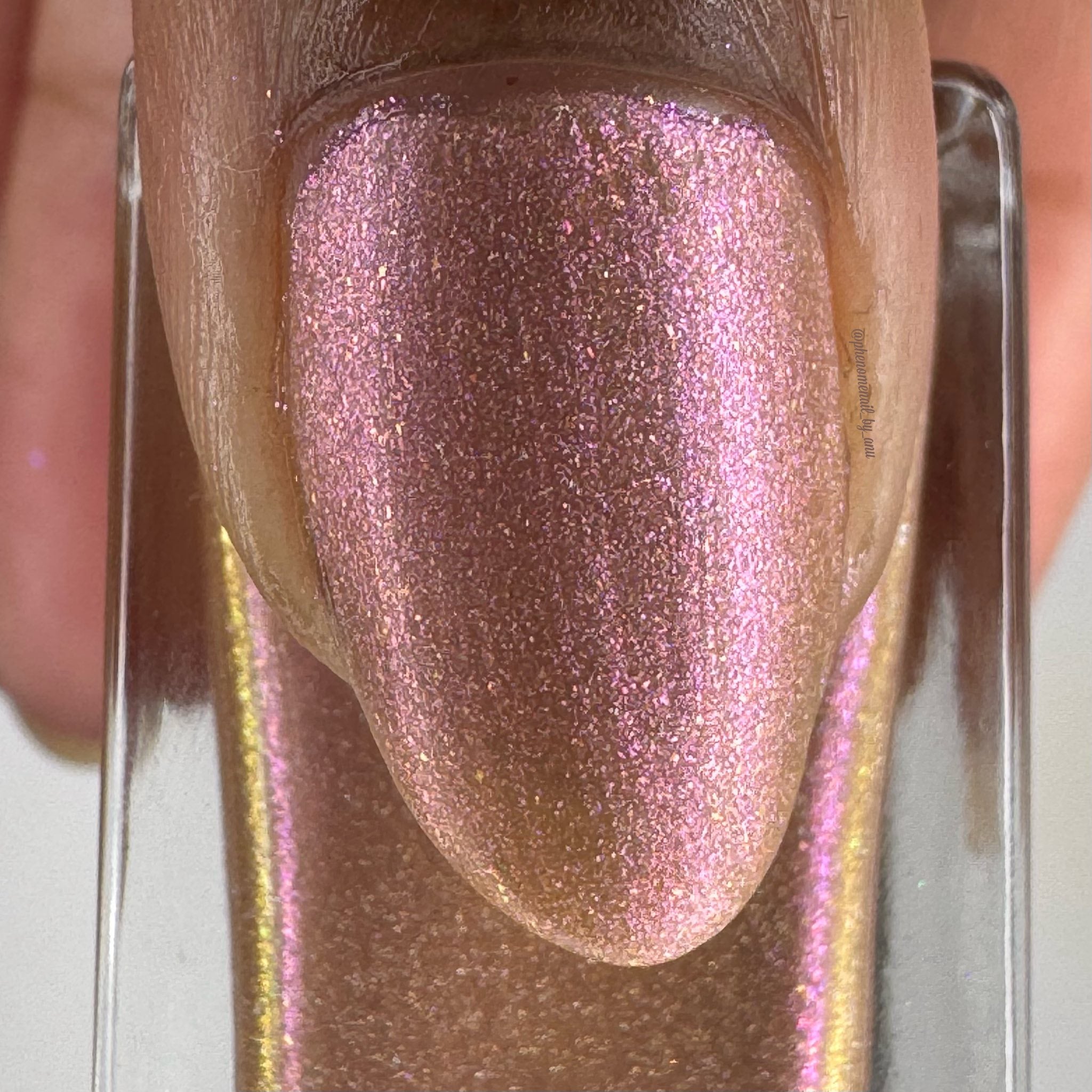 “Sweetheart’s Latte” has a peachy base with pink shimmer that shifts gold at extreme angles and holographic pigment.