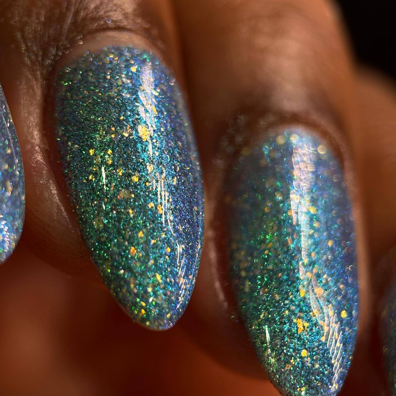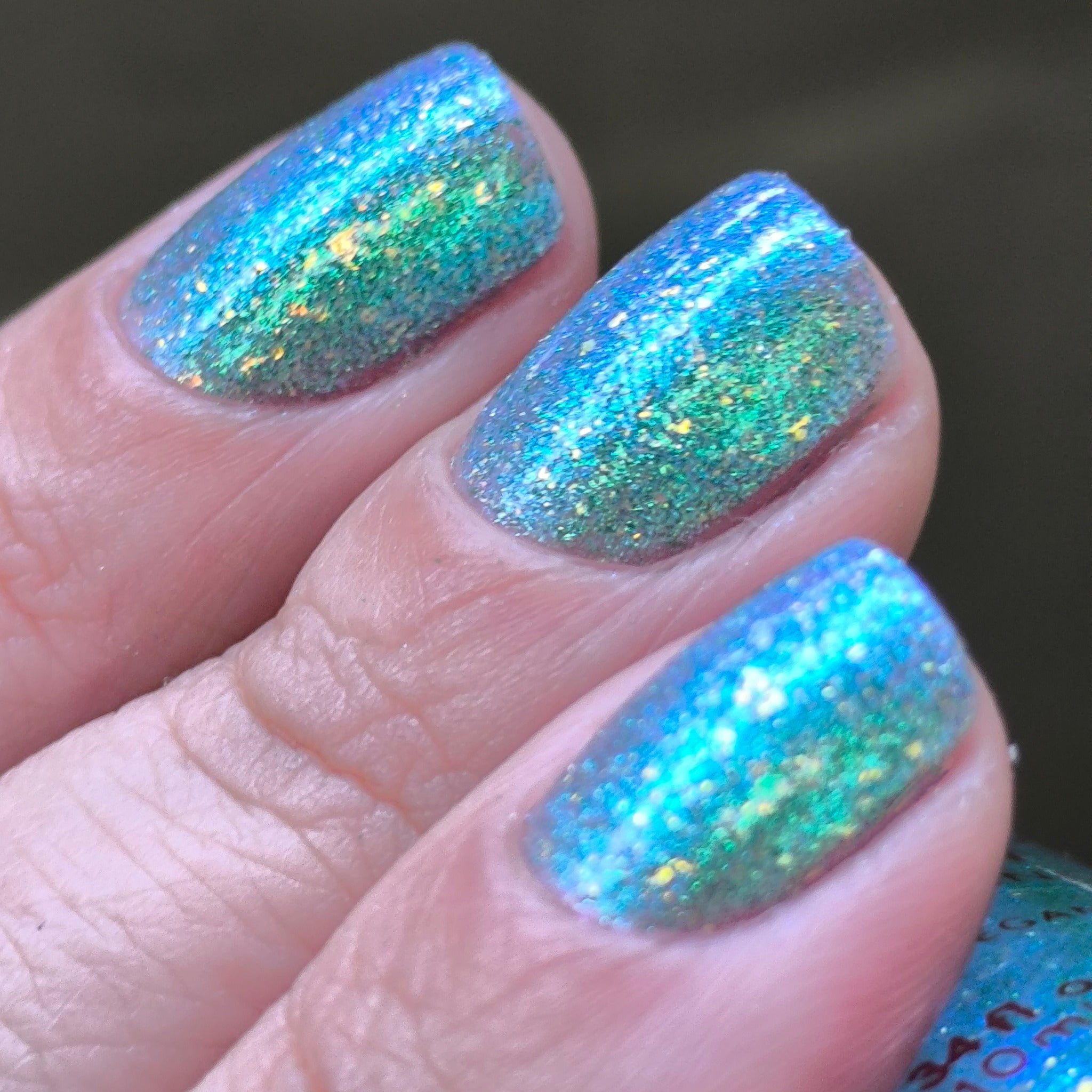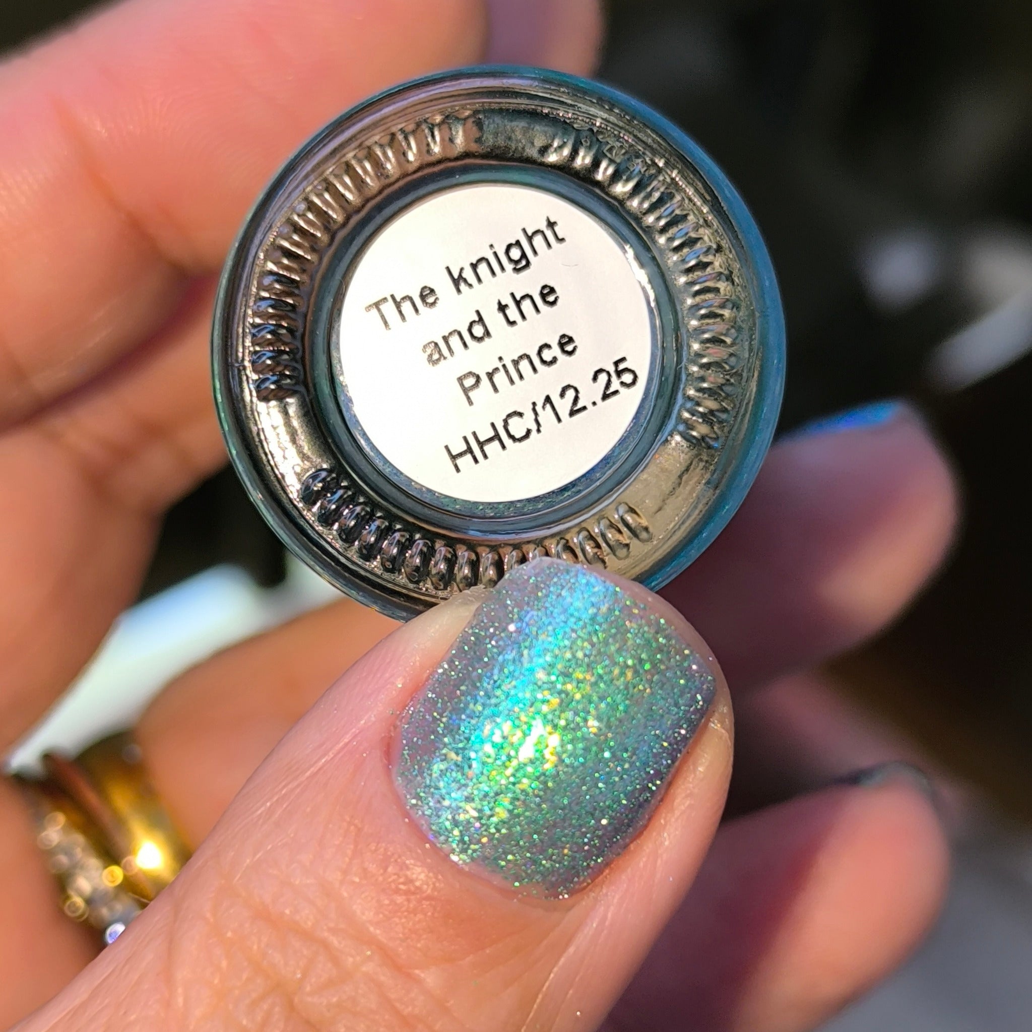 "The Knight and the Prince" Has a blue base with teal/blue aurora shimmer, gold/green iridecent flakies and green reflective glitter.