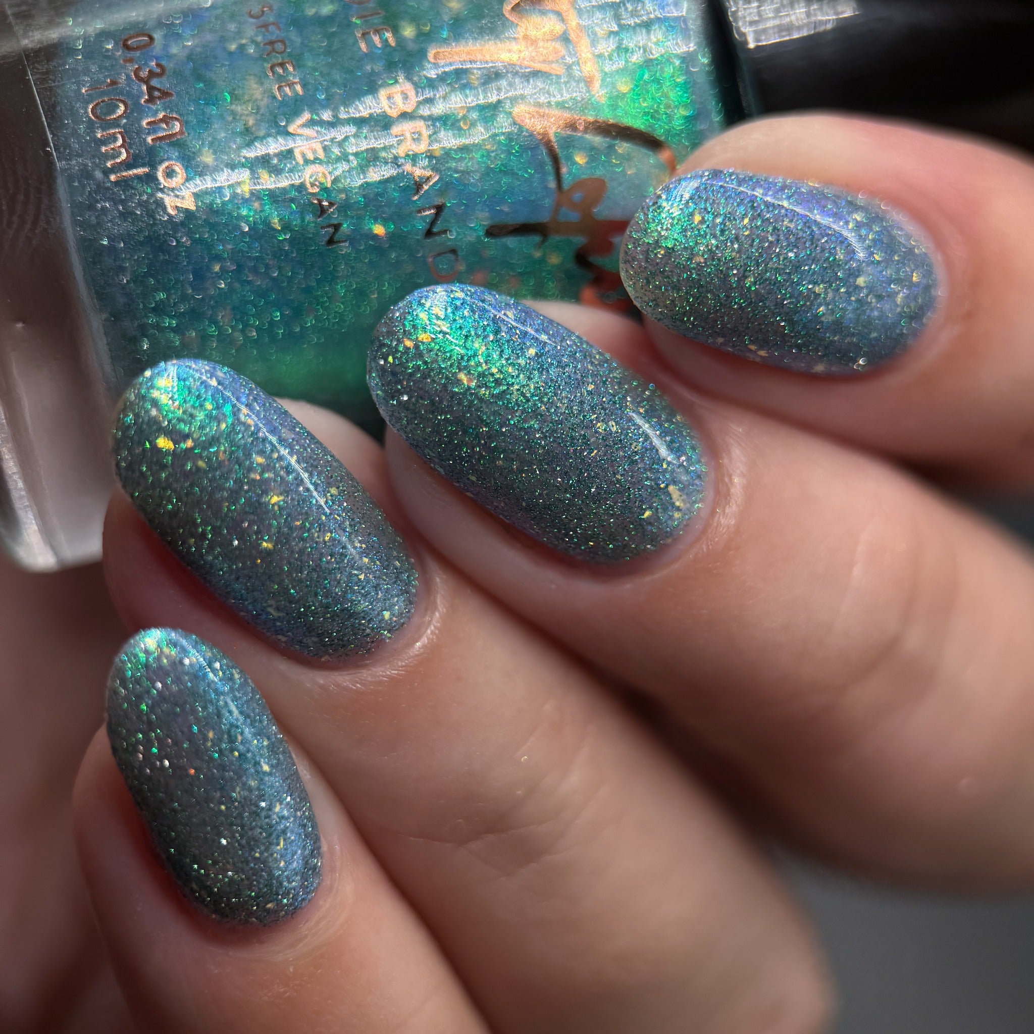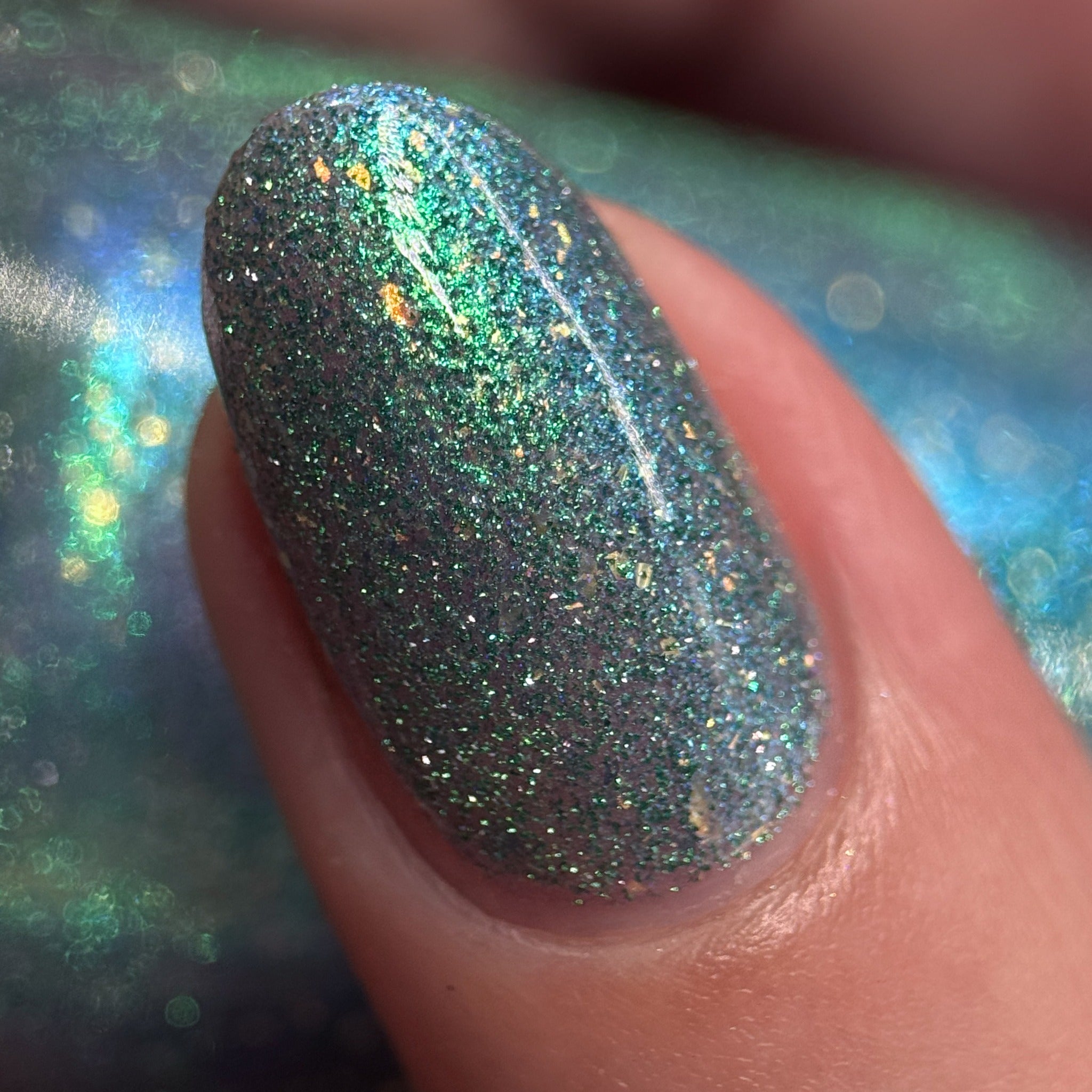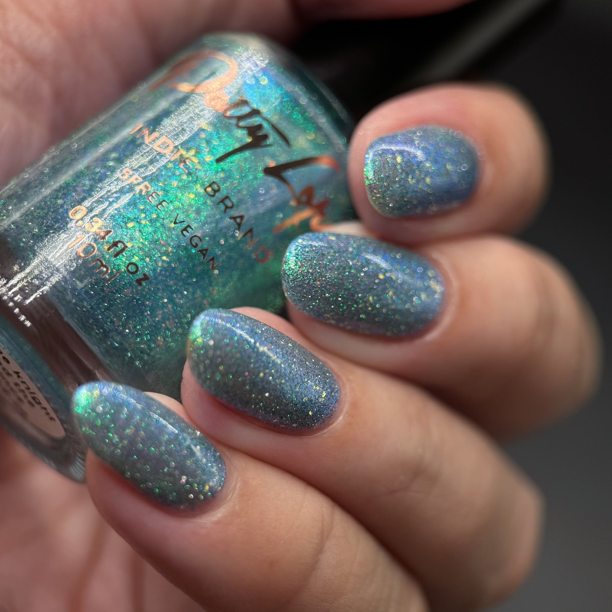 "The Knight and the Prince" Has a blue base with teal/blue aurora shimmer, gold/green iridecent flakies and green reflective glitter.