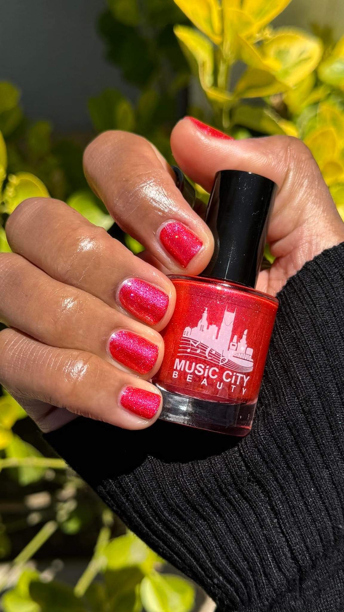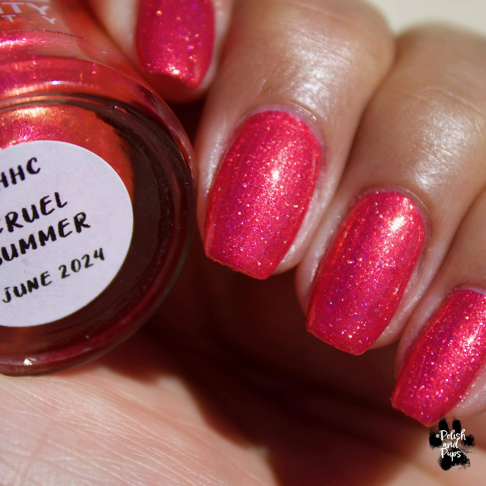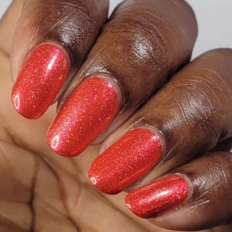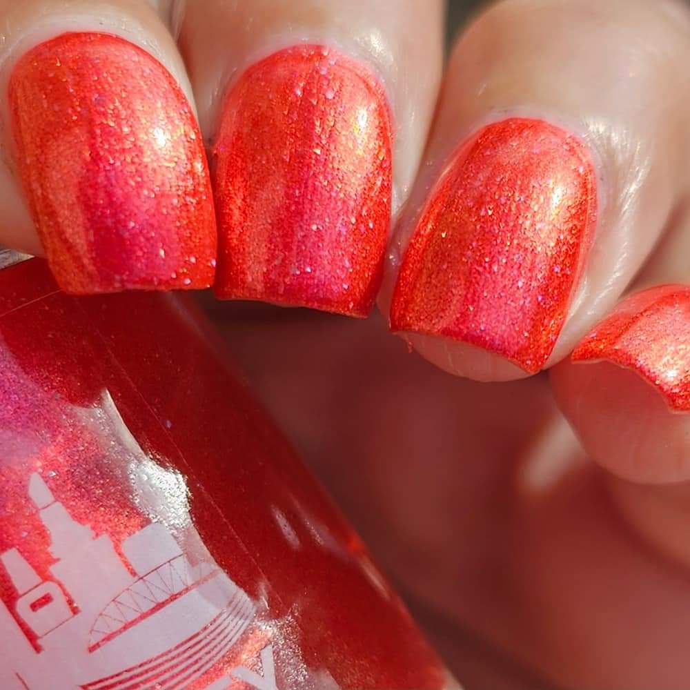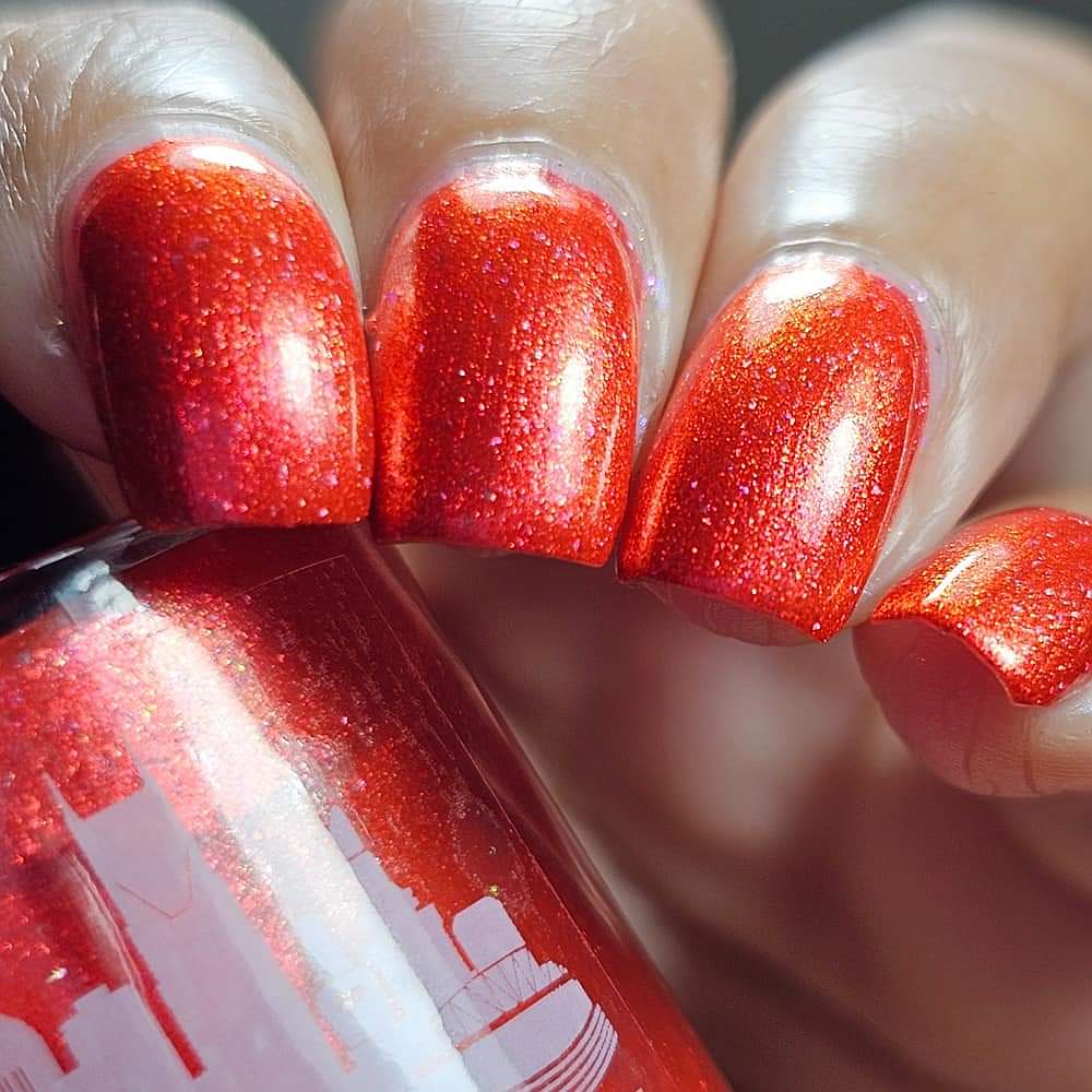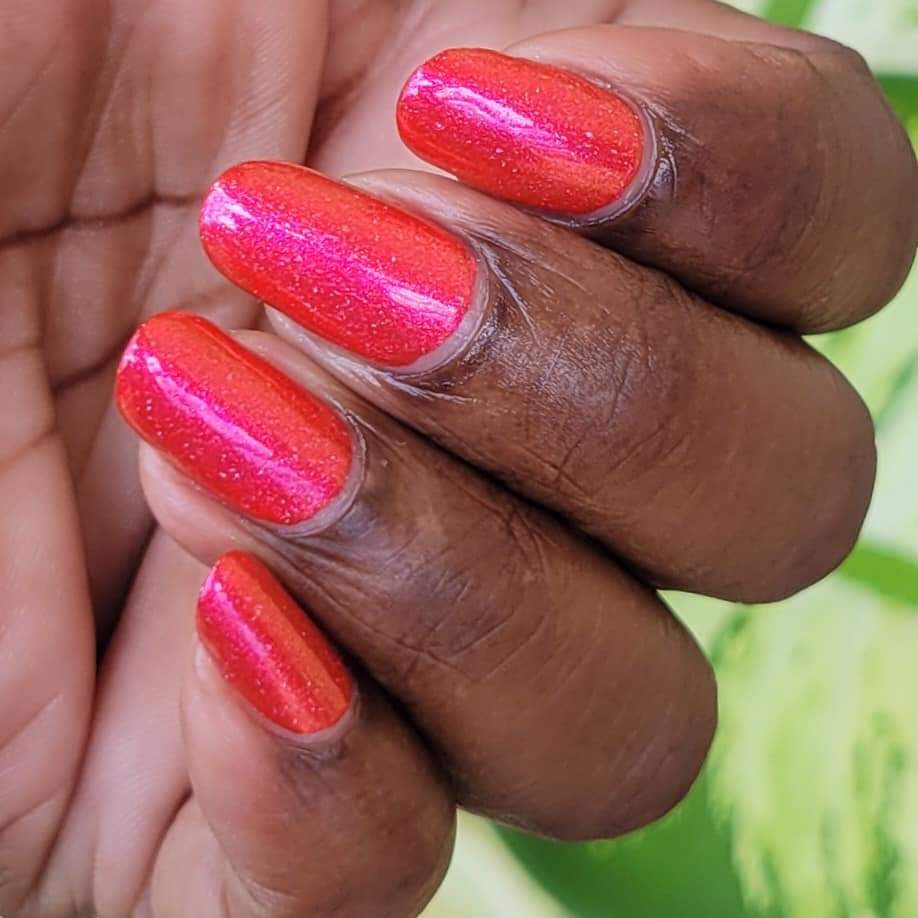 "Cruel Summer" is a vibrant red jelly base with aurora shimmer shifting between pink and orange and silver holographic flakies.