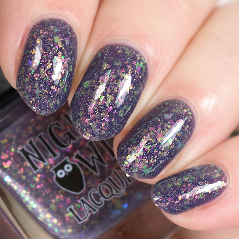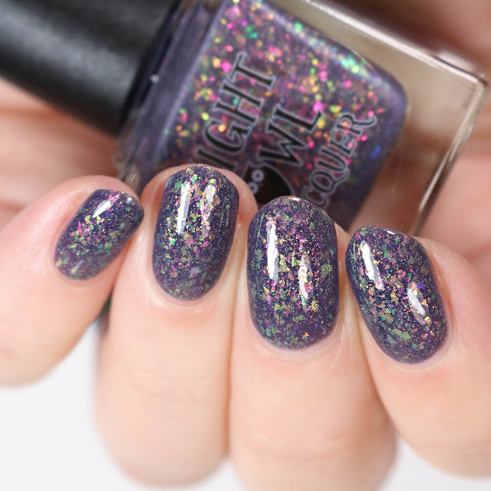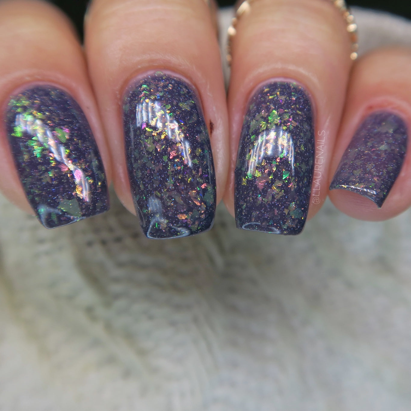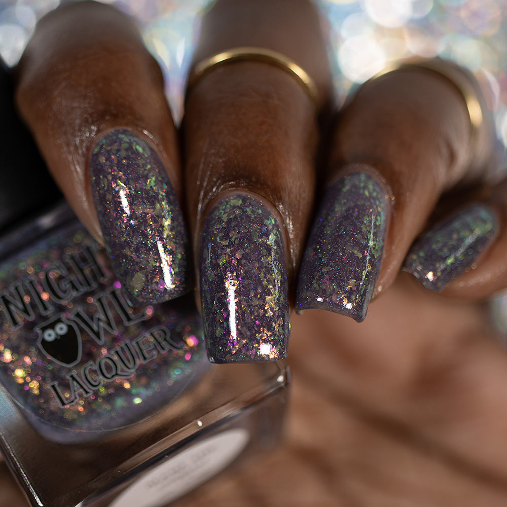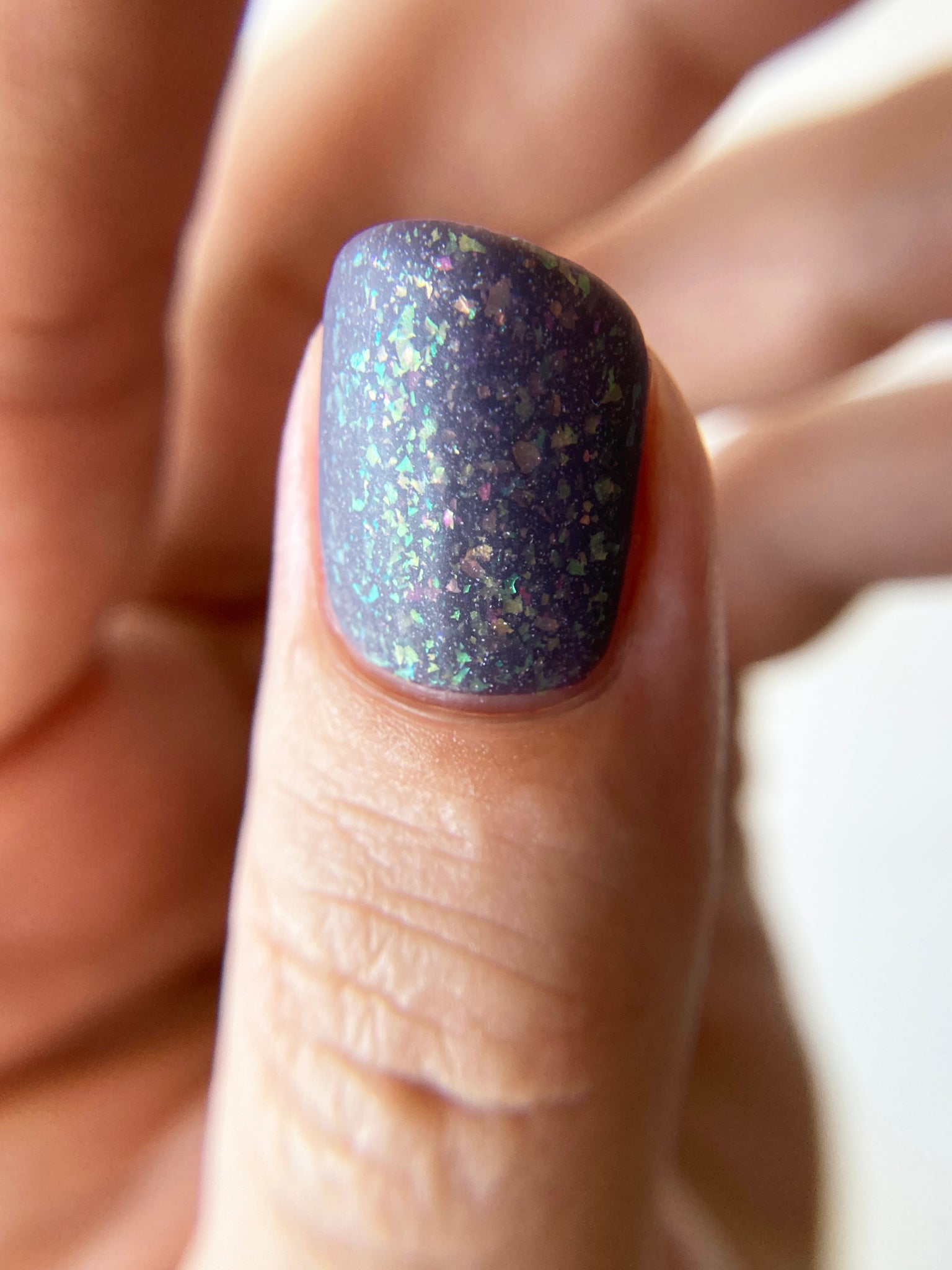 Night Owl Lacquer continues the series inspired by Gilmore Girls with "Alert the Corgis!" which is a greyed dark violet filled with rainbow shifting crystal chameleon flakes and holographic flecks.