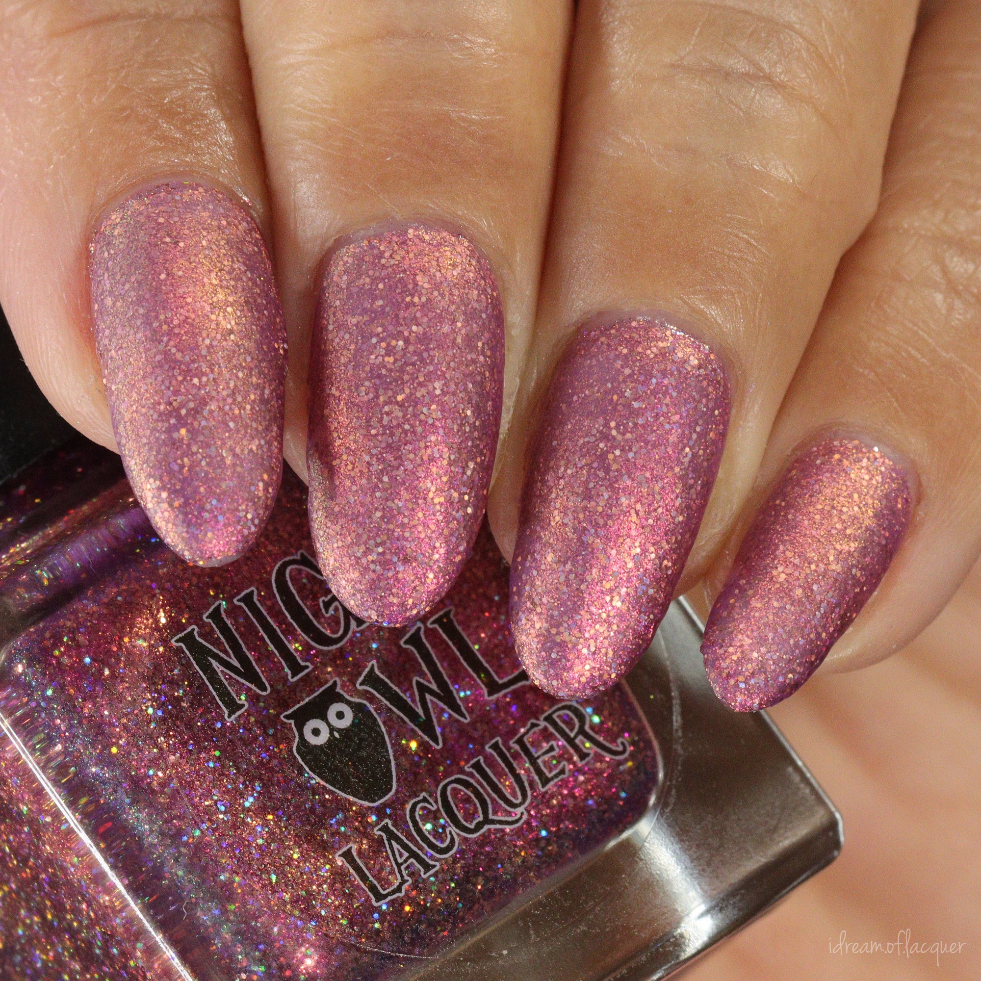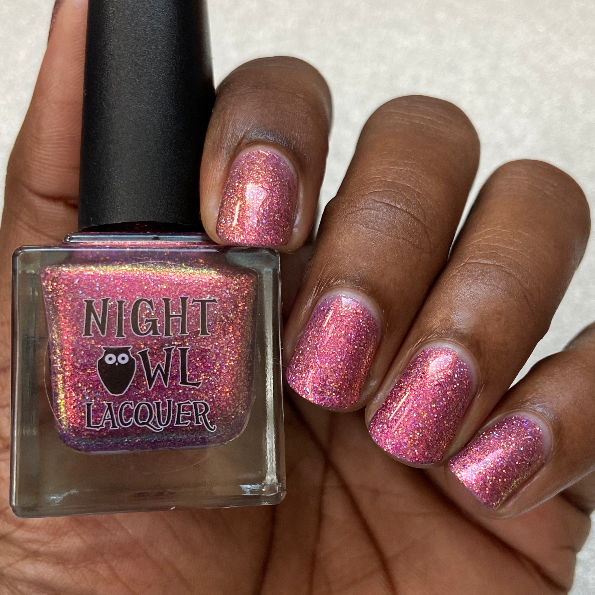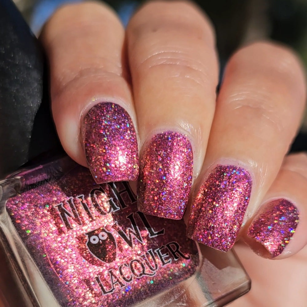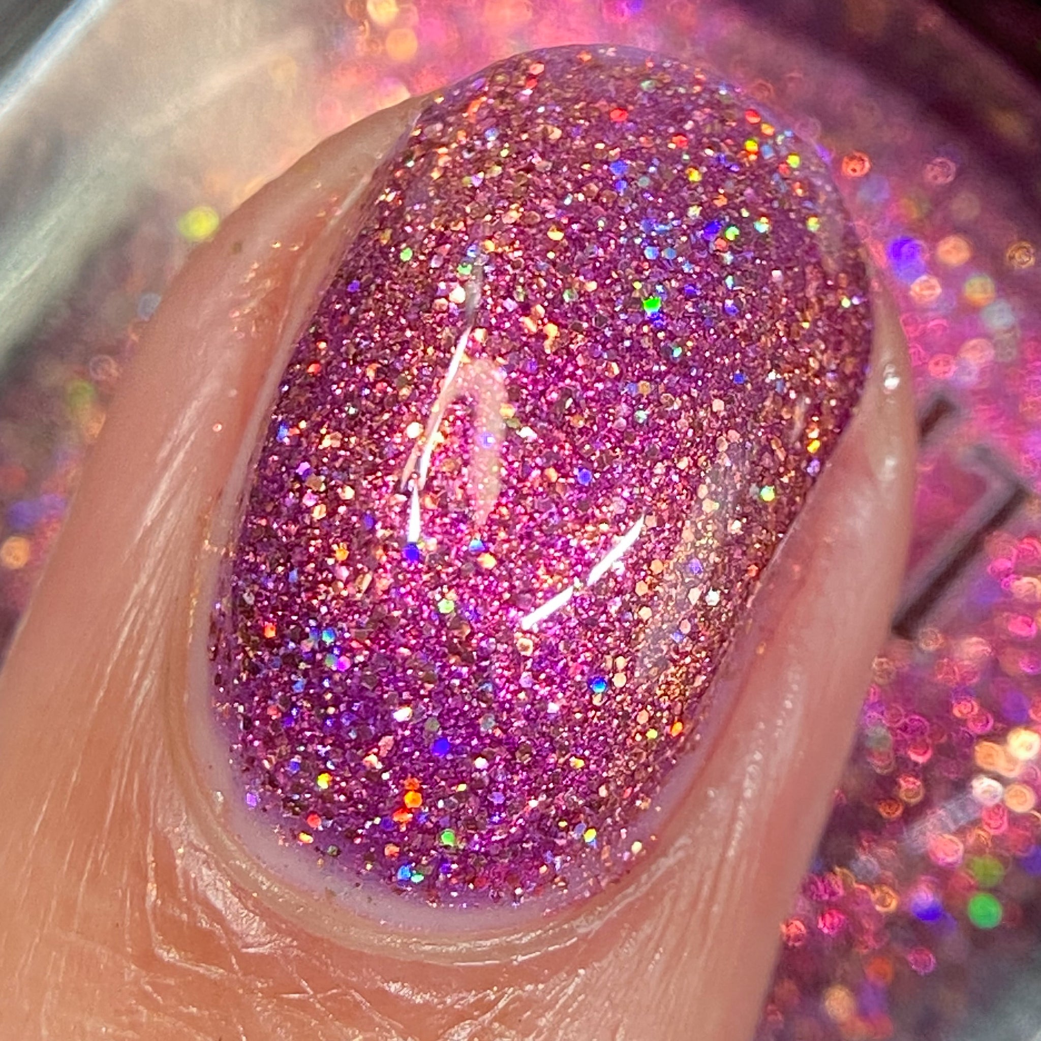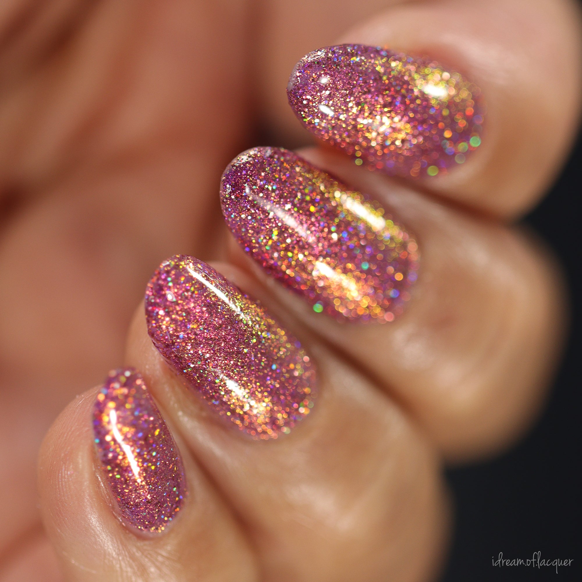 "Still Got 2 out of 5 Sexy Parts" has a purple tinted base filled with glowy shimmer that shifts magenta/orange/yellow and rose gold holographic micro glitter flake.