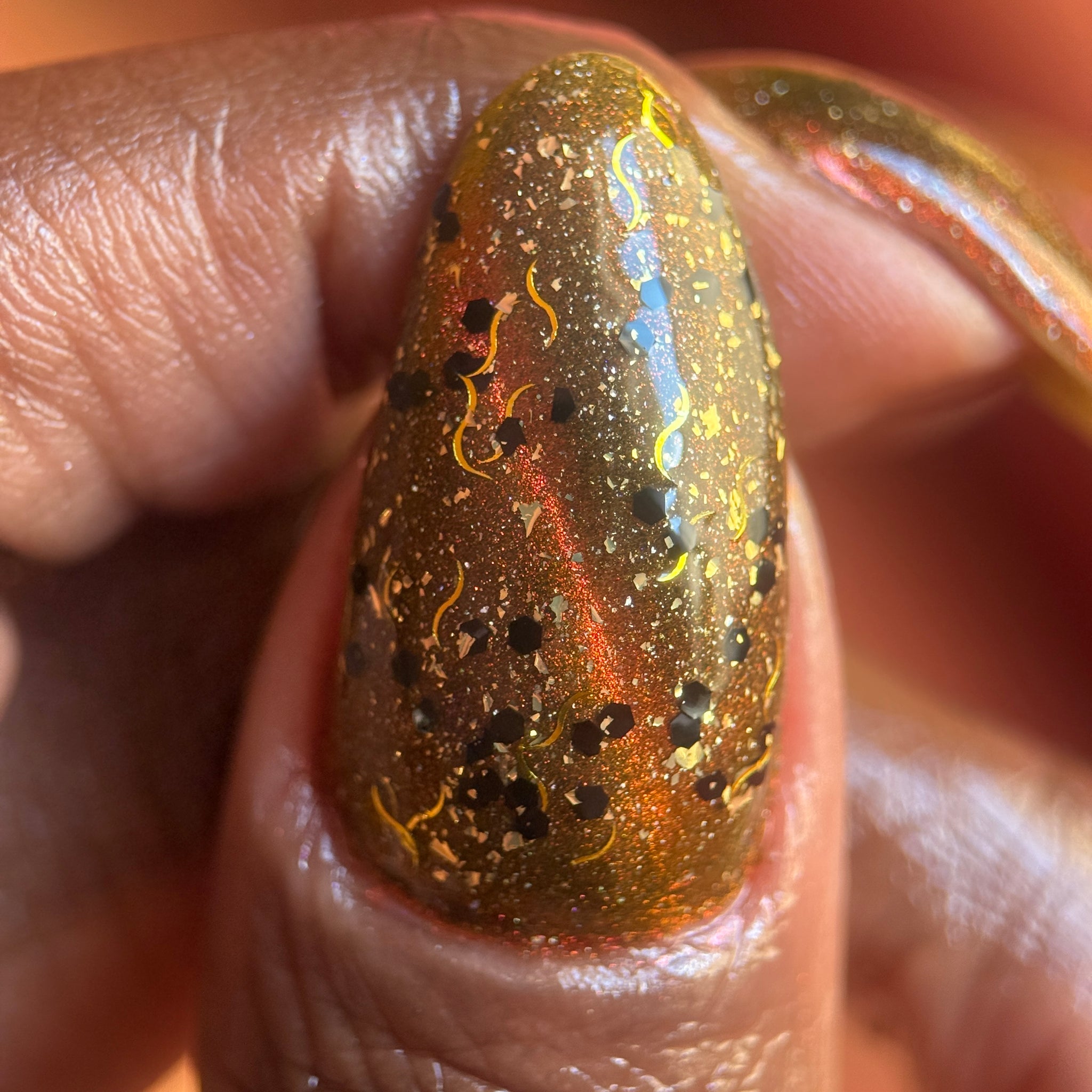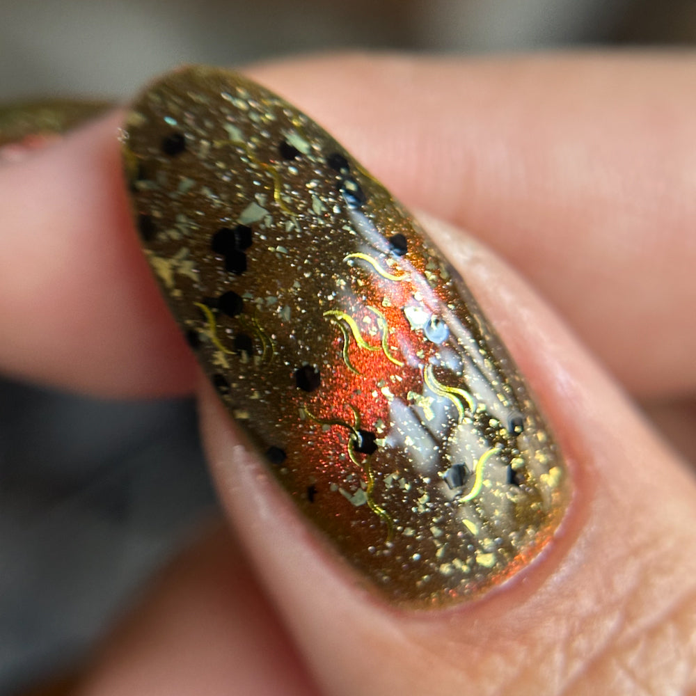 "Savanna Sunset" delivers a true spectacle of color with every stroke. Set in a translucent amber base, the magnetic multichrome pigment shifts between orange, red, gold, and green — creating the illusion of a sunset in motion. Holographic pigment and flakes add sparkle and depth to this mesmerizing composition.
