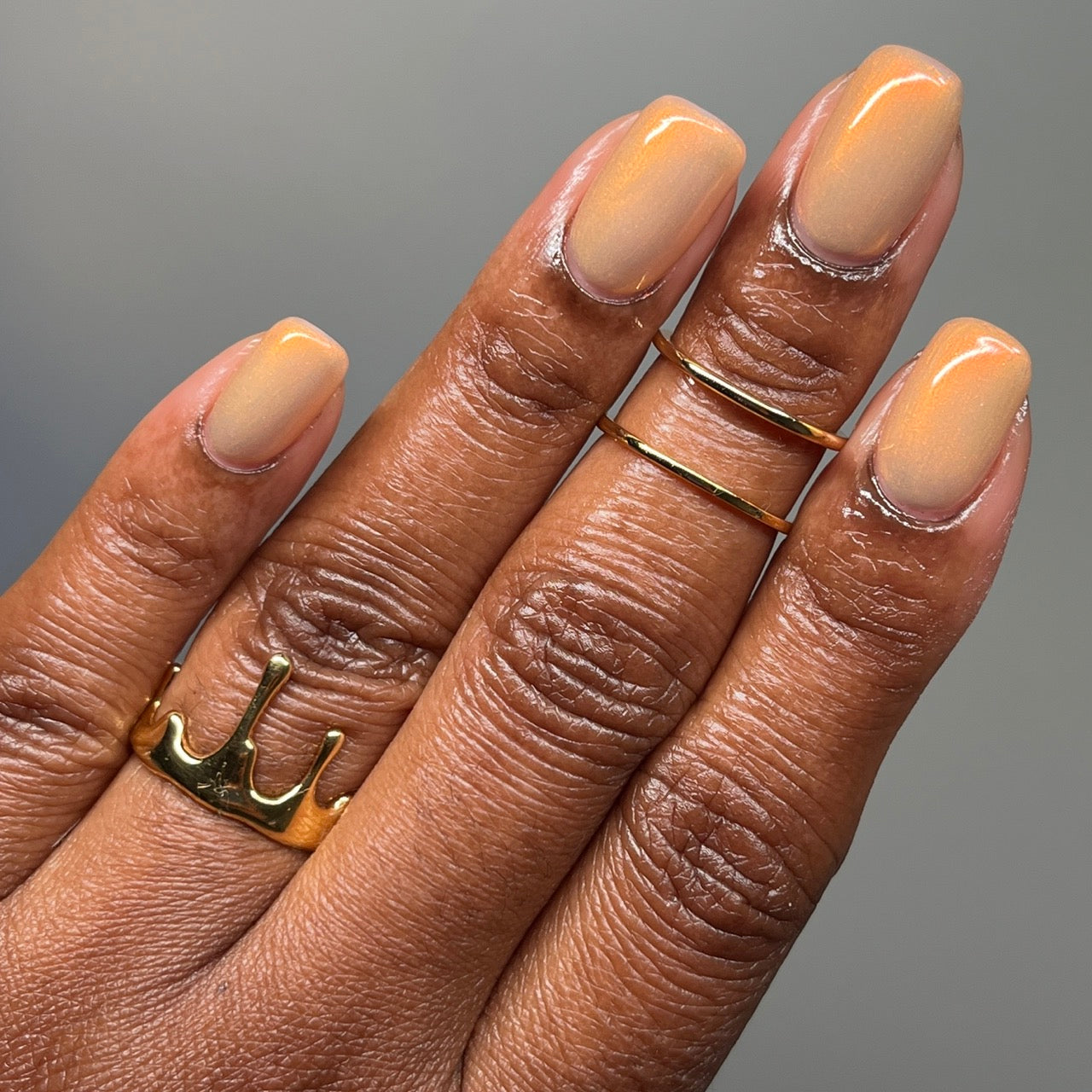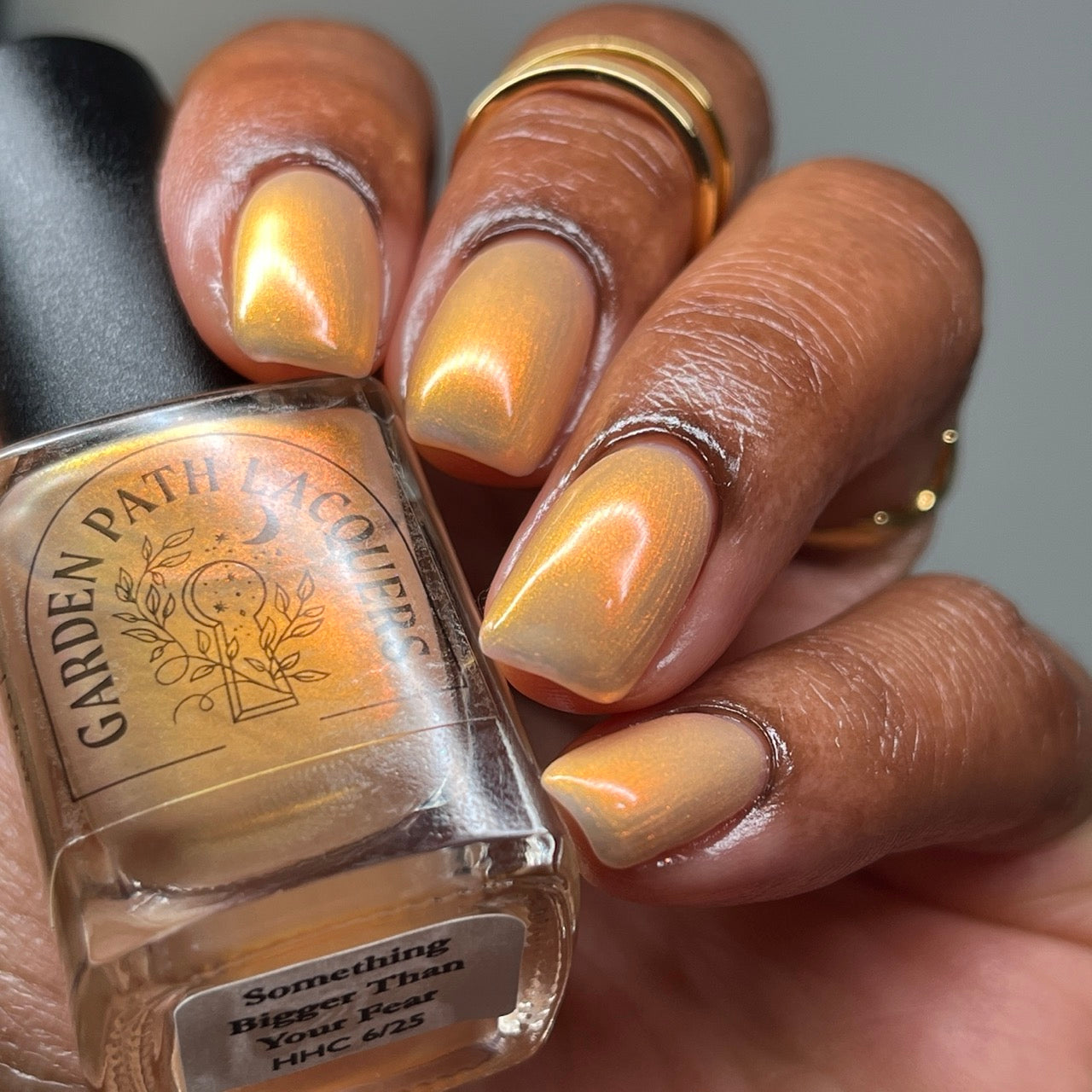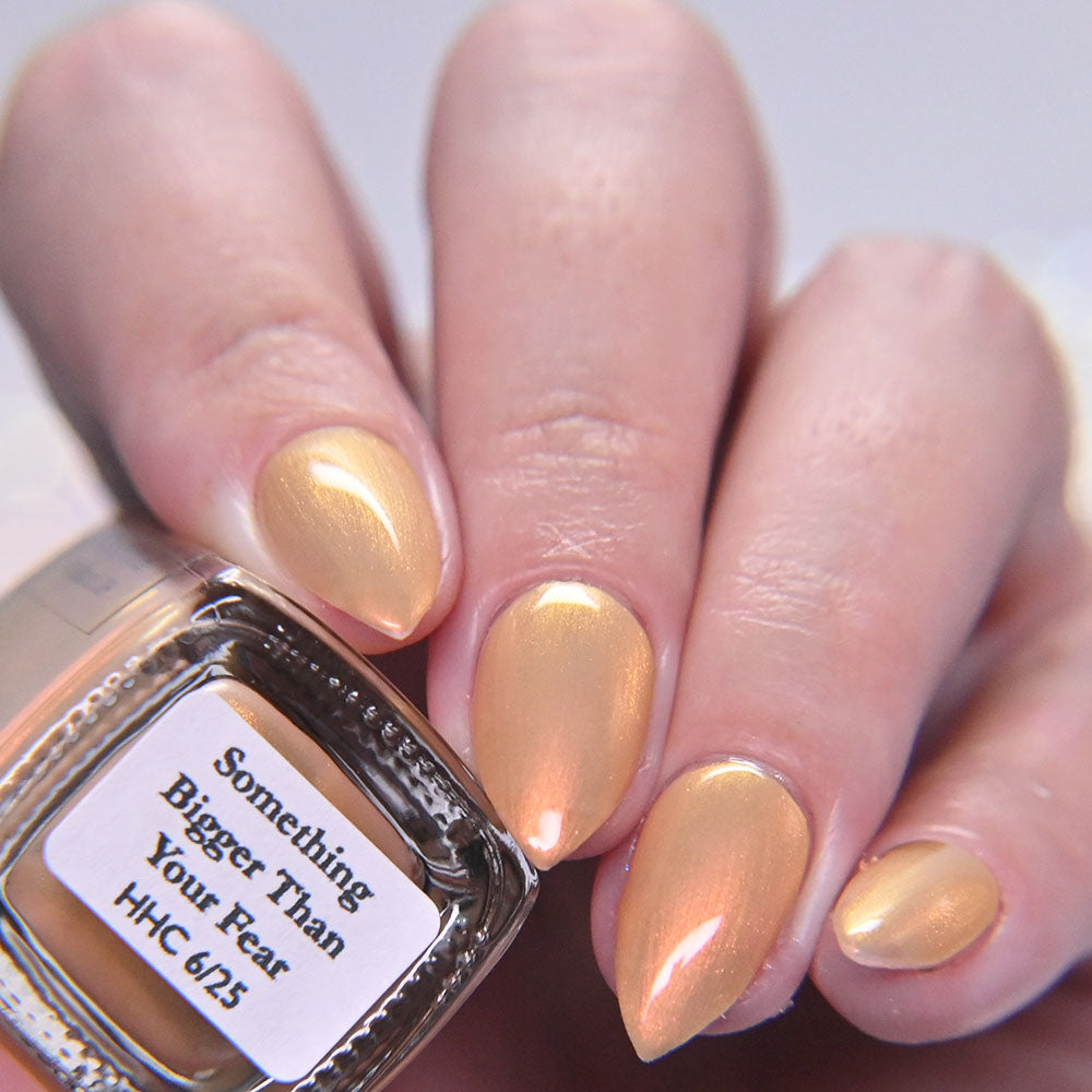 "Something Bigger Than Your Fear" has a shimmer-packed formula and is a tribute to the juicy (but somehow sinister) peaches from the book’s front cover: A peachy crelly filled to the brim with two types of orange-shifting Aurora shimmer.
