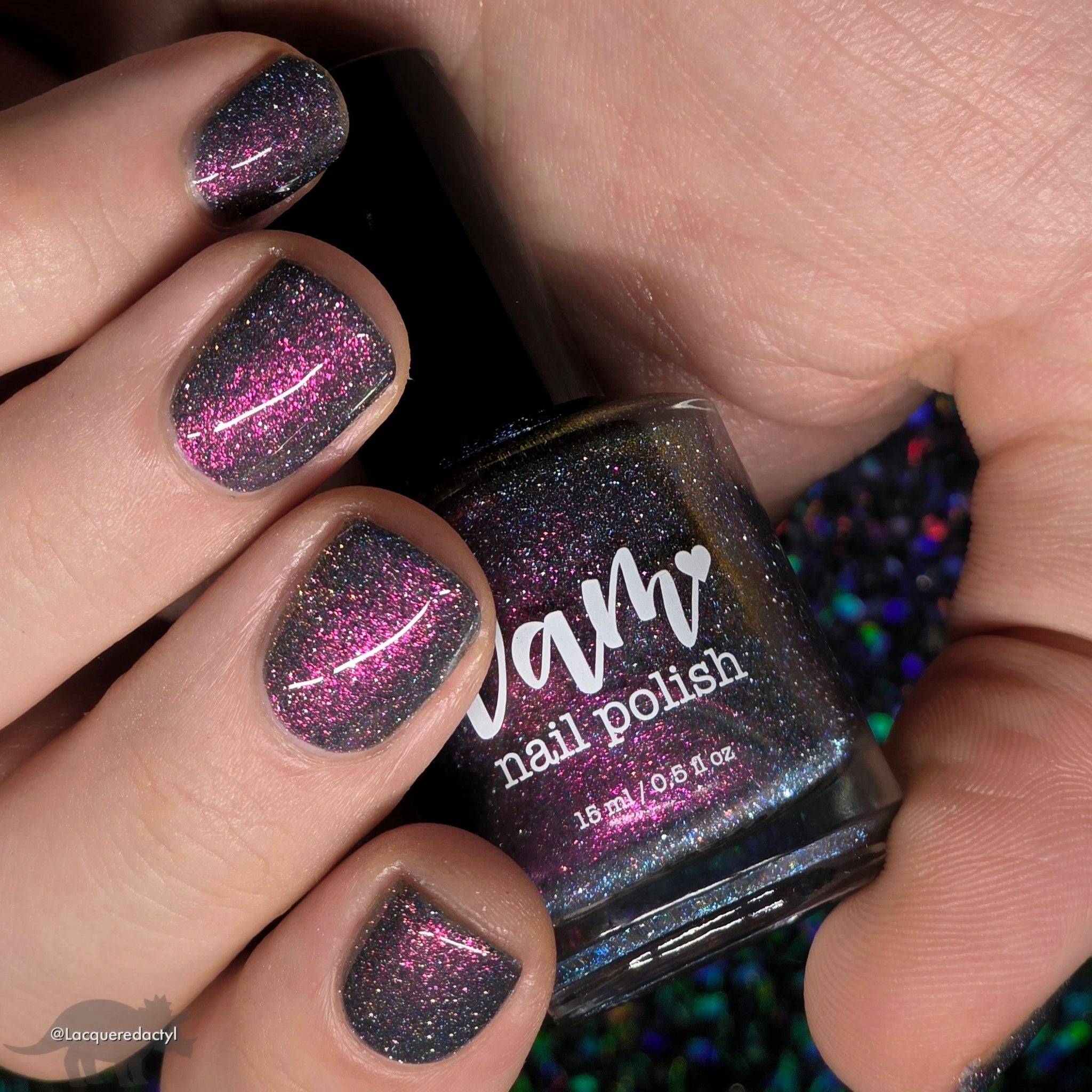 "Jinu" has a black jelly base with pink/gold/green shifting shimmer and blue/teal reflective glitters.