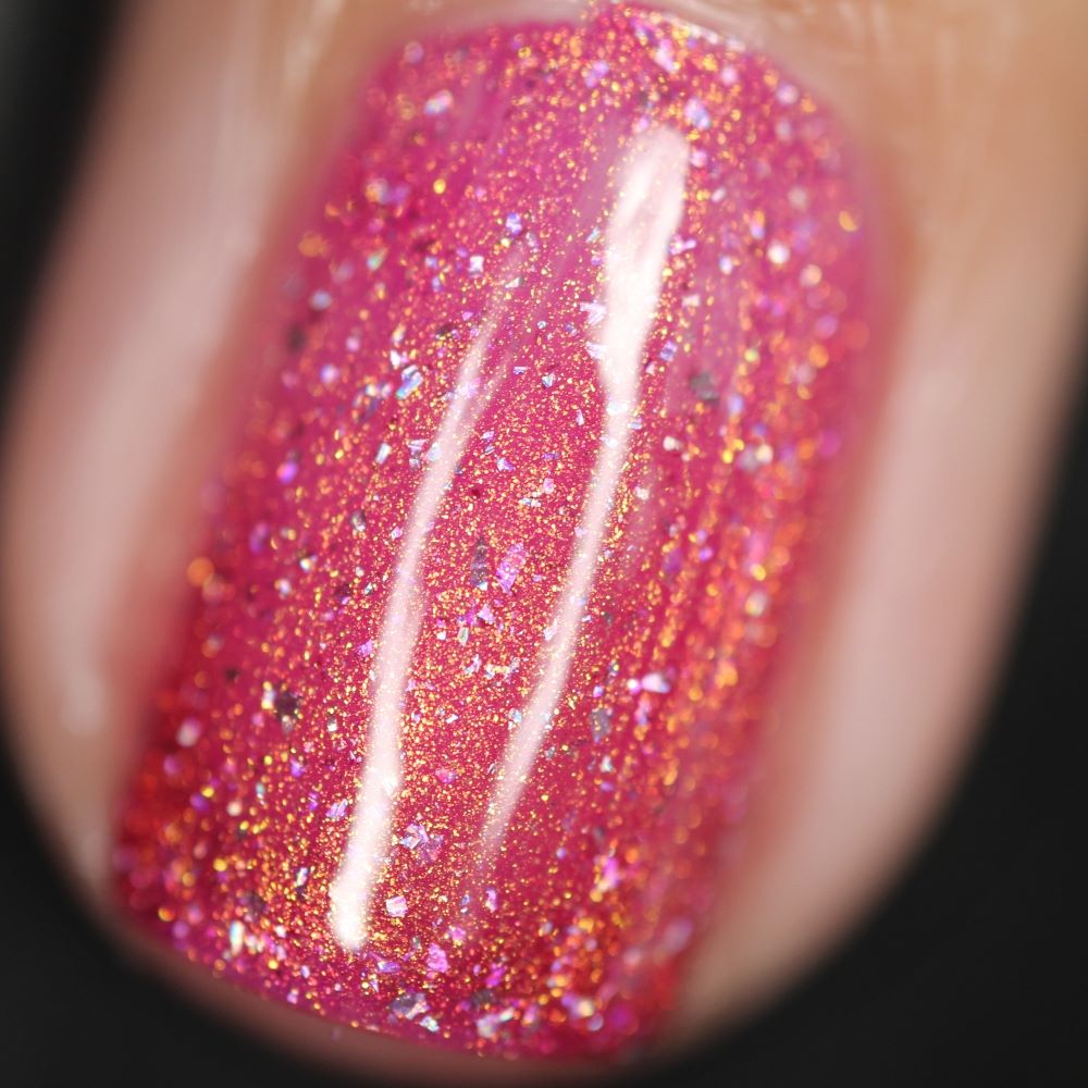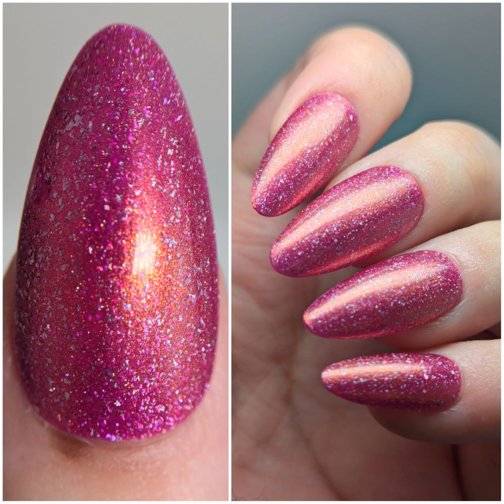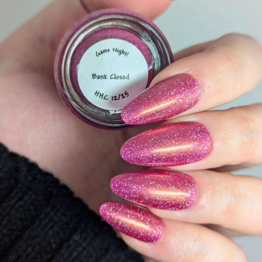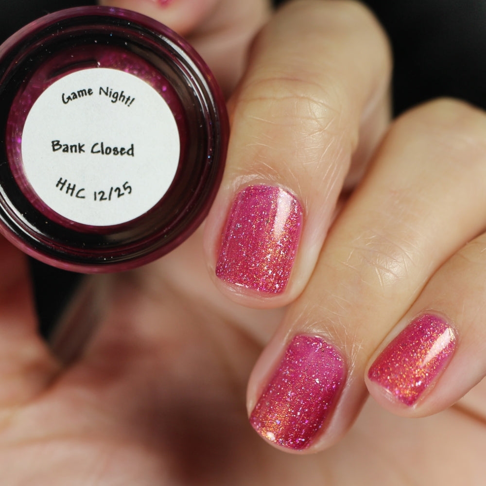 "Bank Closed" has a a bright pink base with a golden-peach shimmer and holo flakes.