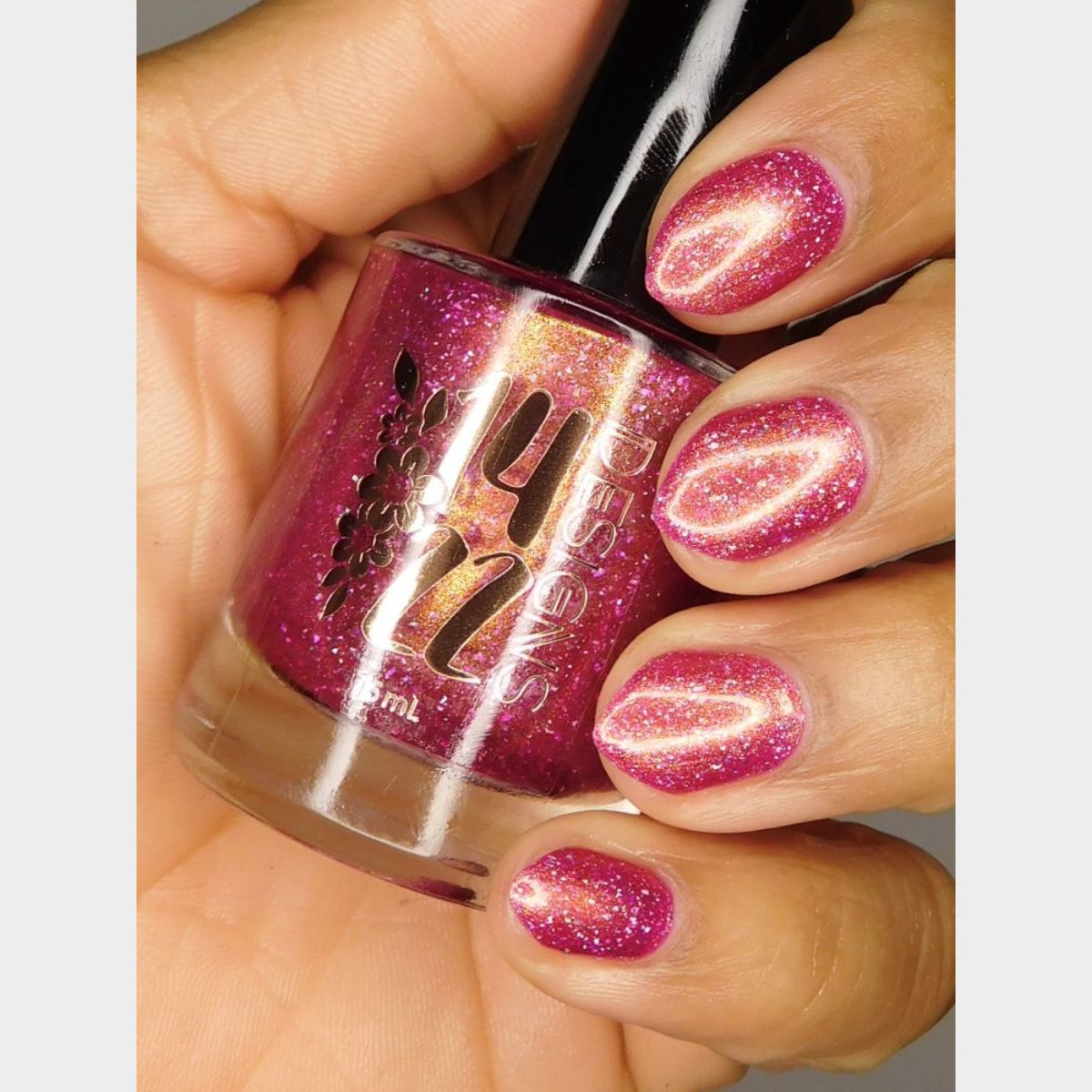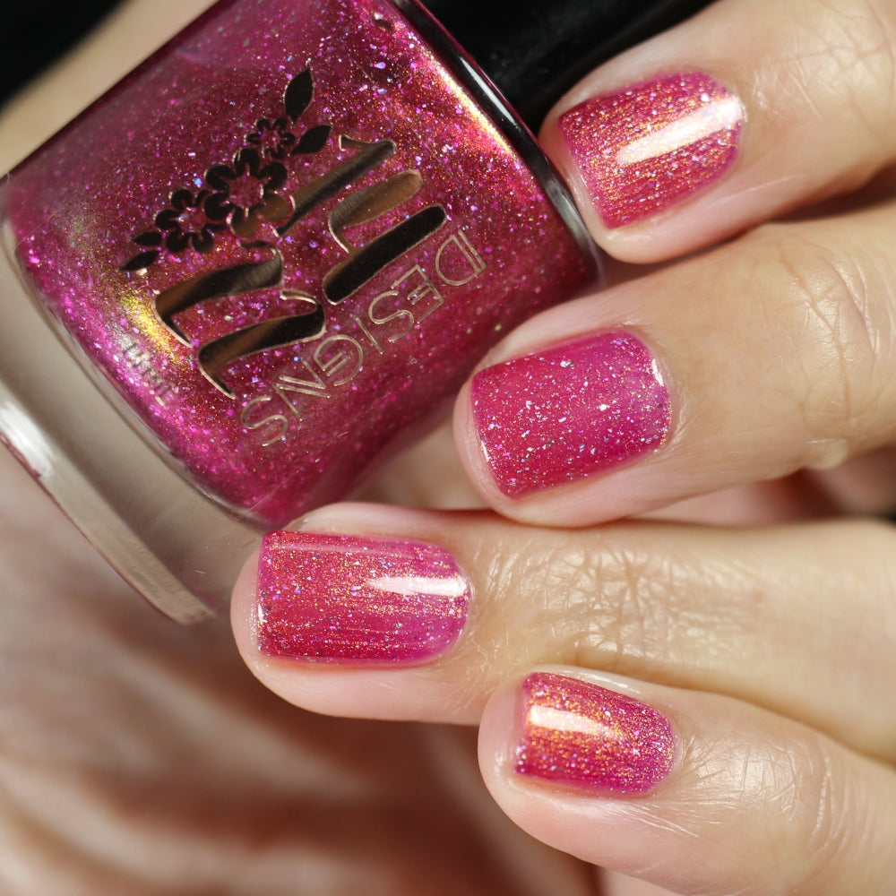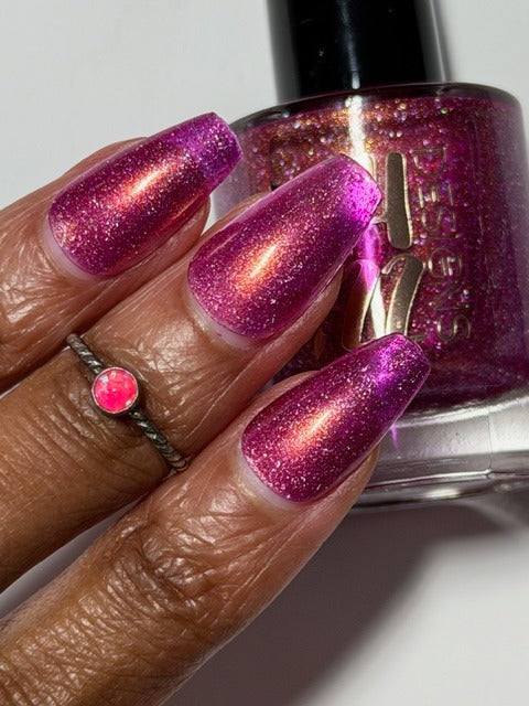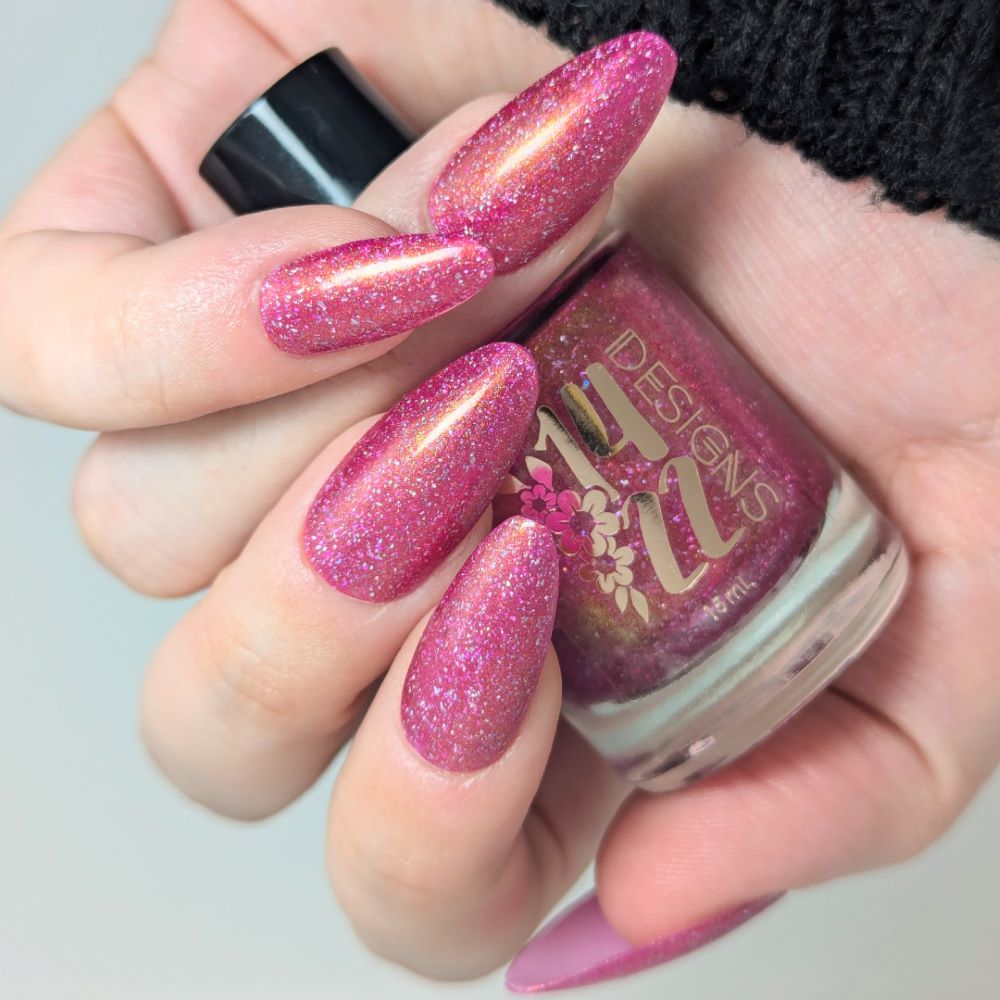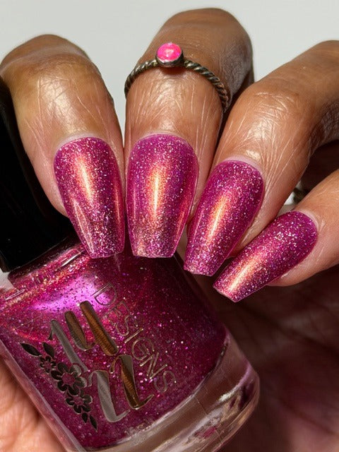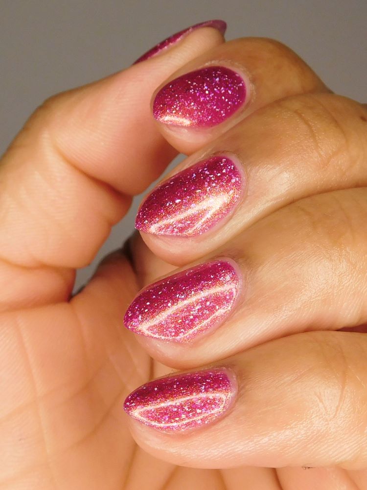 "Bank Closed" has a a bright pink base with a golden-peach shimmer and holo flakes.