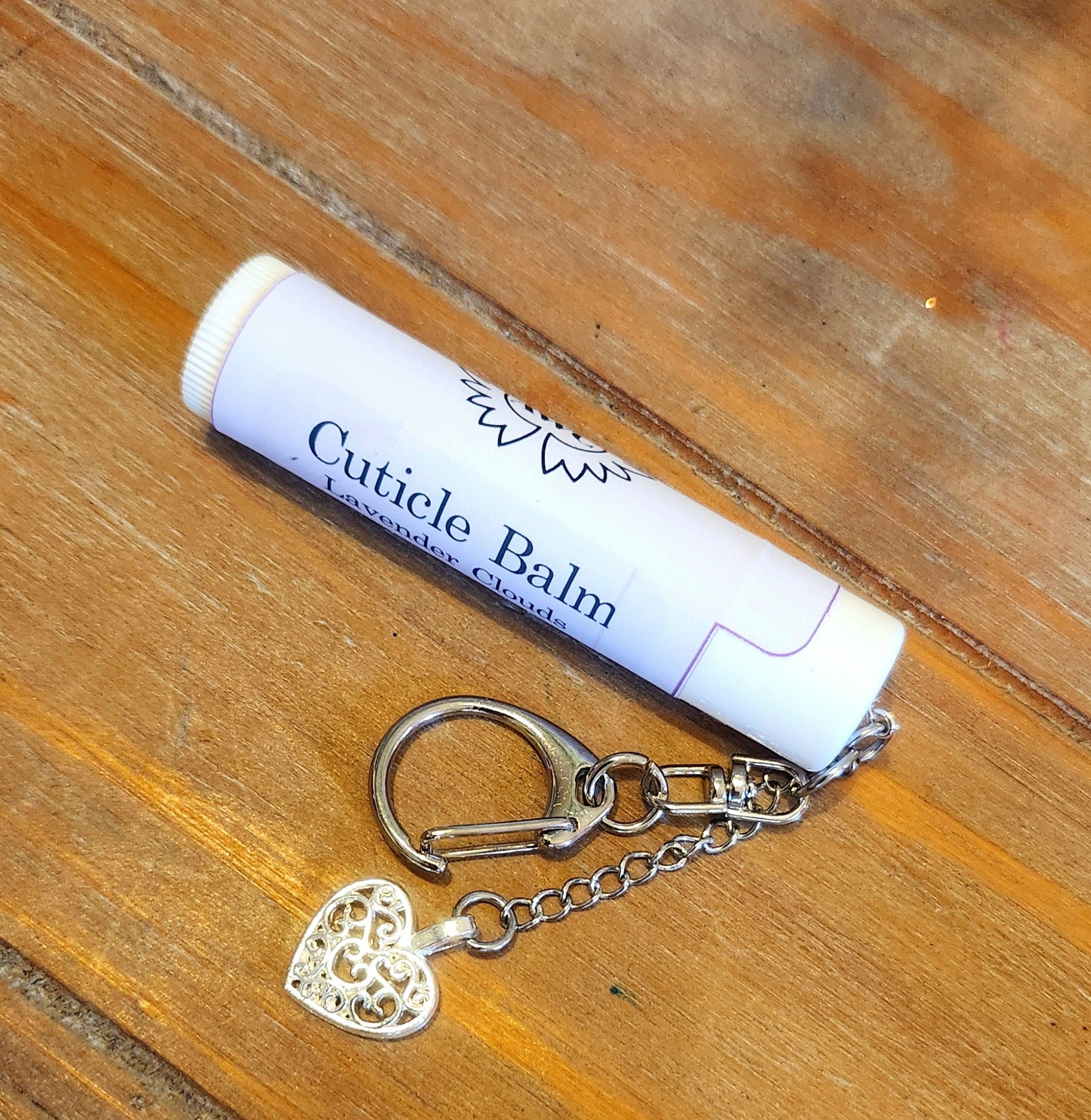 Cuticle balm roll up stick with skin loving ingredients and a lobster clip to keep it easily accessible with your keys, handbag, backpack,lanyard, etc. To make it cute we have added some heart charms and beads.