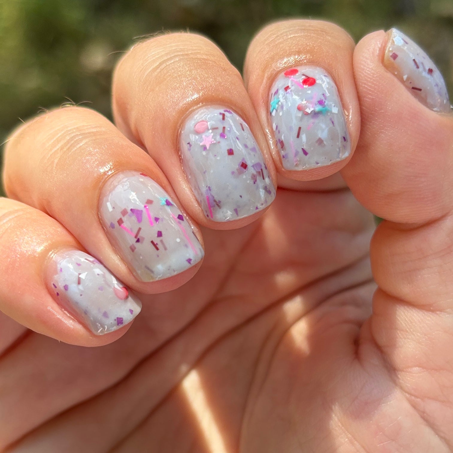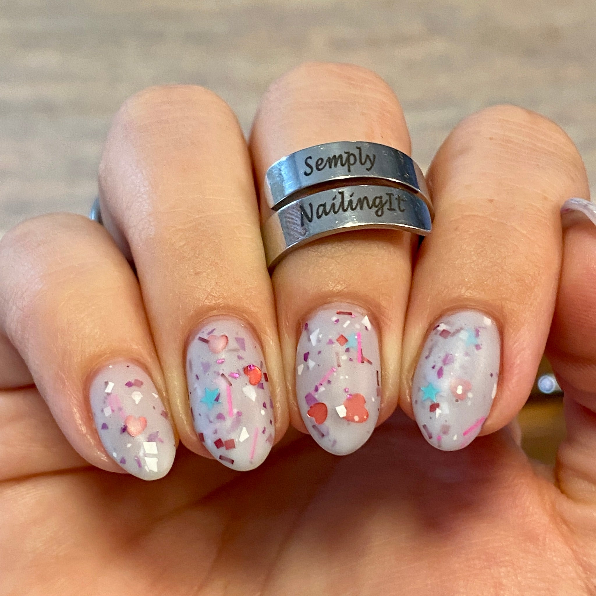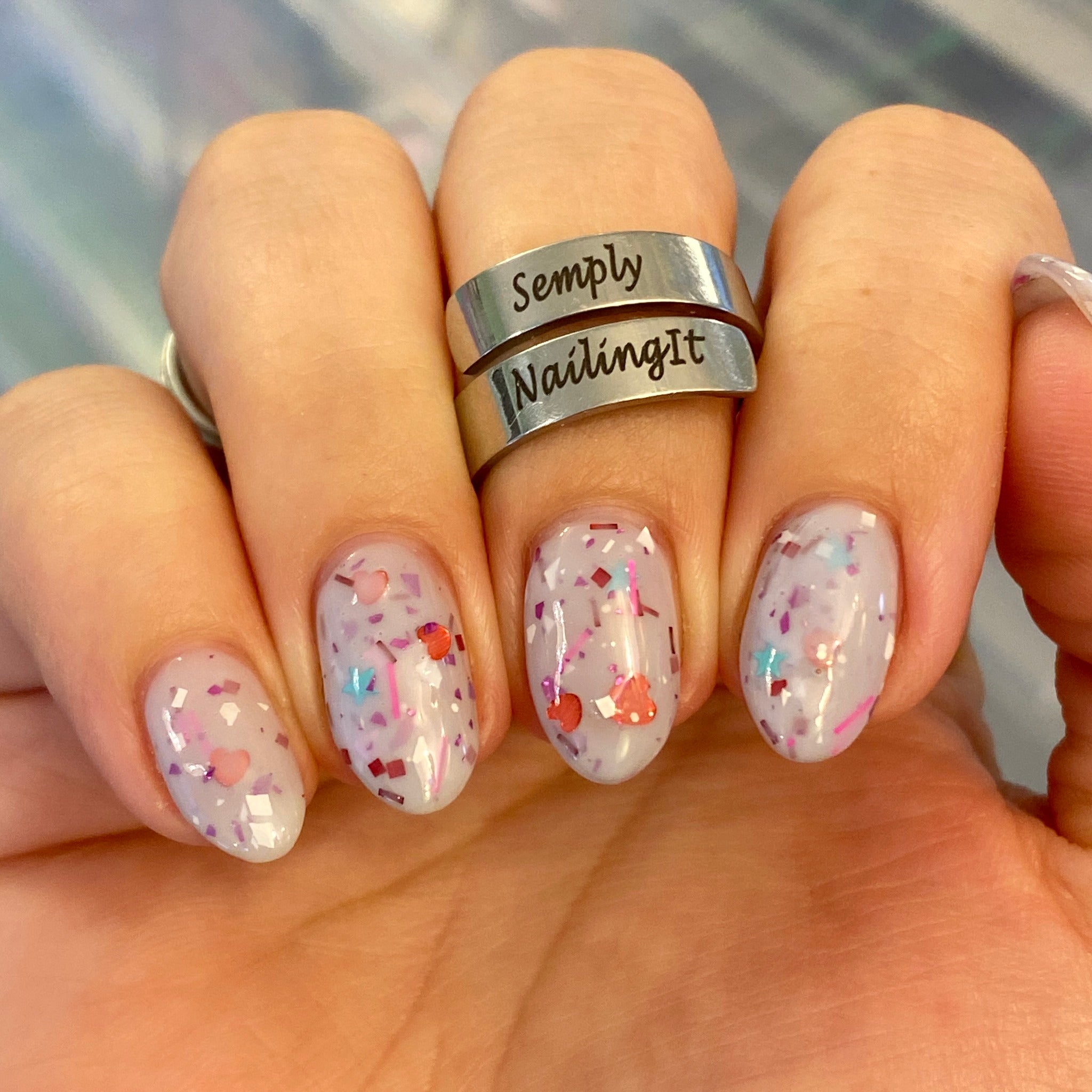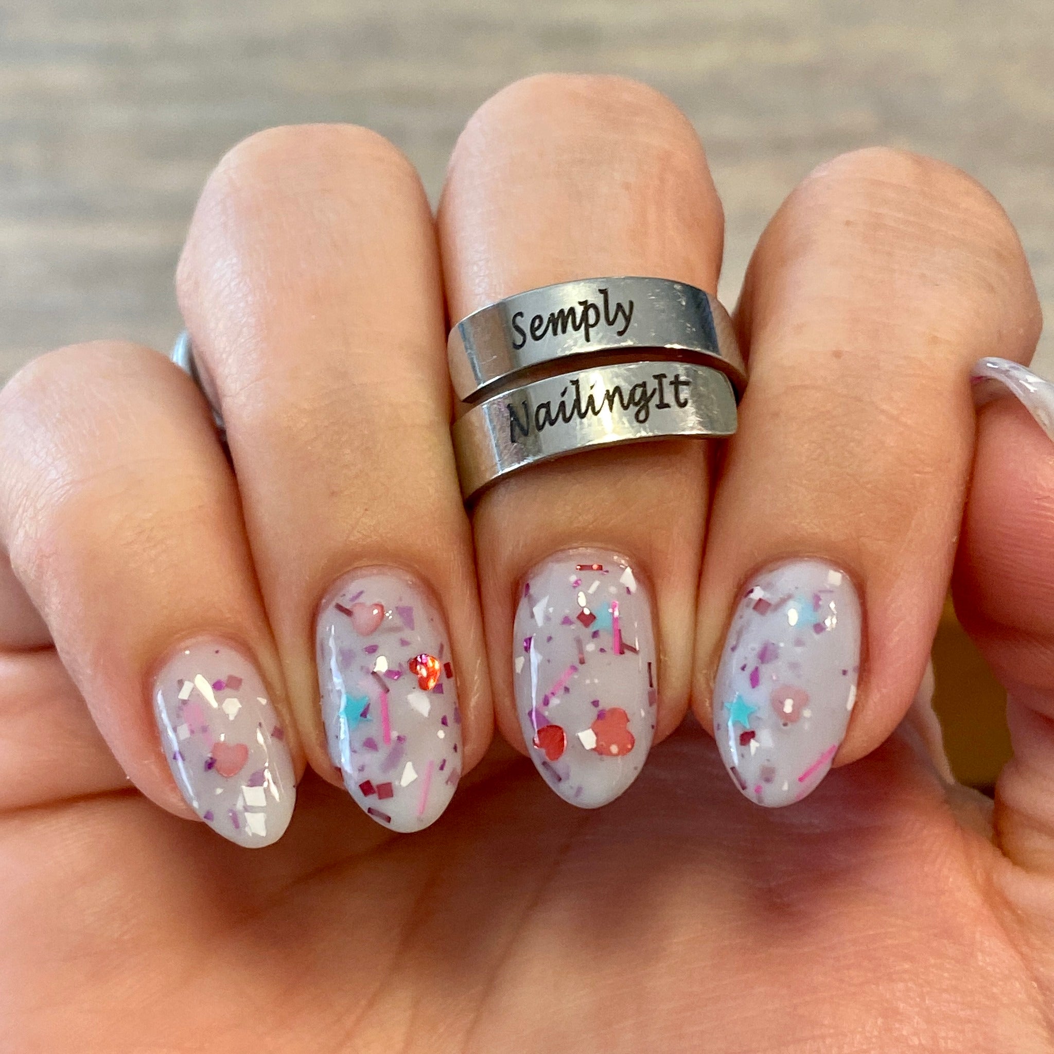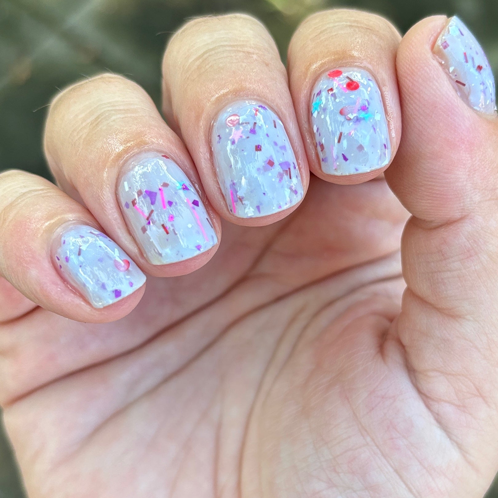 "Kiss and Polish" is a soft periwinkle crelly with pink, white, fuchsia, teal, red, pink and magenta glitter in various shapes and sizes including stars, bars, hearts and shreds.