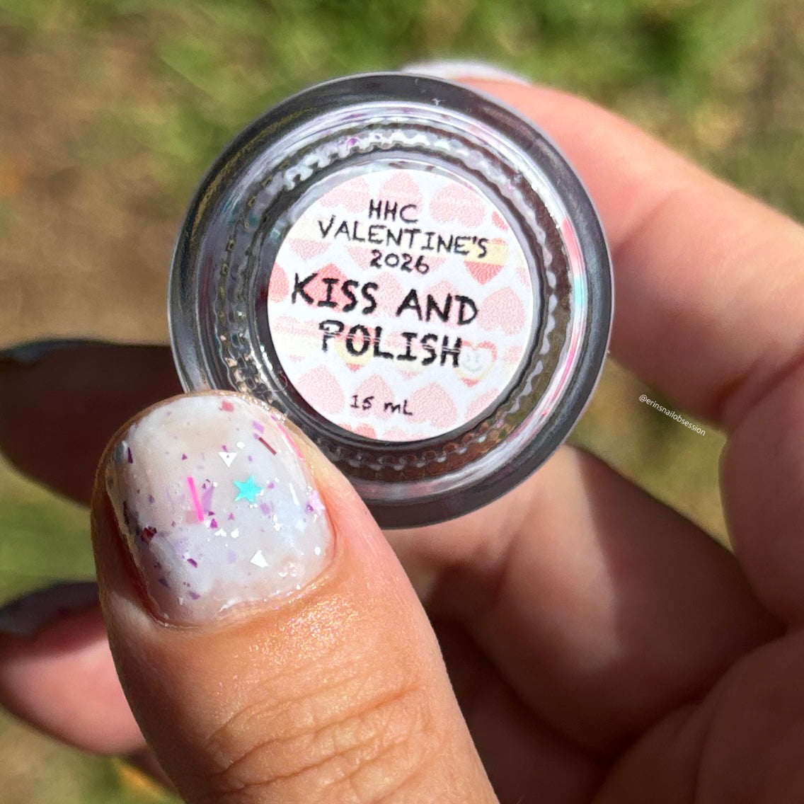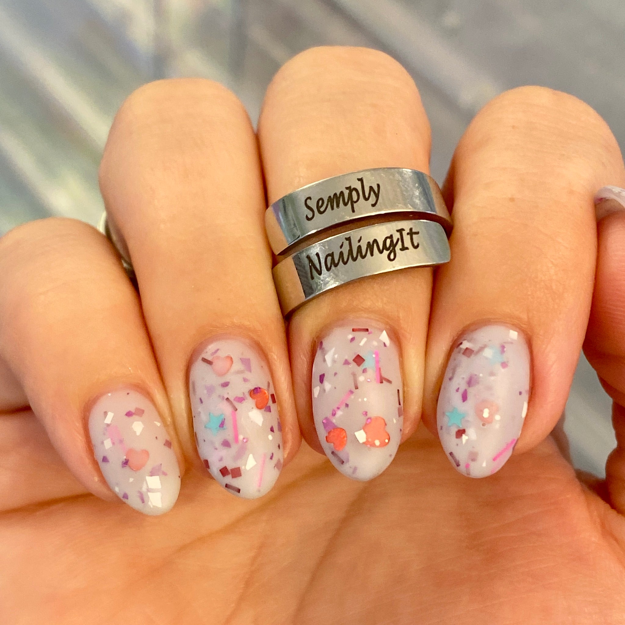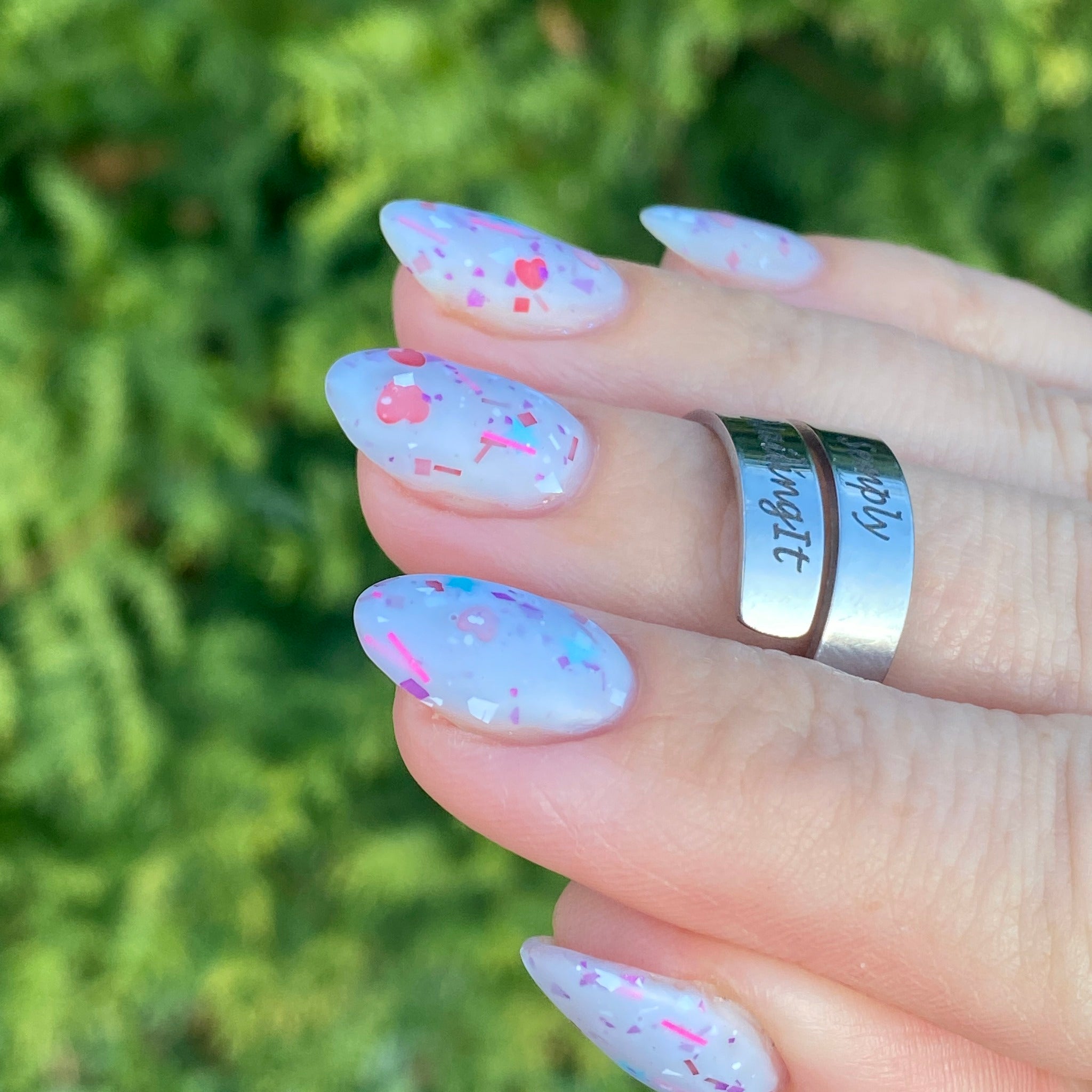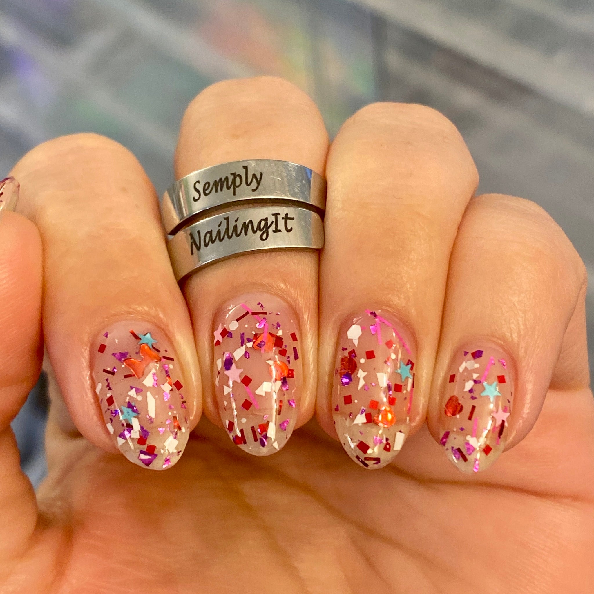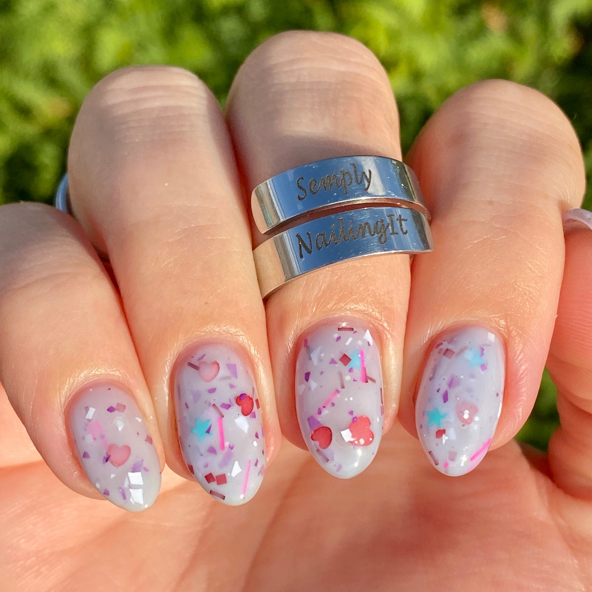 "Kiss and Polish" is a soft periwinkle crelly with pink, white, fuchsia, teal, red, pink and magenta glitter in various shapes and sizes including stars, bars, hearts and shreds.