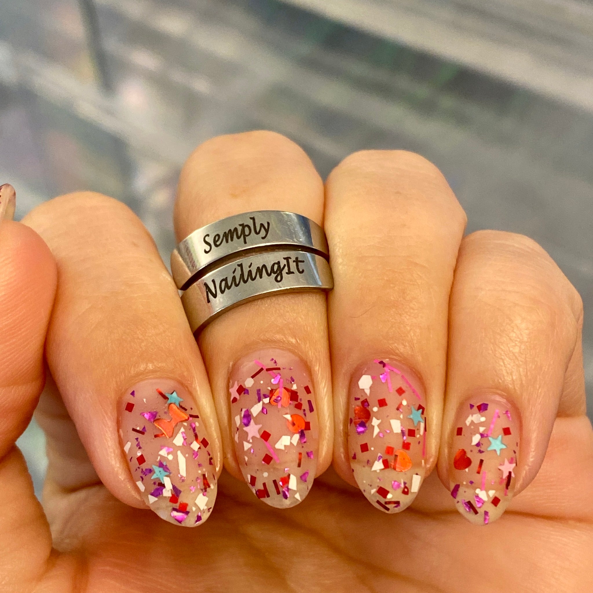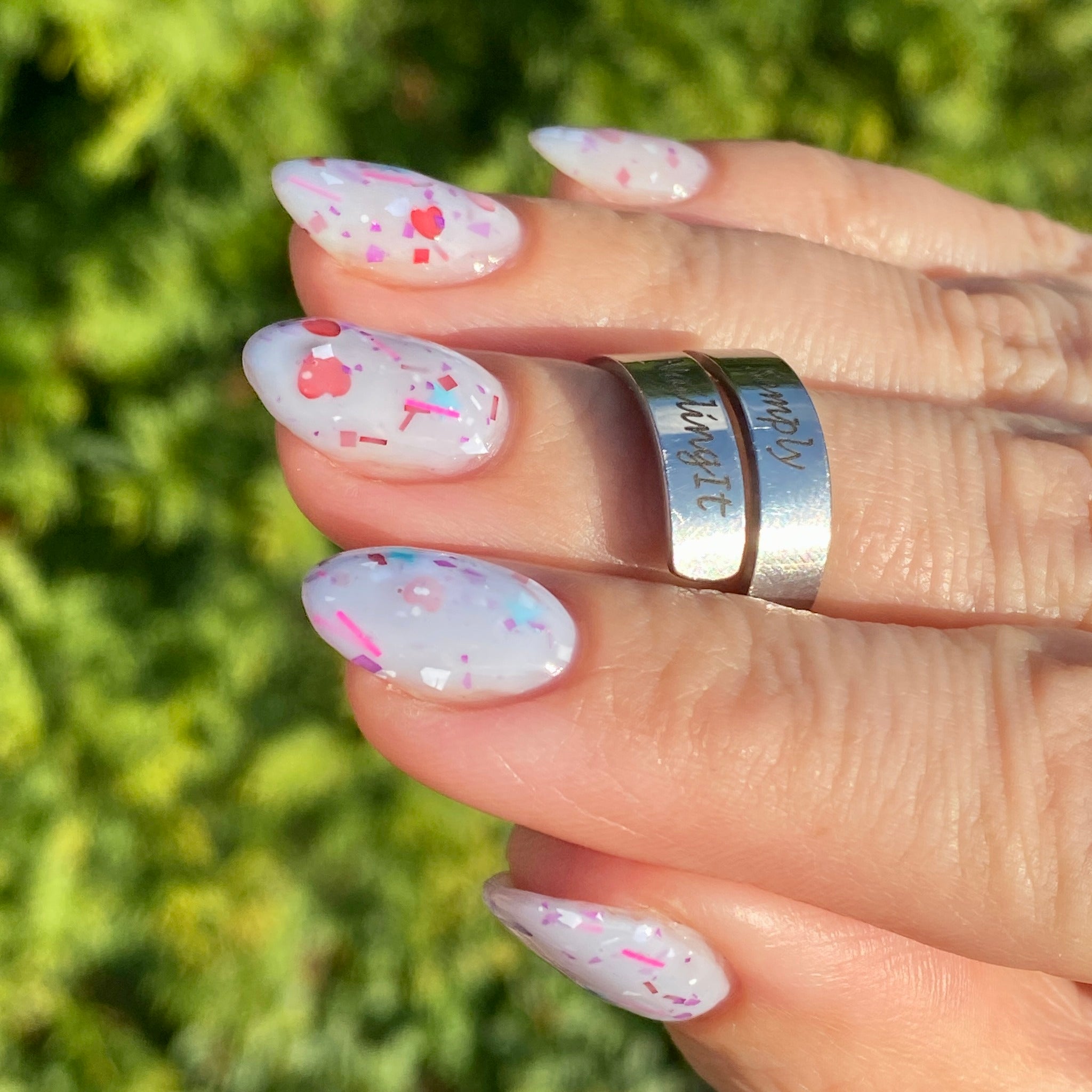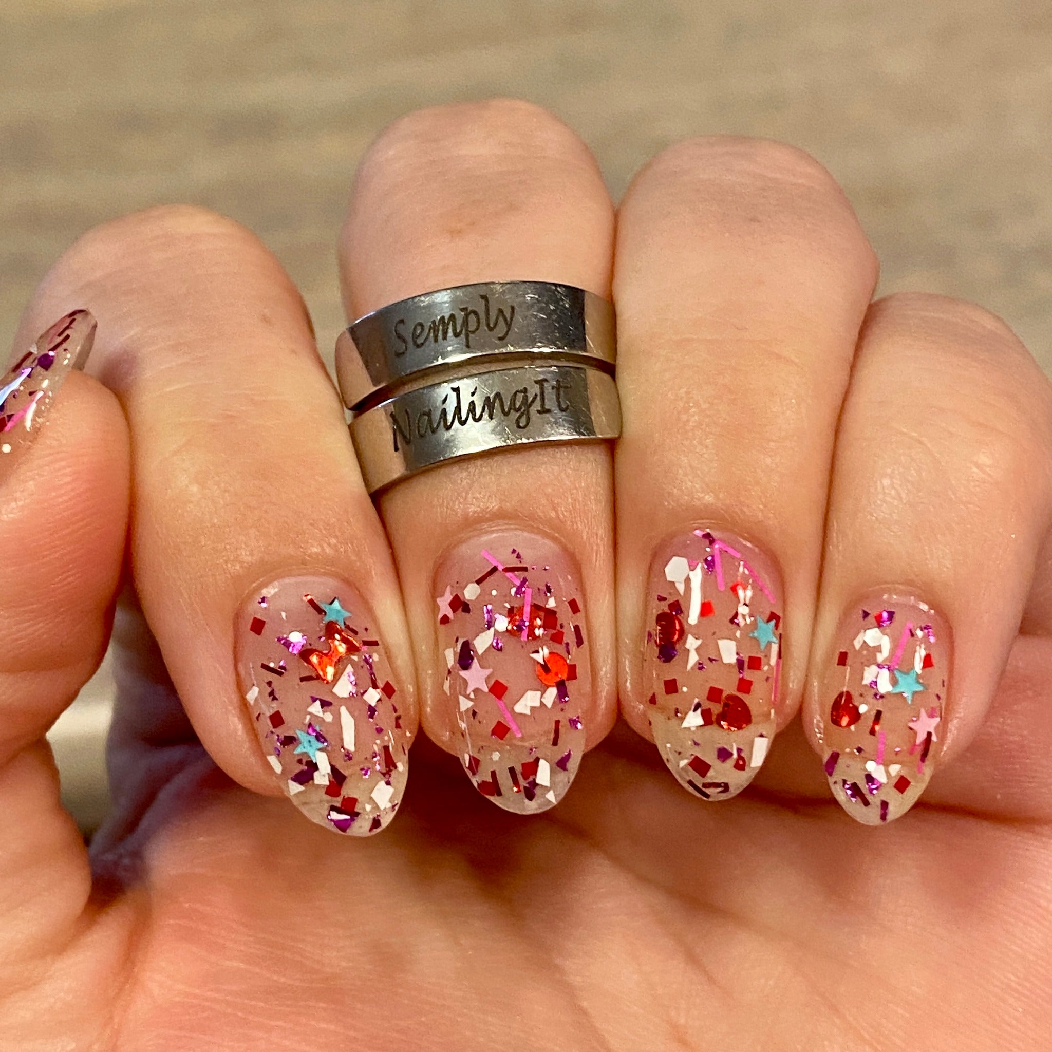 "First Crush" has a (topper) a clear base with pink, white, fuchsia, teal, red, pink and magenta glitter in various shapes and sizes including stars, bars, hearts and shreds.