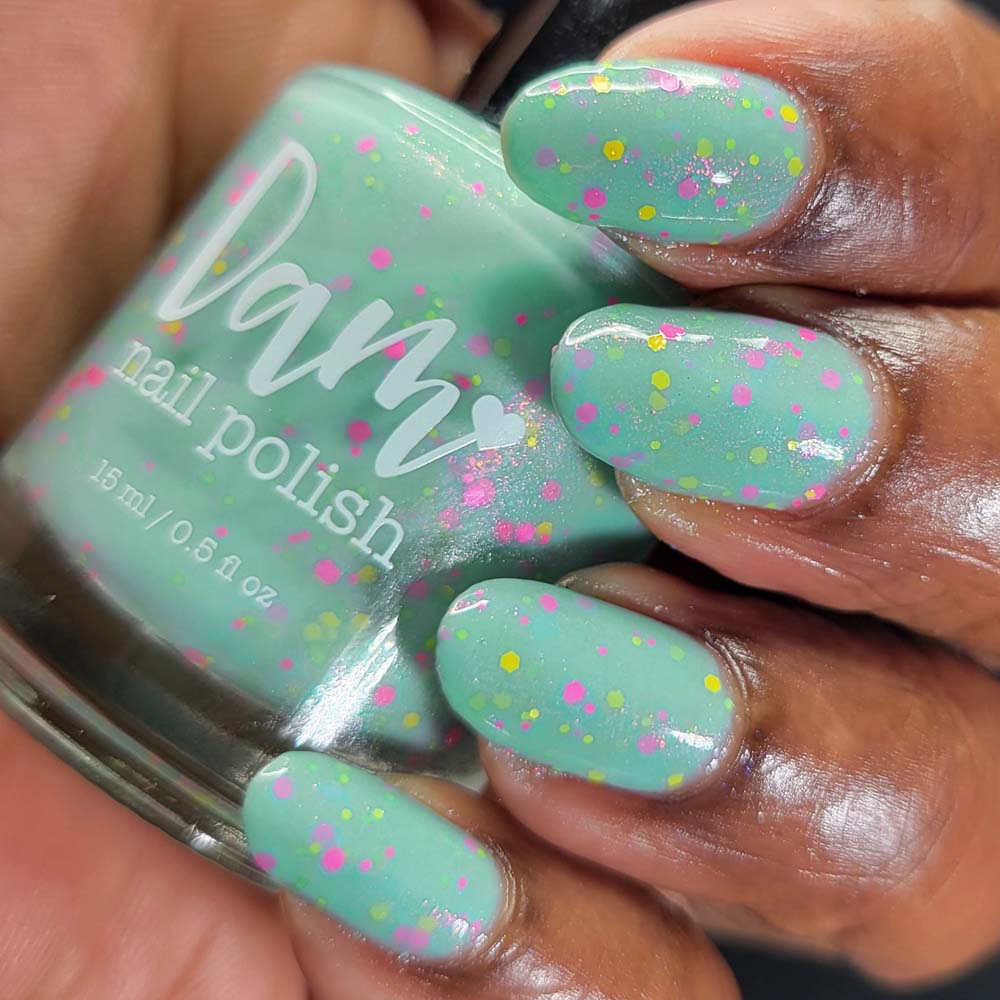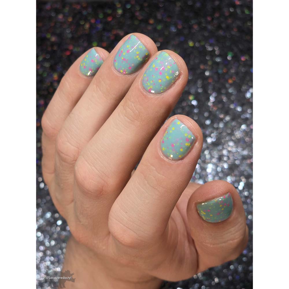 "Abby" is a light green crelly with assorted neon pink and yellow glitters with a dusting of pink to gold shifting shimmer.