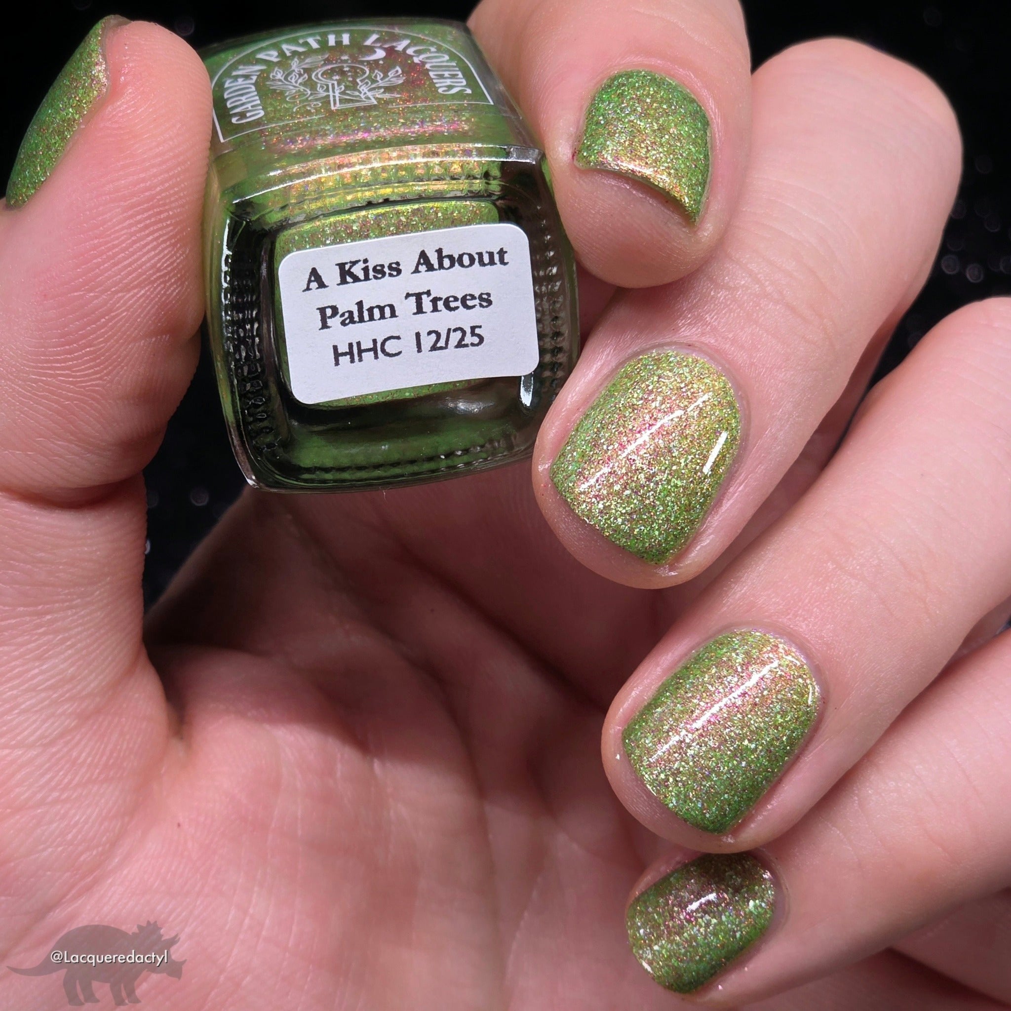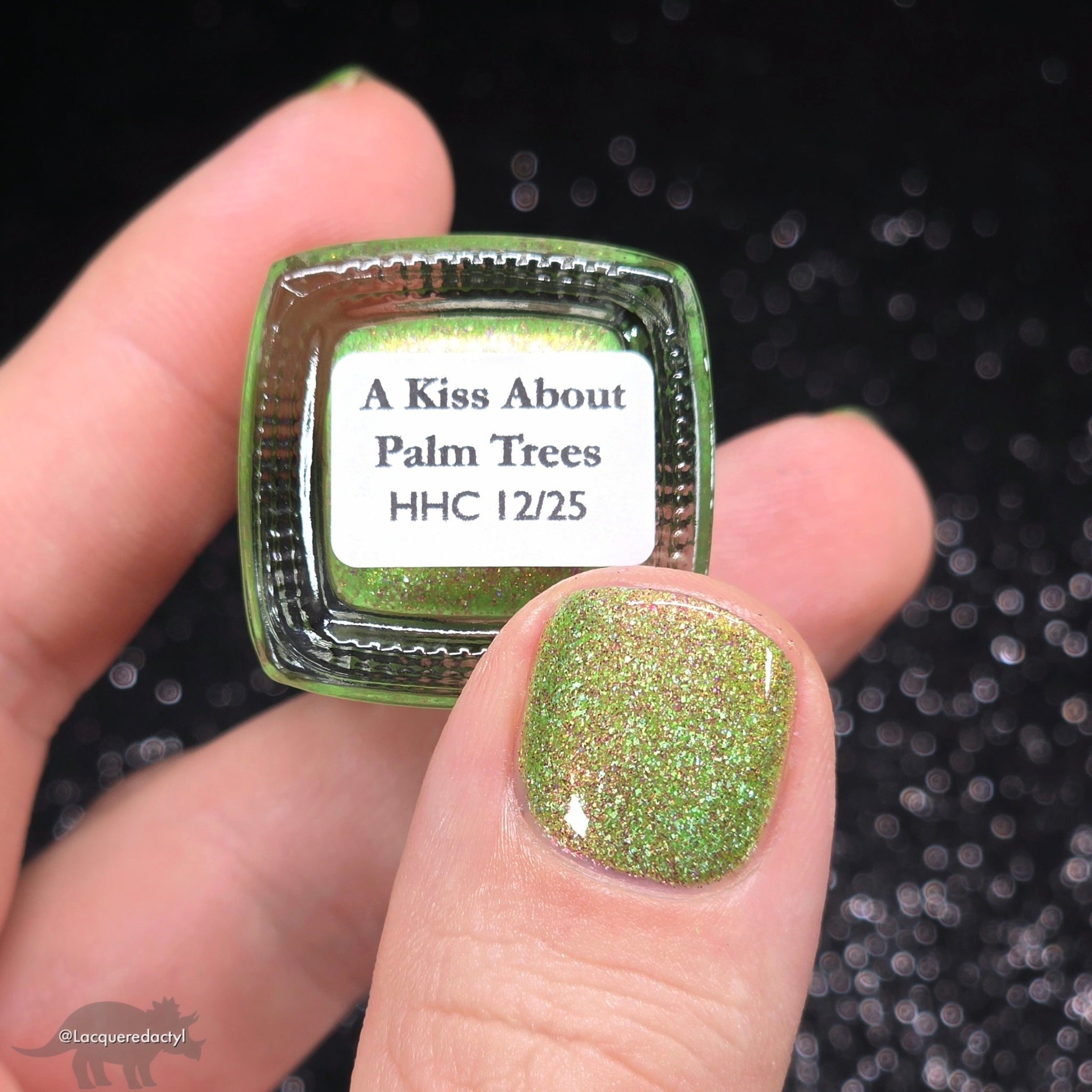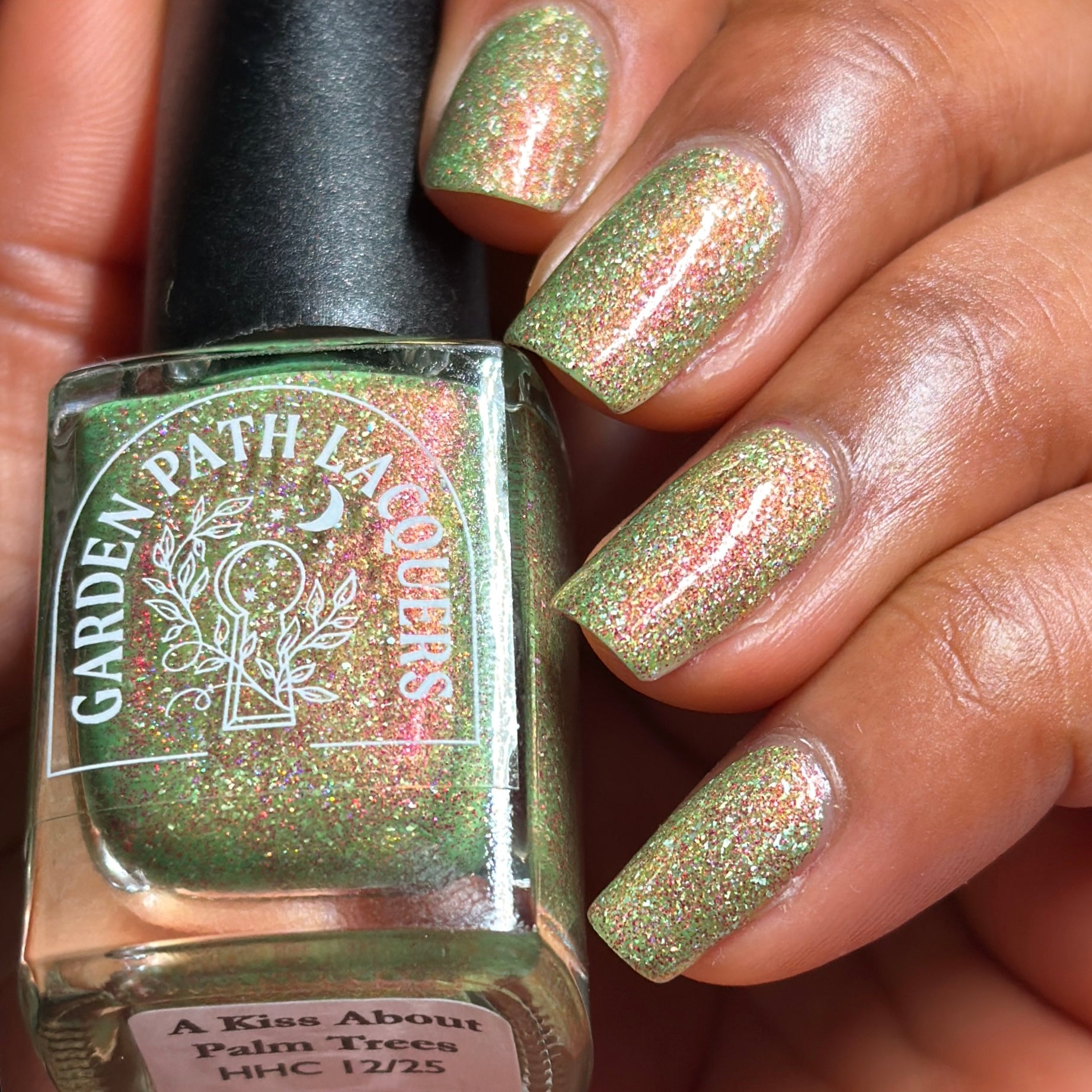 "A Kiss About Palm Trees" has a bright grassy green crelly base accented with pink/gold shifting Aurora shimmer, light pink and fuchsia holographic microglitters, and holographic microflakes.